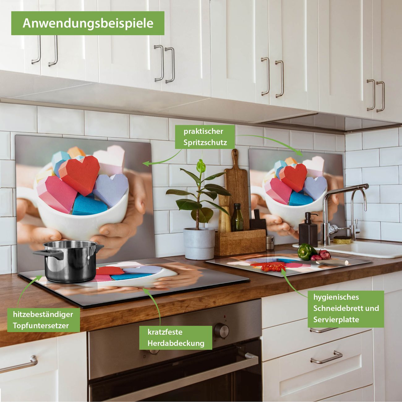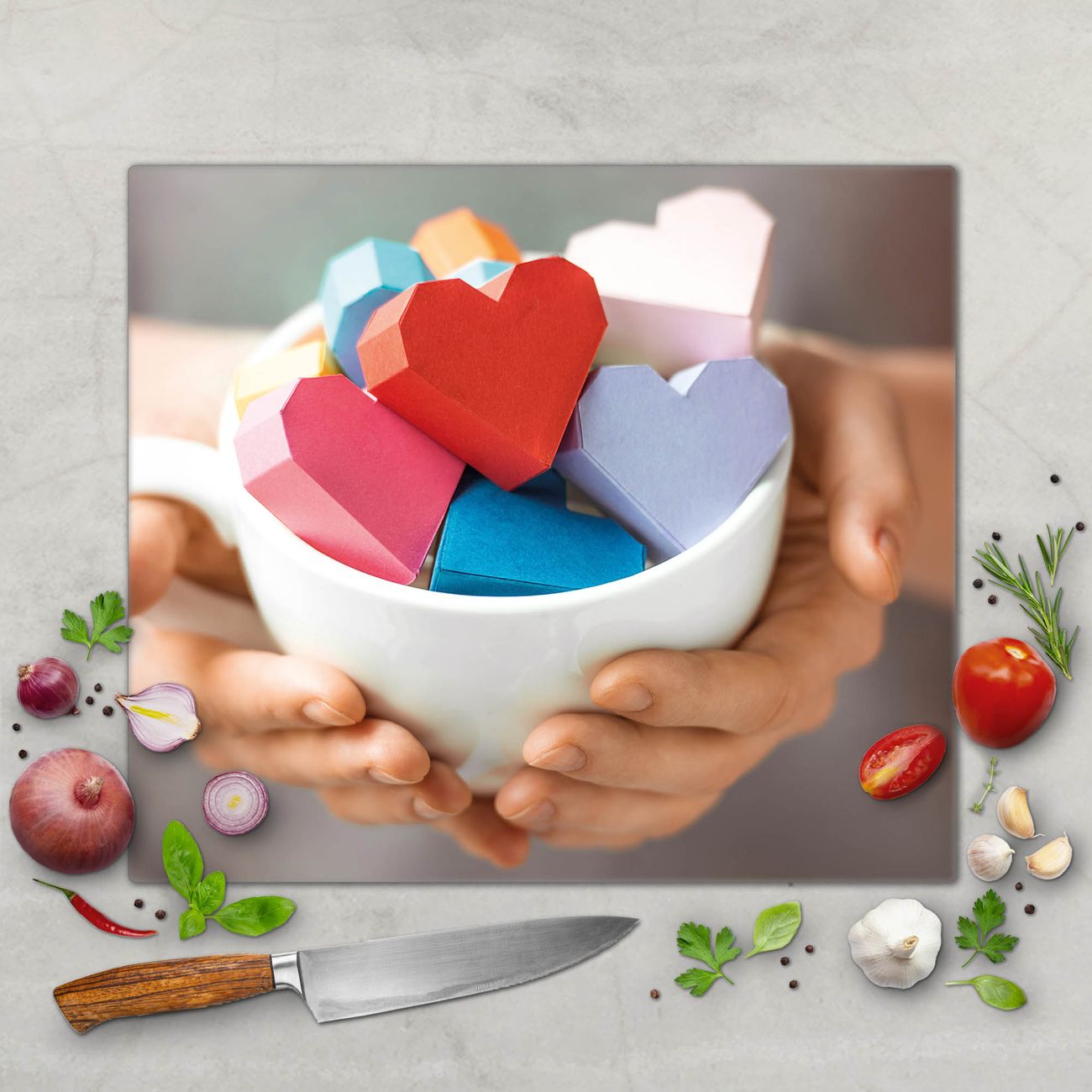 FUNKTION: Das banjado Schneidebrett mit Motiv Tasse voller Herzen ist groß und rutschfest und damit ideal für Ihre Küche. Besonders praktisch. Das Schneidebrett ist vielseitig einsetzbar: ob als Spritzschutz hinter dem Herd für Ihre Küche oder als Glas Schneidebrett als hygienische und geruchsneutrale Unterlage. Sie können ebenfalls heiße Töpfe und Pfannen bis 100°C auf der Herdplattenabdeckung abstellen. Sie erhalten ein Multitalent für Ihre Küche. QUALITÄT: Die Schneideplatte Glas besteht aus hochwertigem, gehärtetem und hitzebeständigem Glas. Wählen Sie aus einem unserer zahlreichen Motive das passende Design für Ihre Küche aus. DETAILS: Das Schneidebrett Glas groß ist in verschiedenen Größen verfügbar. Sie erhalten separate Gumminoppen damit Ihr großes Schneidebrett rutschfest in der Küche steht. VIELSEITIG: Das Schneidebrett modern ist ein Allrounder - als Schneideunterlage Küche direkt auf dem Herd oder separat und als Spritzschutz an der Wand aufgestellt - ein praktisches Küchenutensil. BANJADO: Auf Wunsch fertigen wir das Glas Schneide Brett auch als Sondergröße an. Mehrteilige Platten sind auch möglich. Kontaktieren Sie uns gern für eine Spezialanfertigung Ihrer Glasplatte Küche.