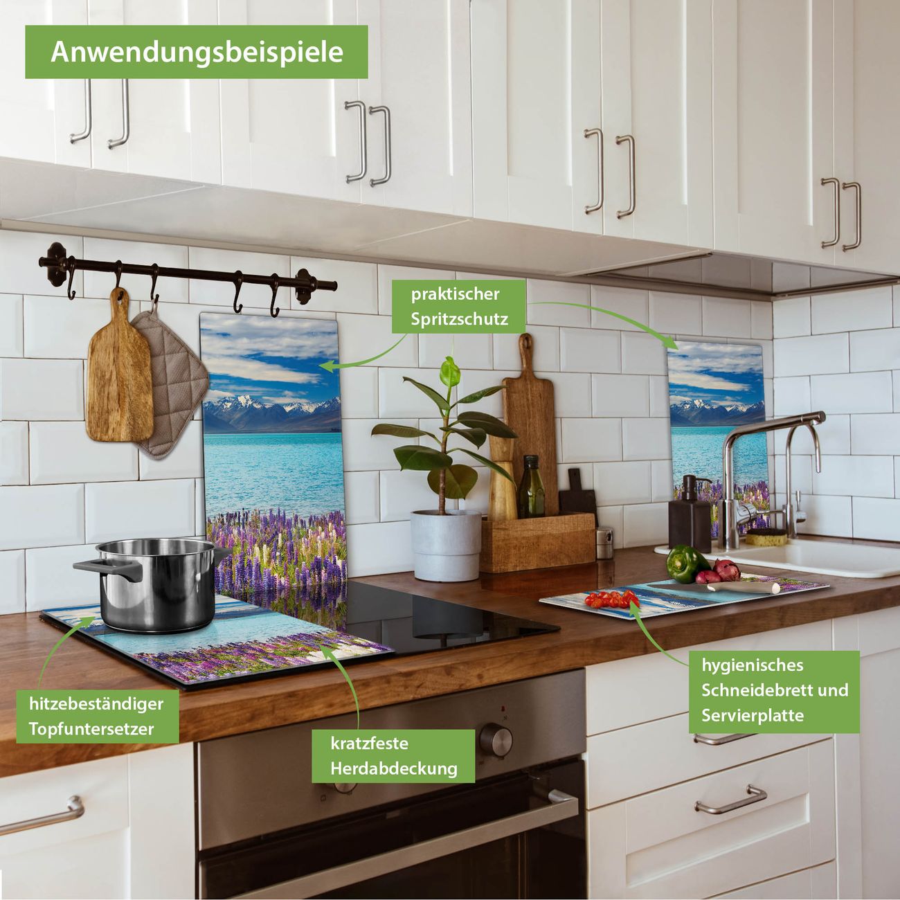 FUNKTION: Das banjado Schneidebrett mit Motiv Tekapo See ist groß und rutschfest und damit ideal für Ihre Küche. Besonders praktisch. Das Schneidebrett ist vielseitig einsetzbar: ob als Spritzschutz hinter dem Herd für Ihre Küche oder als Glas Schneidebrett als hygienische und geruchsneutrale Unterlage. Sie können ebenfalls heiße Töpfe und Pfannen bis 100°C auf der Herdplattenabdeckung abstellen. Sie erhalten ein Multitalent für Ihre Küche. QUALITÄT: Die Schneideplatte Glas besteht aus hochwertigem, gehärtetem und hitzebeständigem Glas. Wählen Sie aus einem unserer zahlreichen Motive das passende Design für Ihre Küche aus. DETAILS: Das Schneidebrett Glas groß ist in verschiedenen Größen verfügbar. Sie erhalten separate Gumminoppen damit Ihr großes Schneidebrett rutschfest in der Küche steht. VIELSEITIG: Das Schneidebrett modern ist ein Allrounder - als Schneideunterlage Küche direkt auf dem Herd oder separat und als Spritzschutz an der Wand aufgestellt - ein praktisches Küchenutensil. BANJADO: Auf Wunsch fertigen wir das Glas Schneide Brett auch als Sondergröße an. Mehrteilige Platten sind auch möglich. Kontaktieren Sie uns gern für eine Spezialanfertigung Ihrer Glasplatte Küche.