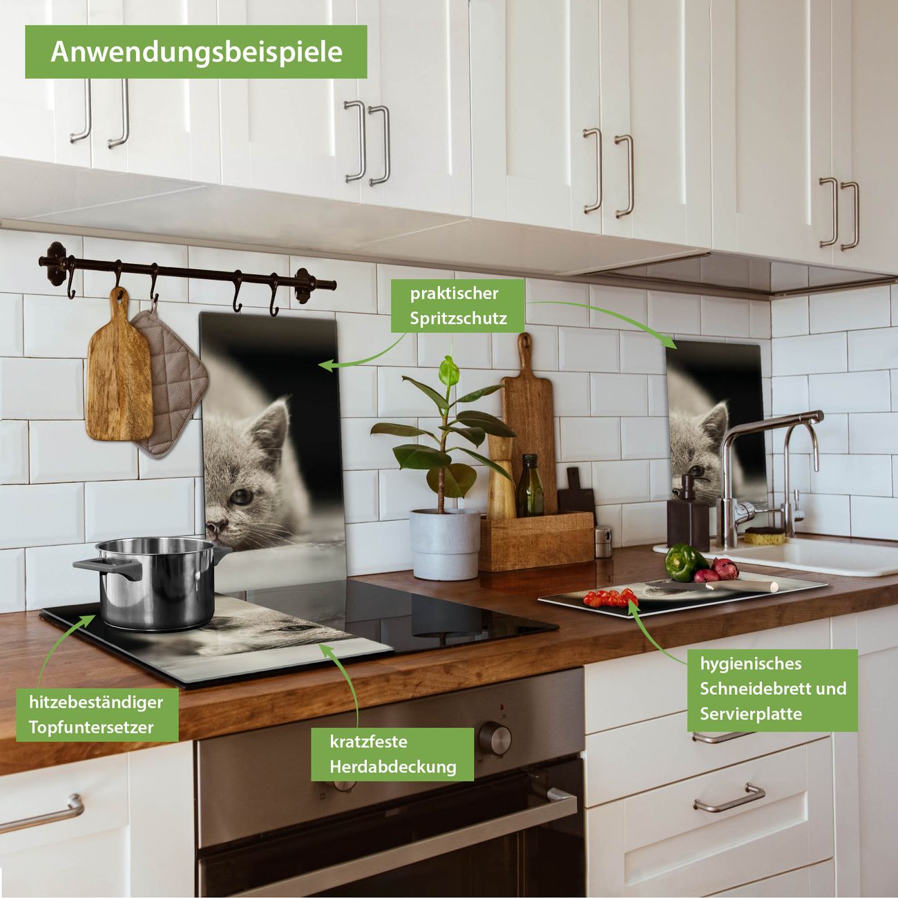 FUNKTION: Das banjado Schneidebrett mit Motiv Theodor ist groß und rutschfest und damit ideal für Ihre Küche. Besonders praktisch. Das Schneidebrett ist vielseitig einsetzbar: ob als Spritzschutz hinter dem Herd für Ihre Küche oder als Glas Schneidebrett als hygienische und geruchsneutrale Unterlage. Sie können ebenfalls heiße Töpfe und Pfannen bis 100°C auf der Herdplattenabdeckung abstellen. Sie erhalten ein Multitalent für Ihre Küche. QUALITÄT: Die Schneideplatte Glas besteht aus hochwertigem, gehärtetem und hitzebeständigem Glas. Wählen Sie aus einem unserer zahlreichen Motive das passende Design für Ihre Küche aus. DETAILS: Das Schneidebrett Glas groß ist in verschiedenen Größen verfügbar. Sie erhalten separate Gumminoppen damit Ihr großes Schneidebrett rutschfest in der Küche steht. VIELSEITIG: Das Schneidebrett modern ist ein Allrounder - als Schneideunterlage Küche direkt auf dem Herd oder separat und als Spritzschutz an der Wand aufgestellt - ein praktisches Küchenutensil. BANJADO: Auf Wunsch fertigen wir das Glas Schneide Brett auch als Sondergröße an. Mehrteilige Platten sind auch möglich. Kontaktieren Sie uns gern für eine Spezialanfertigung Ihrer Glasplatte Küche.