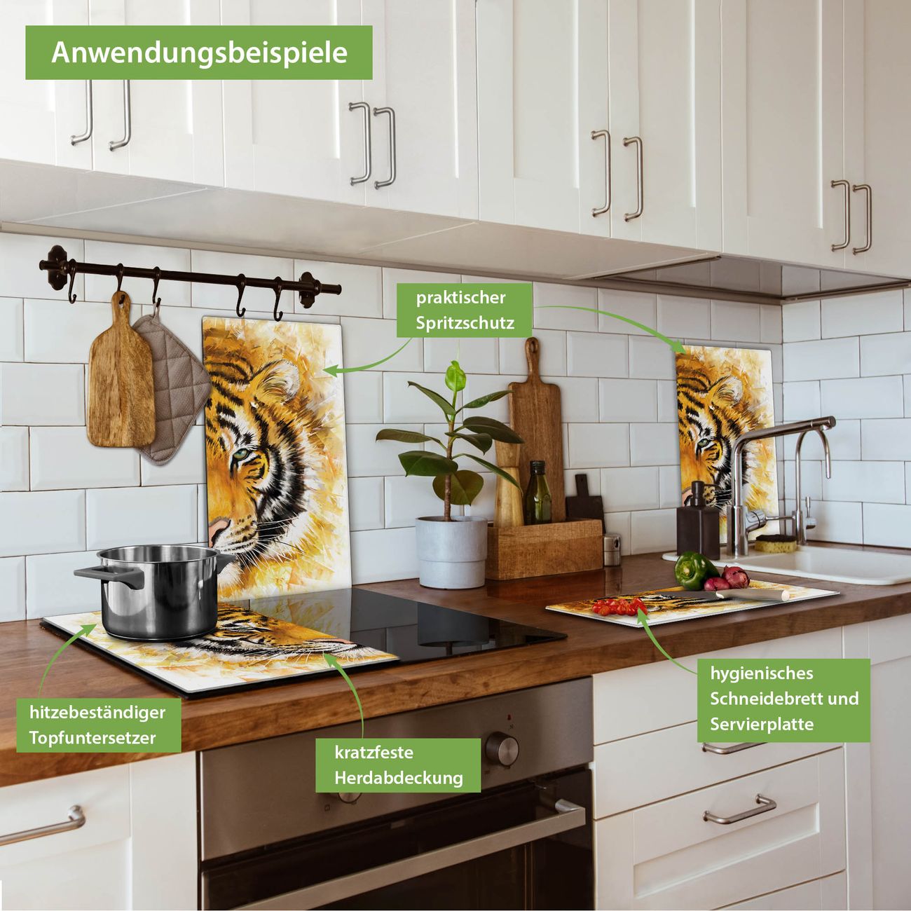 FUNKTION: Das banjado Schneidebrett mit Motiv Tigerkopf ist groß und rutschfest und damit ideal für Ihre Küche. Besonders praktisch. Das Schneidebrett ist vielseitig einsetzbar: ob als Spritzschutz hinter dem Herd für Ihre Küche oder als Glas Schneidebrett als hygienische und geruchsneutrale Unterlage. Sie können ebenfalls heiße Töpfe und Pfannen bis 100°C auf der Herdplattenabdeckung abstellen. Sie erhalten ein Multitalent für Ihre Küche. QUALITÄT: Die Schneideplatte Glas besteht aus hochwertigem, gehärtetem und hitzebeständigem Glas. Wählen Sie aus einem unserer zahlreichen Motive das passende Design für Ihre Küche aus. DETAILS: Das Schneidebrett Glas groß ist in verschiedenen Größen verfügbar. Sie erhalten separate Gumminoppen damit Ihr großes Schneidebrett rutschfest in der Küche steht. VIELSEITIG: Das Schneidebrett modern ist ein Allrounder - als Schneideunterlage Küche direkt auf dem Herd oder separat und als Spritzschutz an der Wand aufgestellt - ein praktisches Küchenutensil. BANJADO: Auf Wunsch fertigen wir das Glas Schneide Brett auch als Sondergröße an. Mehrteilige Platten sind auch möglich. Kontaktieren Sie uns gern für eine Spezialanfertigung Ihrer Glasplatte Küche.