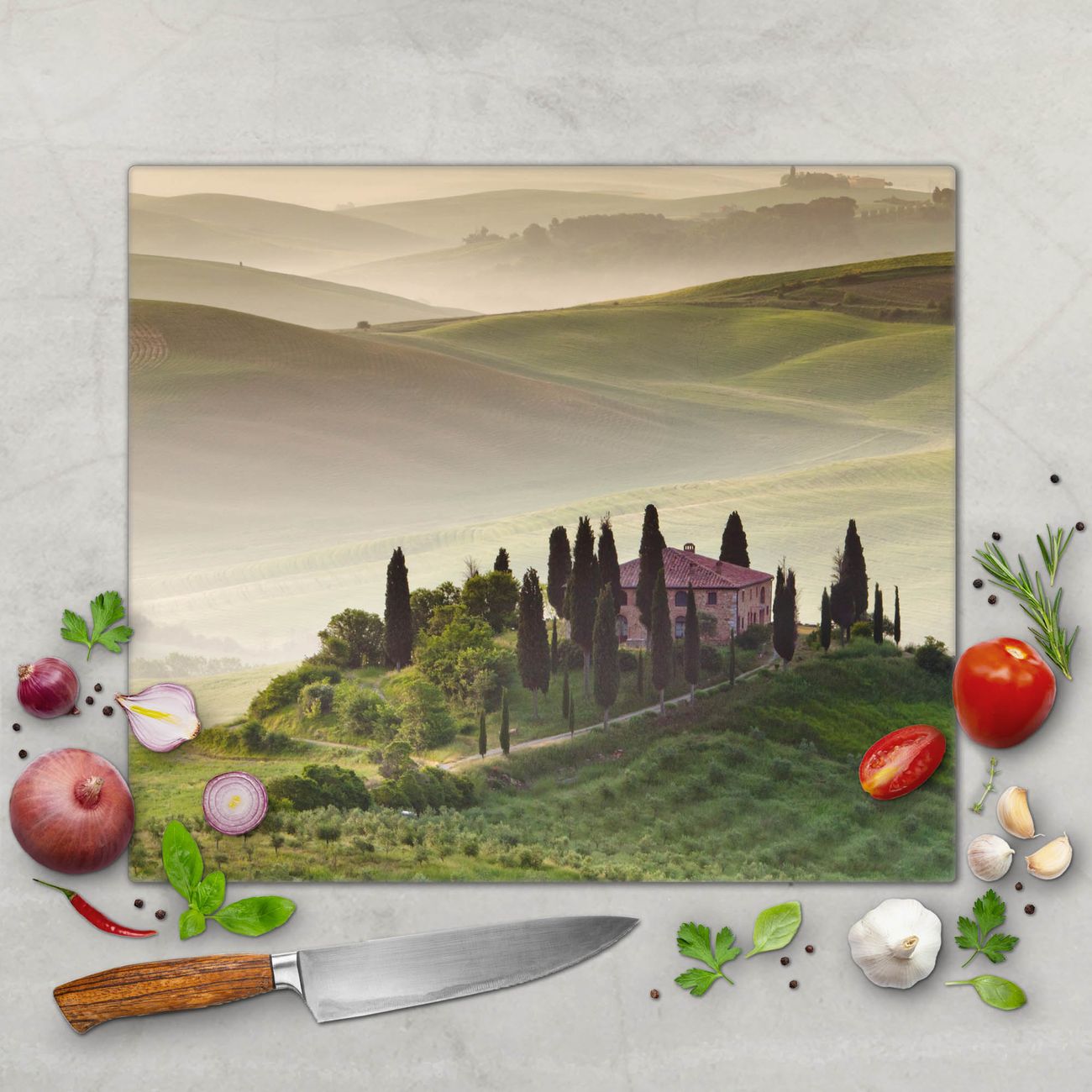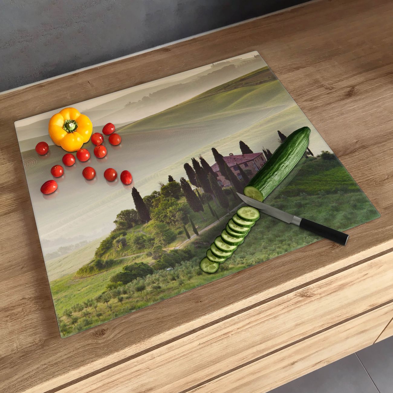 FUNKTION: Das banjado Schneidebrett mit Motiv Toscana ist groß und rutschfest und damit ideal für Ihre Küche. Besonders praktisch. Das Schneidebrett ist vielseitig einsetzbar: ob als Spritzschutz hinter dem Herd für Ihre Küche oder als Glas Schneidebrett als hygienische und geruchsneutrale Unterlage. Sie können ebenfalls heiße Töpfe und Pfannen bis 100°C auf der Herdplattenabdeckung abstellen. Sie erhalten ein Multitalent für Ihre Küche. QUALITÄT: Die Schneideplatte Glas besteht aus hochwertigem, gehärtetem und hitzebeständigem Glas. Wählen Sie aus einem unserer zahlreichen Motive das passende Design für Ihre Küche aus. DETAILS: Das Schneidebrett Glas groß ist in verschiedenen Größen verfügbar. Sie erhalten separate Gumminoppen damit Ihr großes Schneidebrett rutschfest in der Küche steht. VIELSEITIG: Das Schneidebrett modern ist ein Allrounder - als Schneideunterlage Küche direkt auf dem Herd oder separat und als Spritzschutz an der Wand aufgestellt - ein praktisches Küchenutensil. BANJADO: Auf Wunsch fertigen wir das Glas Schneide Brett auch als Sondergröße an. Mehrteilige Platten sind auch möglich. Kontaktieren Sie uns gern für eine Spezialanfertigung Ihrer Glasplatte Küche.