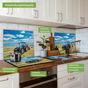 FUNKTION: Das banjado Schneidebrett mit Motiv Traktor ist groß und rutschfest und damit ideal für Ihre Küche. Besonders praktisch. Das Schneidebrett ist vielseitig einsetzbar: ob als Spritzschutz hinter dem Herd für Ihre Küche oder als Glas Schneidebrett als hygienische und geruchsneutrale Unterlage. Sie können ebenfalls heiße Töpfe und Pfannen bis 100°C auf der Herdplattenabdeckung abstellen. Sie erhalten ein Multitalent für Ihre Küche. QUALITÄT: Die Schneideplatte Glas besteht aus hochwertigem, gehärtetem und hitzebeständigem Glas. Wählen Sie aus einem unserer zahlreichen Motive das passende Design für Ihre Küche aus. DETAILS: Das Schneidebrett Glas groß ist in verschiedenen Größen verfügbar. Sie erhalten separate Gumminoppen damit Ihr großes Schneidebrett rutschfest in der Küche steht. VIELSEITIG: Das Schneidebrett modern ist ein Allrounder - als Schneideunterlage Küche direkt auf dem Herd oder separat und als Spritzschutz an der Wand aufgestellt - ein praktisches Küchenutensil. BANJADO: Auf Wunsch fertigen wir das Glas Schneide Brett auch als Sondergröße an. Mehrteilige Platten sind auch möglich. Kontaktieren Sie uns gern für eine Spezialanfertigung Ihrer Glasplatte Küche.