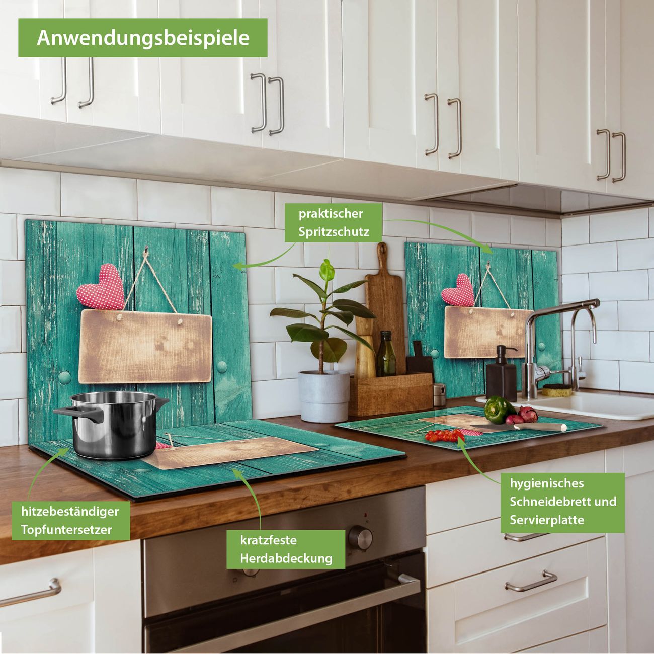 FUNKTION: Das banjado Schneidebrett mit Motiv Tür mit Herz ist groß und rutschfest und damit ideal für Ihre Küche. Besonders praktisch. Das Schneidebrett ist vielseitig einsetzbar: ob als Spritzschutz hinter dem Herd für Ihre Küche oder als Glas Schneidebrett als hygienische und geruchsneutrale Unterlage. Sie können ebenfalls heiße Töpfe und Pfannen bis 100°C auf der Herdplattenabdeckung abstellen. Sie erhalten ein Multitalent für Ihre Küche. QUALITÄT: Die Schneideplatte Glas besteht aus hochwertigem, gehärtetem und hitzebeständigem Glas. Wählen Sie aus einem unserer zahlreichen Motive das passende Design für Ihre Küche aus. DETAILS: Das Schneidebrett Glas groß ist in verschiedenen Größen verfügbar. Sie erhalten separate Gumminoppen damit Ihr großes Schneidebrett rutschfest in der Küche steht. VIELSEITIG: Das Schneidebrett modern ist ein Allrounder - als Schneideunterlage Küche direkt auf dem Herd oder separat und als Spritzschutz an der Wand aufgestellt - ein praktisches Küchenutensil. BANJADO: Auf Wunsch fertigen wir das Glas Schneide Brett auch als Sondergröße an. Mehrteilige Platten sind auch möglich. Kontaktieren Sie uns gern für eine Spezialanfertigung Ihrer Glasplatte Küche.