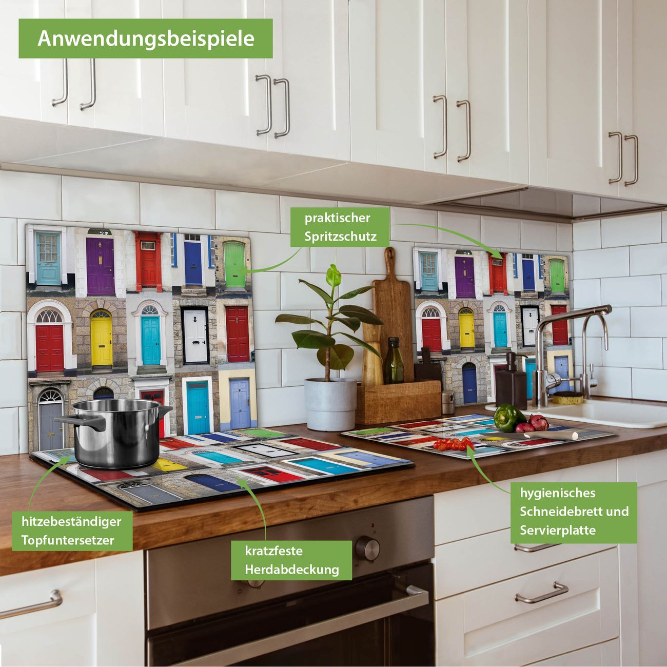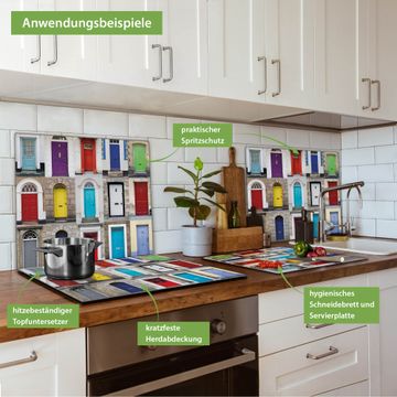 FUNKTION: Das banjado Schneidebrett mit Motiv Türen ist groß und rutschfest und damit ideal für Ihre Küche. Besonders praktisch. Das Schneidebrett ist vielseitig einsetzbar: ob als Spritzschutz hinter dem Herd für Ihre Küche oder als Glas Schneidebrett als hygienische und geruchsneutrale Unterlage. Sie können ebenfalls heiße Töpfe und Pfannen bis 100°C auf der Herdplattenabdeckung abstellen. Sie erhalten ein Multitalent für Ihre Küche. QUALITÄT: Die Schneideplatte Glas besteht aus hochwertigem, gehärtetem und hitzebeständigem Glas. Wählen Sie aus einem unserer zahlreichen Motive das passende Design für Ihre Küche aus. DETAILS: Das Schneidebrett Glas groß ist in verschiedenen Größen verfügbar. Sie erhalten separate Gumminoppen damit Ihr großes Schneidebrett rutschfest in der Küche steht. VIELSEITIG: Das Schneidebrett modern ist ein Allrounder - als Schneideunterlage Küche direkt auf dem Herd oder separat und als Spritzschutz an der Wand aufgestellt - ein praktisches Küchenutensil. BANJADO: Auf Wunsch fertigen wir das Glas Schneide Brett auch als Sondergröße an. Mehrteilige Platten sind auch möglich. Kontaktieren Sie uns gern für eine Spezialanfertigung Ihrer Glasplatte Küche.