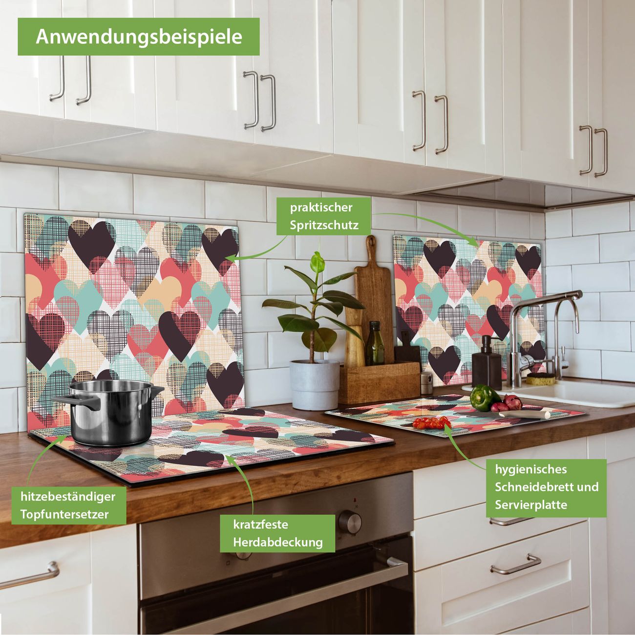 FUNKTION: Das banjado Schneidebrett mit Motiv Unter Herzen ist groß und rutschfest und damit ideal für Ihre Küche. Besonders praktisch. Das Schneidebrett ist vielseitig einsetzbar: ob als Spritzschutz hinter dem Herd für Ihre Küche oder als Glas Schneidebrett als hygienische und geruchsneutrale Unterlage. Sie können ebenfalls heiße Töpfe und Pfannen bis 100°C auf der Herdplattenabdeckung abstellen. Sie erhalten ein Multitalent für Ihre Küche. QUALITÄT: Die Schneideplatte Glas besteht aus hochwertigem, gehärtetem und hitzebeständigem Glas. Wählen Sie aus einem unserer zahlreichen Motive das passende Design für Ihre Küche aus. DETAILS: Das Schneidebrett Glas groß ist in verschiedenen Größen verfügbar. Sie erhalten separate Gumminoppen damit Ihr großes Schneidebrett rutschfest in der Küche steht. VIELSEITIG: Das Schneidebrett modern ist ein Allrounder - als Schneideunterlage Küche direkt auf dem Herd oder separat und als Spritzschutz an der Wand aufgestellt - ein praktisches Küchenutensil. BANJADO: Auf Wunsch fertigen wir das Glas Schneide Brett auch als Sondergröße an. Mehrteilige Platten sind auch möglich. Kontaktieren Sie uns gern für eine Spezialanfertigung Ihrer Glasplatte Küche.
