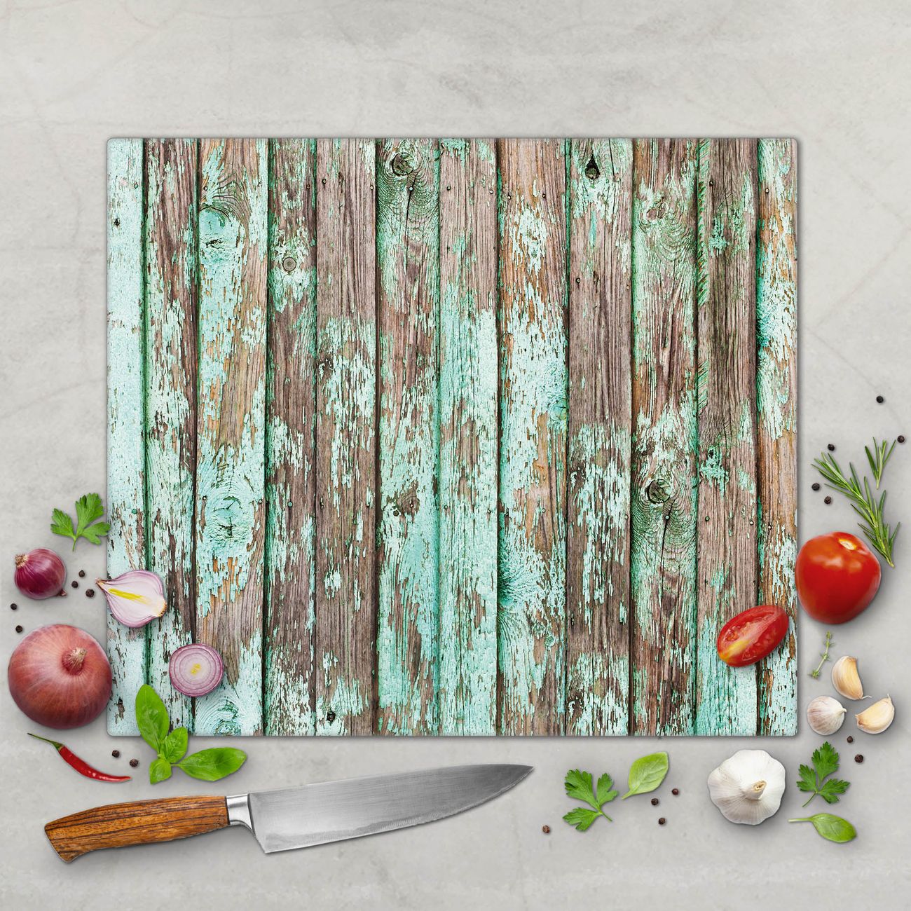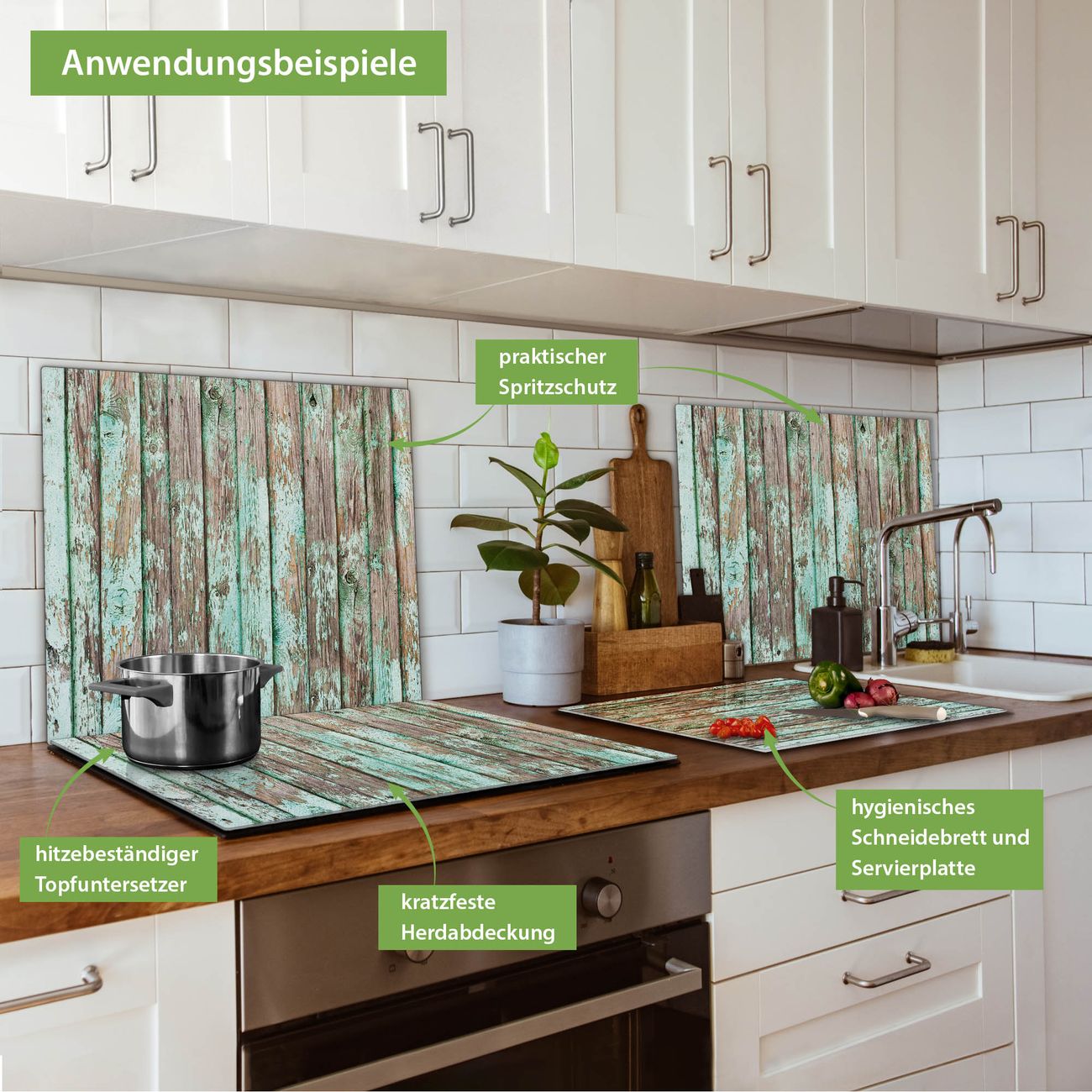 FUNKTION: Das banjado Schneidebrett mit Motiv Verwittertes Holz ist groß und rutschfest und damit ideal für Ihre Küche. Besonders praktisch. Das Schneidebrett ist vielseitig einsetzbar: ob als Spritzschutz hinter dem Herd für Ihre Küche oder als Glas Schneidebrett als hygienische und geruchsneutrale Unterlage. Sie können ebenfalls heiße Töpfe und Pfannen bis 100°C auf der Herdplattenabdeckung abstellen. Sie erhalten ein Multitalent für Ihre Küche. QUALITÄT: Die Schneideplatte Glas besteht aus hochwertigem, gehärtetem und hitzebeständigem Glas. Wählen Sie aus einem unserer zahlreichen Motive das passende Design für Ihre Küche aus. DETAILS: Das Schneidebrett Glas groß ist in verschiedenen Größen verfügbar. Sie erhalten separate Gumminoppen damit Ihr großes Schneidebrett rutschfest in der Küche steht. VIELSEITIG: Das Schneidebrett modern ist ein Allrounder - als Schneideunterlage Küche direkt auf dem Herd oder separat und als Spritzschutz an der Wand aufgestellt - ein praktisches Küchenutensil. BANJADO: Auf Wunsch fertigen wir das Glas Schneide Brett auch als Sondergröße an. Mehrteilige Platten sind auch möglich. Kontaktieren Sie uns gern für eine Spezialanfertigung Ihrer Glasplatte Küche.