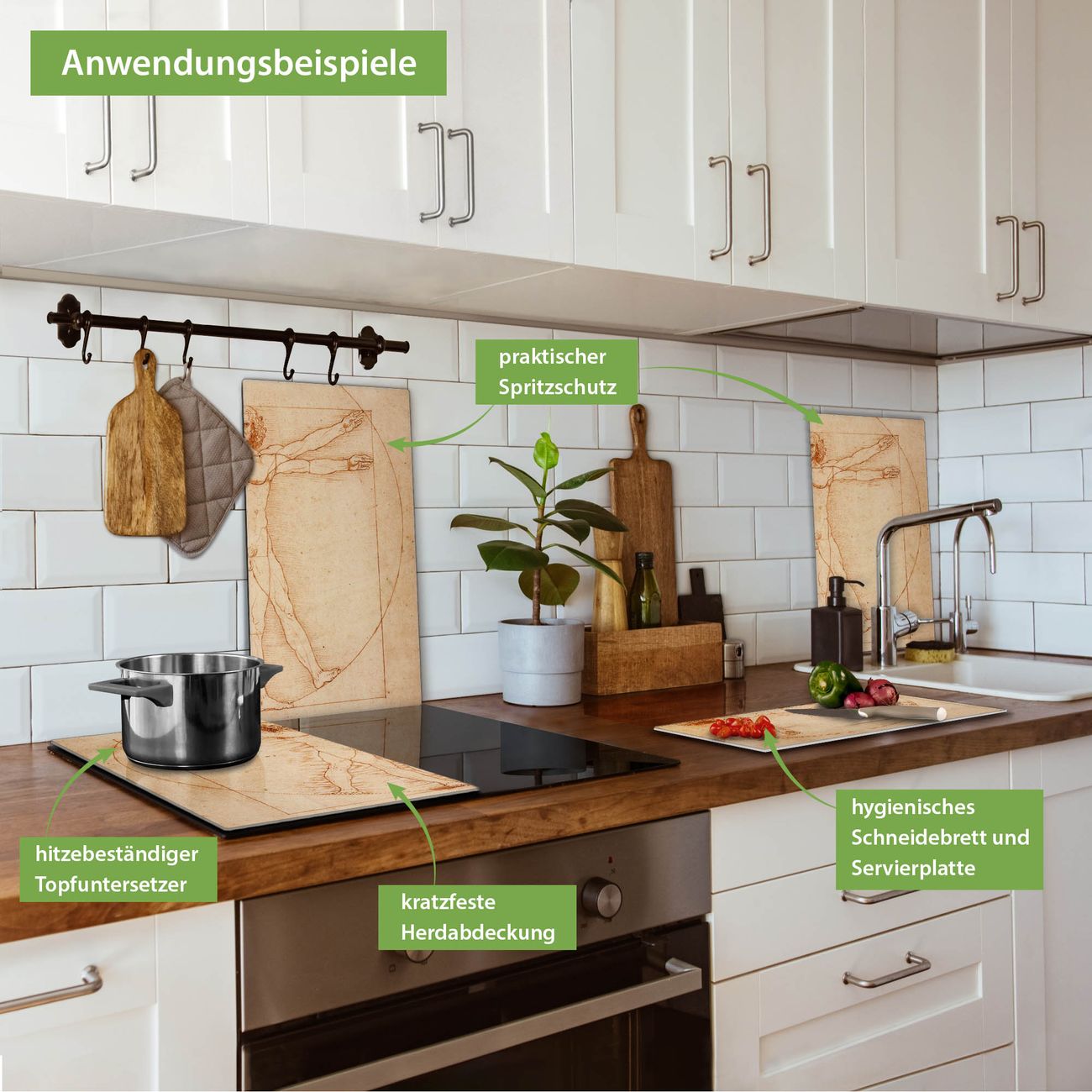 FUNKTION: Das banjado Schneidebrett mit Motiv Vitruvianische Figur ist groß und rutschfest und damit ideal für Ihre Küche. Besonders praktisch. Das Schneidebrett ist vielseitig einsetzbar: ob als Spritzschutz hinter dem Herd für Ihre Küche oder als Glas Schneidebrett als hygienische und geruchsneutrale Unterlage. Sie können ebenfalls heiße Töpfe und Pfannen bis 100°C auf der Herdplattenabdeckung abstellen. Sie erhalten ein Multitalent für Ihre Küche. QUALITÄT: Die Schneideplatte Glas besteht aus hochwertigem, gehärtetem und hitzebeständigem Glas. Wählen Sie aus einem unserer zahlreichen Motive das passende Design für Ihre Küche aus. DETAILS: Das Schneidebrett Glas groß ist in verschiedenen Größen verfügbar. Sie erhalten separate Gumminoppen damit Ihr großes Schneidebrett rutschfest in der Küche steht. VIELSEITIG: Das Schneidebrett modern ist ein Allrounder - als Schneideunterlage Küche direkt auf dem Herd oder separat und als Spritzschutz an der Wand aufgestellt - ein praktisches Küchenutensil. BANJADO: Auf Wunsch fertigen wir das Glas Schneide Brett auch als Sondergröße an. Mehrteilige Platten sind auch möglich. Kontaktieren Sie uns gern für eine Spezialanfertigung Ihrer Glasplatte Küche.