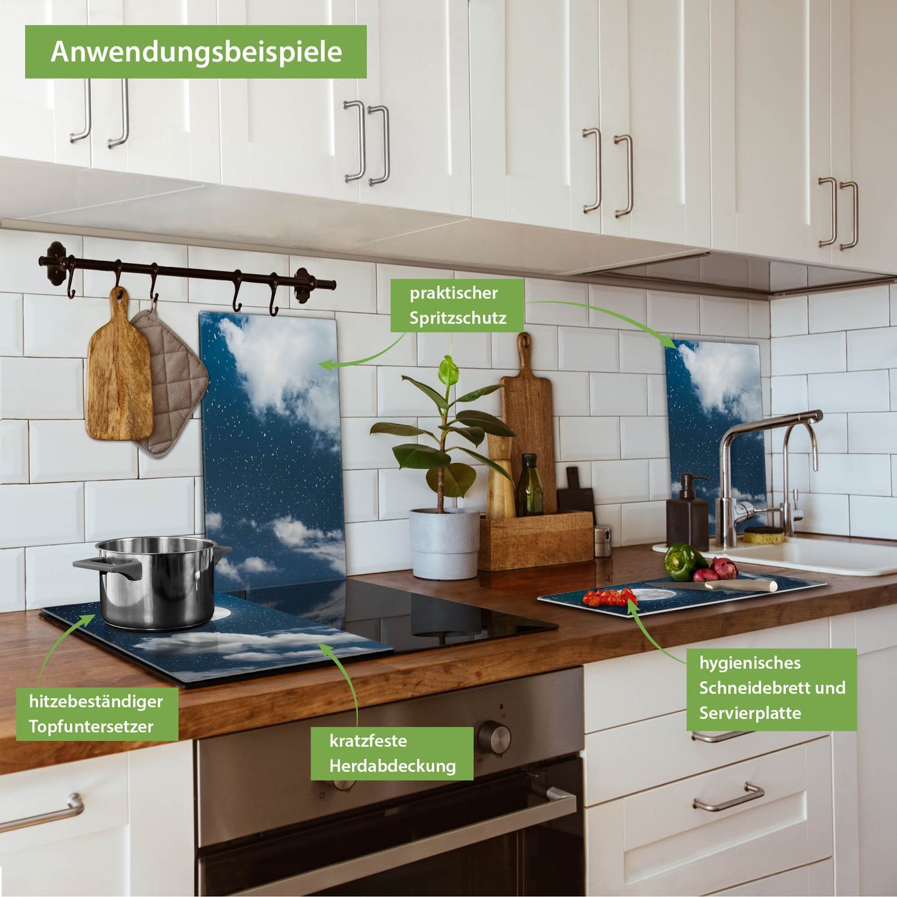 FUNKTION: Das banjado Schneidebrett mit Motiv Vollmond 3 ist groß und rutschfest und damit ideal für Ihre Küche. Besonders praktisch. Das Schneidebrett ist vielseitig einsetzbar: ob als Spritzschutz hinter dem Herd für Ihre Küche oder als Glas Schneidebrett als hygienische und geruchsneutrale Unterlage. Sie können ebenfalls heiße Töpfe und Pfannen bis 100°C auf der Herdplattenabdeckung abstellen. Sie erhalten ein Multitalent für Ihre Küche. QUALITÄT: Die Schneideplatte Glas besteht aus hochwertigem, gehärtetem und hitzebeständigem Glas. Wählen Sie aus einem unserer zahlreichen Motive das passende Design für Ihre Küche aus. DETAILS: Das Schneidebrett Glas groß ist in verschiedenen Größen verfügbar. Sie erhalten separate Gumminoppen damit Ihr großes Schneidebrett rutschfest in der Küche steht. VIELSEITIG: Das Schneidebrett modern ist ein Allrounder - als Schneideunterlage Küche direkt auf dem Herd oder separat und als Spritzschutz an der Wand aufgestellt - ein praktisches Küchenutensil. BANJADO: Auf Wunsch fertigen wir das Glas Schneide Brett auch als Sondergröße an. Mehrteilige Platten sind auch möglich. Kontaktieren Sie uns gern für eine Spezialanfertigung Ihrer Glasplatte Küche.