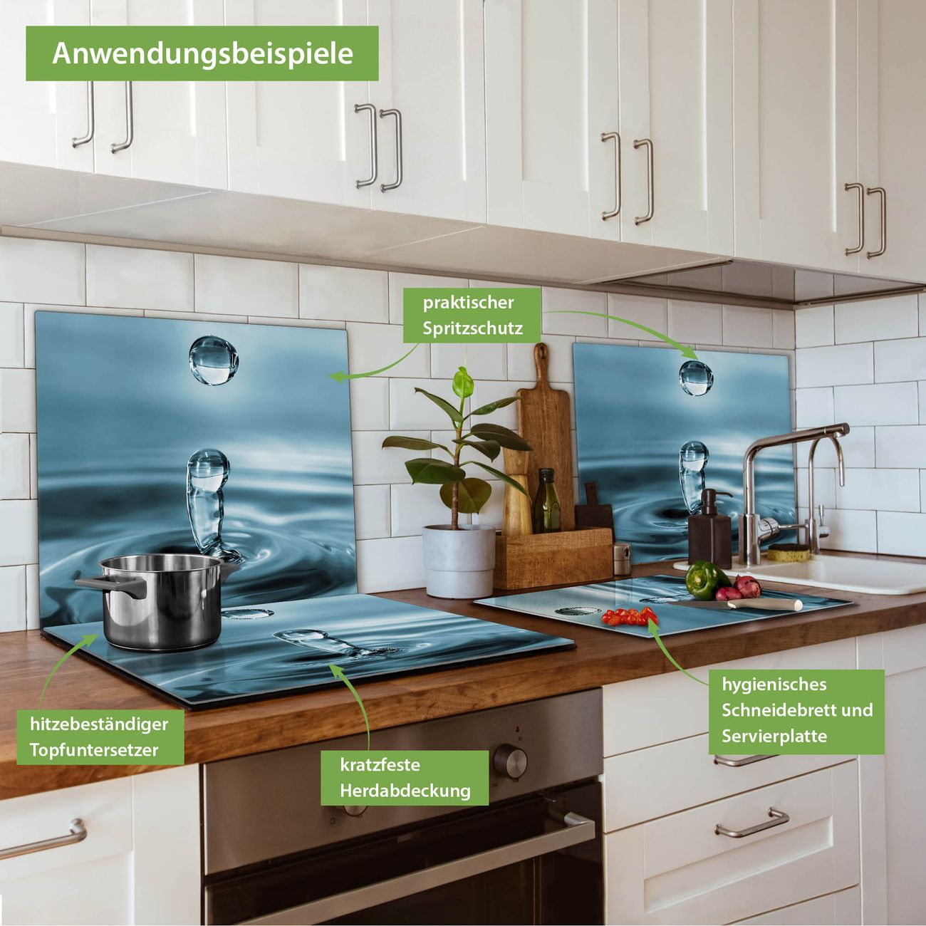 FUNKTION: Das banjado Schneidebrett mit Motiv Wassertropfen ist groß und rutschfest und damit ideal für Ihre Küche. Besonders praktisch. Das Schneidebrett ist vielseitig einsetzbar: ob als Spritzschutz hinter dem Herd für Ihre Küche oder als Glas Schneidebrett als hygienische und geruchsneutrale Unterlage. Sie können ebenfalls heiße Töpfe und Pfannen bis 100°C auf der Herdplattenabdeckung abstellen. Sie erhalten ein Multitalent für Ihre Küche. QUALITÄT: Die Schneideplatte Glas besteht aus hochwertigem, gehärtetem und hitzebeständigem Glas. Wählen Sie aus einem unserer zahlreichen Motive das passende Design für Ihre Küche aus. DETAILS: Das Schneidebrett Glas groß ist in verschiedenen Größen verfügbar. Sie erhalten separate Gumminoppen damit Ihr großes Schneidebrett rutschfest in der Küche steht. VIELSEITIG: Das Schneidebrett modern ist ein Allrounder - als Schneideunterlage Küche direkt auf dem Herd oder separat und als Spritzschutz an der Wand aufgestellt - ein praktisches Küchenutensil. BANJADO: Auf Wunsch fertigen wir das Glas Schneide Brett auch als Sondergröße an. Mehrteilige Platten sind auch möglich. Kontaktieren Sie uns gern für eine Spezialanfertigung Ihrer Glasplatte Küche.