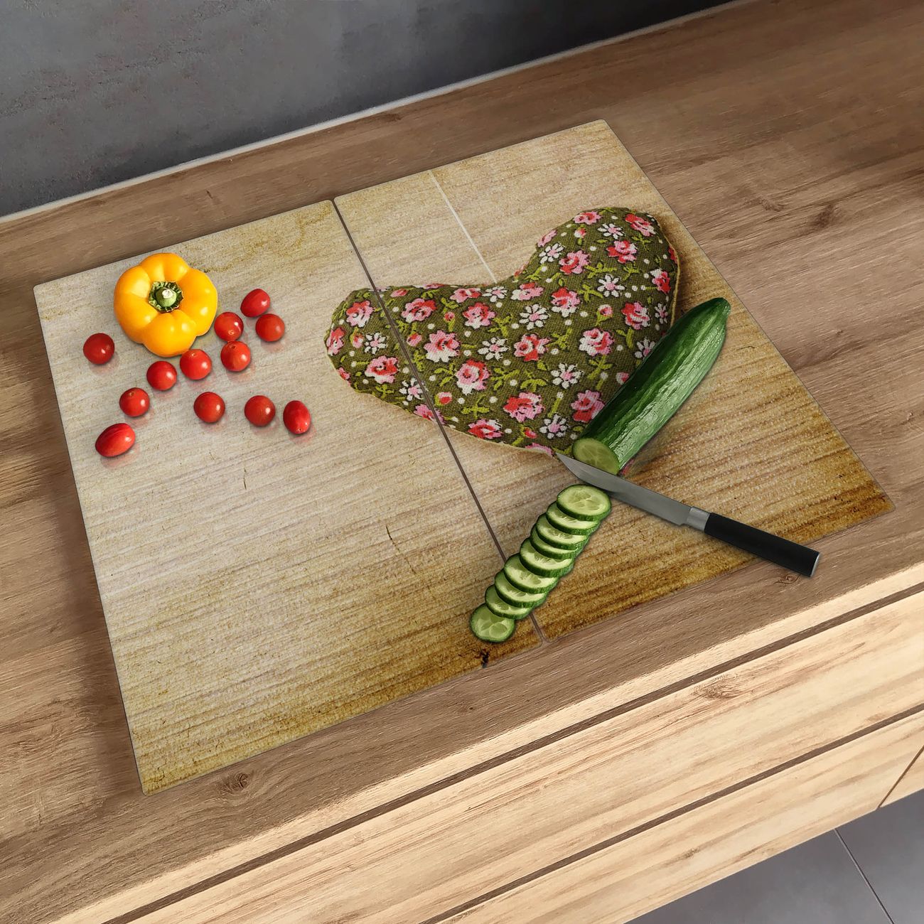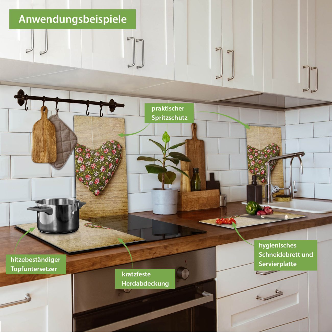FUNKTION: Das banjado Schneidebrett mit Motiv Weiches Herz ist groß und rutschfest und damit ideal für Ihre Küche. Besonders praktisch. Das Schneidebrett ist vielseitig einsetzbar: ob als Spritzschutz hinter dem Herd für Ihre Küche oder als Glas Schneidebrett als hygienische und geruchsneutrale Unterlage. Sie können ebenfalls heiße Töpfe und Pfannen bis 100°C auf der Herdplattenabdeckung abstellen. Sie erhalten ein Multitalent für Ihre Küche. QUALITÄT: Die Schneideplatte Glas besteht aus hochwertigem, gehärtetem und hitzebeständigem Glas. Wählen Sie aus einem unserer zahlreichen Motive das passende Design für Ihre Küche aus. DETAILS: Das Schneidebrett Glas groß ist in verschiedenen Größen verfügbar. Sie erhalten separate Gumminoppen damit Ihr großes Schneidebrett rutschfest in der Küche steht. VIELSEITIG: Das Schneidebrett modern ist ein Allrounder - als Schneideunterlage Küche direkt auf dem Herd oder separat und als Spritzschutz an der Wand aufgestellt - ein praktisches Küchenutensil. BANJADO: Auf Wunsch fertigen wir das Glas Schneide Brett auch als Sondergröße an. Mehrteilige Platten sind auch möglich. Kontaktieren Sie uns gern für eine Spezialanfertigung Ihrer Glasplatte Küche.