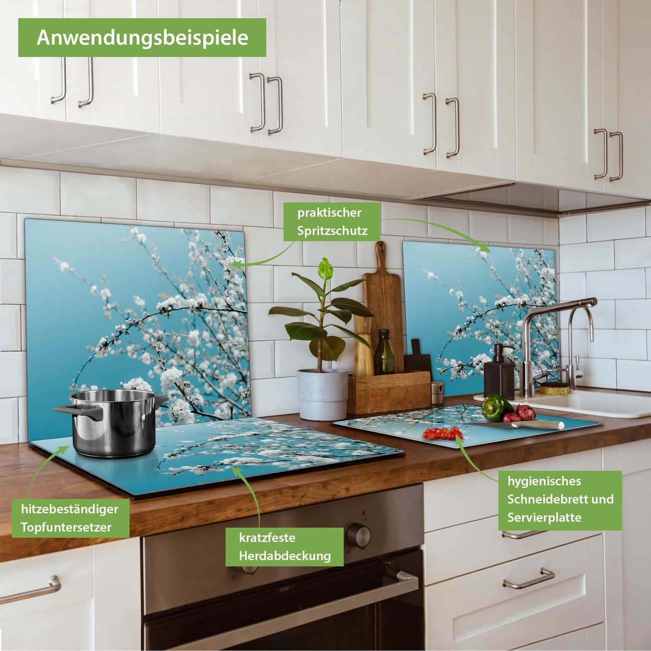 FUNKTION: Das banjado Schneidebrett mit Motiv weiße Kirschblüten ist groß und rutschfest und damit ideal für Ihre Küche. Besonders praktisch. Das Schneidebrett ist vielseitig einsetzbar: ob als Spritzschutz hinter dem Herd für Ihre Küche oder als Glas Schneidebrett als hygienische und geruchsneutrale Unterlage. Sie können ebenfalls heiße Töpfe und Pfannen bis 100°C auf der Herdplattenabdeckung abstellen. Sie erhalten ein Multitalent für Ihre Küche. QUALITÄT: Die Schneideplatte Glas besteht aus hochwertigem, gehärtetem und hitzebeständigem Glas. Wählen Sie aus einem unserer zahlreichen Motive das passende Design für Ihre Küche aus. DETAILS: Das Schneidebrett Glas groß ist in verschiedenen Größen verfügbar. Sie erhalten separate Gumminoppen damit Ihr großes Schneidebrett rutschfest in der Küche steht. VIELSEITIG: Das Schneidebrett modern ist ein Allrounder - als Schneideunterlage Küche direkt auf dem Herd oder separat und als Spritzschutz an der Wand aufgestellt - ein praktisches Küchenutensil. BANJADO: Auf Wunsch fertigen wir das Glas Schneide Brett auch als Sondergröße an. Mehrteilige Platten sind auch möglich. Kontaktieren Sie uns gern für eine Spezialanfertigung Ihrer Glasplatte Küche.