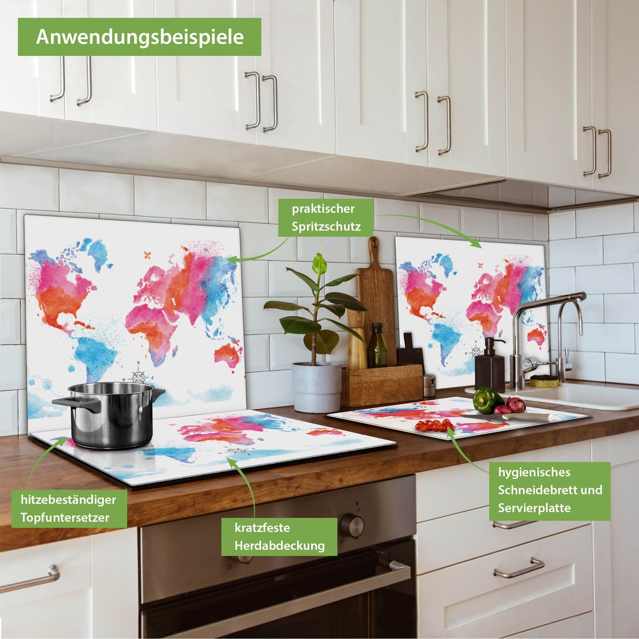 FUNKTION: Das banjado Schneidebrett mit Motiv Weltkarte pastell ist groß und rutschfest und damit ideal für Ihre Küche. Besonders praktisch. Das Schneidebrett ist vielseitig einsetzbar: ob als Spritzschutz hinter dem Herd für Ihre Küche oder als Glas Schneidebrett als hygienische und geruchsneutrale Unterlage. Sie können ebenfalls heiße Töpfe und Pfannen bis 100°C auf der Herdplattenabdeckung abstellen. Sie erhalten ein Multitalent für Ihre Küche. QUALITÄT: Die Schneideplatte Glas besteht aus hochwertigem, gehärtetem und hitzebeständigem Glas. Wählen Sie aus einem unserer zahlreichen Motive das passende Design für Ihre Küche aus. DETAILS: Das Schneidebrett Glas groß ist in verschiedenen Größen verfügbar. Sie erhalten separate Gumminoppen damit Ihr großes Schneidebrett rutschfest in der Küche steht. VIELSEITIG: Das Schneidebrett modern ist ein Allrounder - als Schneideunterlage Küche direkt auf dem Herd oder separat und als Spritzschutz an der Wand aufgestellt - ein praktisches Küchenutensil. BANJADO: Auf Wunsch fertigen wir das Glas Schneide Brett auch als Sondergröße an. Mehrteilige Platten sind auch möglich. Kontaktieren Sie uns gern für eine Spezialanfertigung Ihrer Glasplatte Küche.