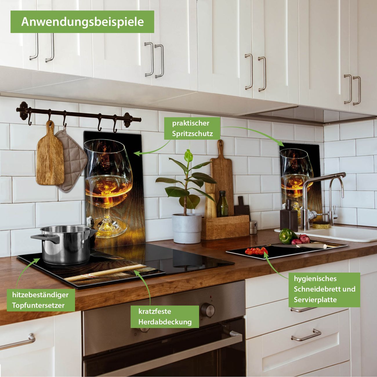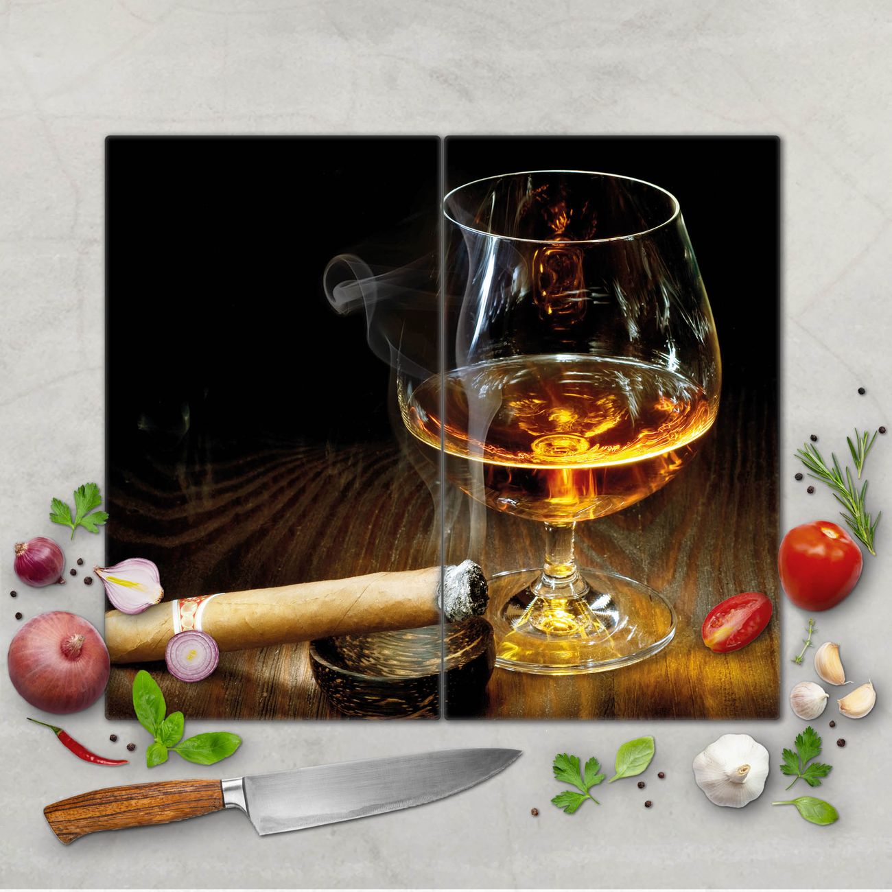 FUNKTION: Das banjado Schneidebrett mit Motiv Whiskey & Cigar ist groß und rutschfest und damit ideal für Ihre Küche. Besonders praktisch. Das Schneidebrett ist vielseitig einsetzbar: ob als Spritzschutz hinter dem Herd für Ihre Küche oder als Glas Schneidebrett als hygienische und geruchsneutrale Unterlage. Sie können ebenfalls heiße Töpfe und Pfannen bis 100°C auf der Herdplattenabdeckung abstellen. Sie erhalten ein Multitalent für Ihre Küche. QUALITÄT: Die Schneideplatte Glas besteht aus hochwertigem, gehärtetem und hitzebeständigem Glas. Wählen Sie aus einem unserer zahlreichen Motive das passende Design für Ihre Küche aus. DETAILS: Das Schneidebrett Glas groß ist in verschiedenen Größen verfügbar. Sie erhalten separate Gumminoppen damit Ihr großes Schneidebrett rutschfest in der Küche steht. VIELSEITIG: Das Schneidebrett modern ist ein Allrounder - als Schneideunterlage Küche direkt auf dem Herd oder separat und als Spritzschutz an der Wand aufgestellt - ein praktisches Küchenutensil. BANJADO: Auf Wunsch fertigen wir das Glas Schneide Brett auch als Sondergröße an. Mehrteilige Platten sind auch möglich. Kontaktieren Sie uns gern für eine Spezialanfertigung Ihrer Glasplatte Küche.