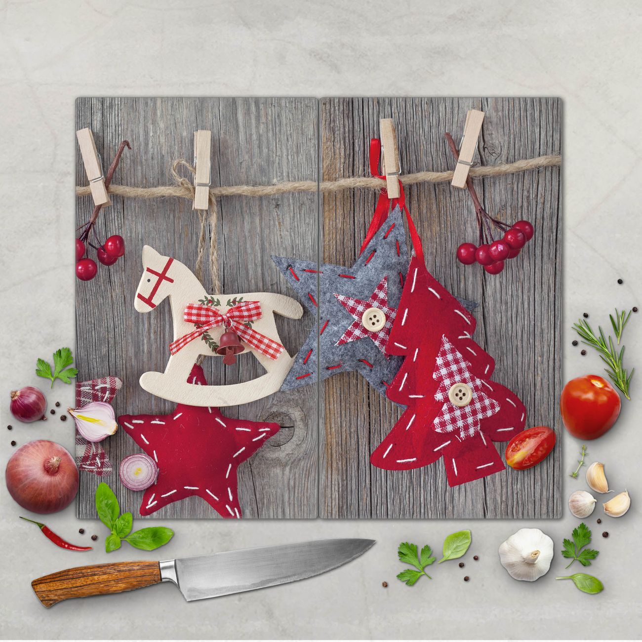 FUNKTION: Das banjado Schneidebrett mit Motiv Winterdekoration ist groß und rutschfest und damit ideal für Ihre Küche. Besonders praktisch. Das Schneidebrett ist vielseitig einsetzbar: ob als Spritzschutz hinter dem Herd für Ihre Küche oder als Glas Schneidebrett als hygienische und geruchsneutrale Unterlage. Sie können ebenfalls heiße Töpfe und Pfannen bis 100°C auf der Herdplattenabdeckung abstellen. Sie erhalten ein Multitalent für Ihre Küche. QUALITÄT: Die Schneideplatte Glas besteht aus hochwertigem, gehärtetem und hitzebeständigem Glas. Wählen Sie aus einem unserer zahlreichen Motive das passende Design für Ihre Küche aus. DETAILS: Das Schneidebrett Glas groß ist in verschiedenen Größen verfügbar. Sie erhalten separate Gumminoppen damit Ihr großes Schneidebrett rutschfest in der Küche steht. VIELSEITIG: Das Schneidebrett modern ist ein Allrounder - als Schneideunterlage Küche direkt auf dem Herd oder separat und als Spritzschutz an der Wand aufgestellt - ein praktisches Küchenutensil. BANJADO: Auf Wunsch fertigen wir das Glas Schneide Brett auch als Sondergröße an. Mehrteilige Platten sind auch möglich. Kontaktieren Sie uns gern für eine Spezialanfertigung Ihrer Glasplatte Küche.