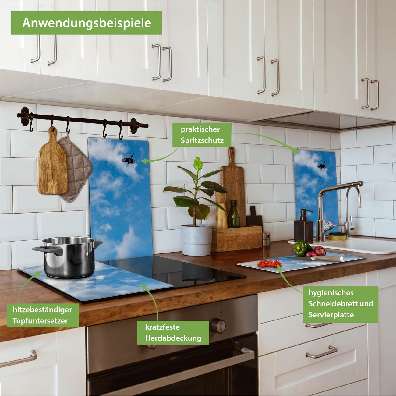 FUNKTION: Das banjado Schneidebrett mit Motiv Wolken 4 ist groß und rutschfest und damit ideal für Ihre Küche. Besonders praktisch. Das Schneidebrett ist vielseitig einsetzbar: ob als Spritzschutz hinter dem Herd für Ihre Küche oder als Glas Schneidebrett als hygienische und geruchsneutrale Unterlage. Sie können ebenfalls heiße Töpfe und Pfannen bis 100°C auf der Herdplattenabdeckung abstellen. Sie erhalten ein Multitalent für Ihre Küche. QUALITÄT: Die Schneideplatte Glas besteht aus hochwertigem, gehärtetem und hitzebeständigem Glas. Wählen Sie aus einem unserer zahlreichen Motive das passende Design für Ihre Küche aus. DETAILS: Das Schneidebrett Glas groß ist in verschiedenen Größen verfügbar. Sie erhalten separate Gumminoppen damit Ihr großes Schneidebrett rutschfest in der Küche steht. VIELSEITIG: Das Schneidebrett modern ist ein Allrounder - als Schneideunterlage Küche direkt auf dem Herd oder separat und als Spritzschutz an der Wand aufgestellt - ein praktisches Küchenutensil. BANJADO: Auf Wunsch fertigen wir das Glas Schneide Brett auch als Sondergröße an. Mehrteilige Platten sind auch möglich. Kontaktieren Sie uns gern für eine Spezialanfertigung Ihrer Glasplatte Küche.