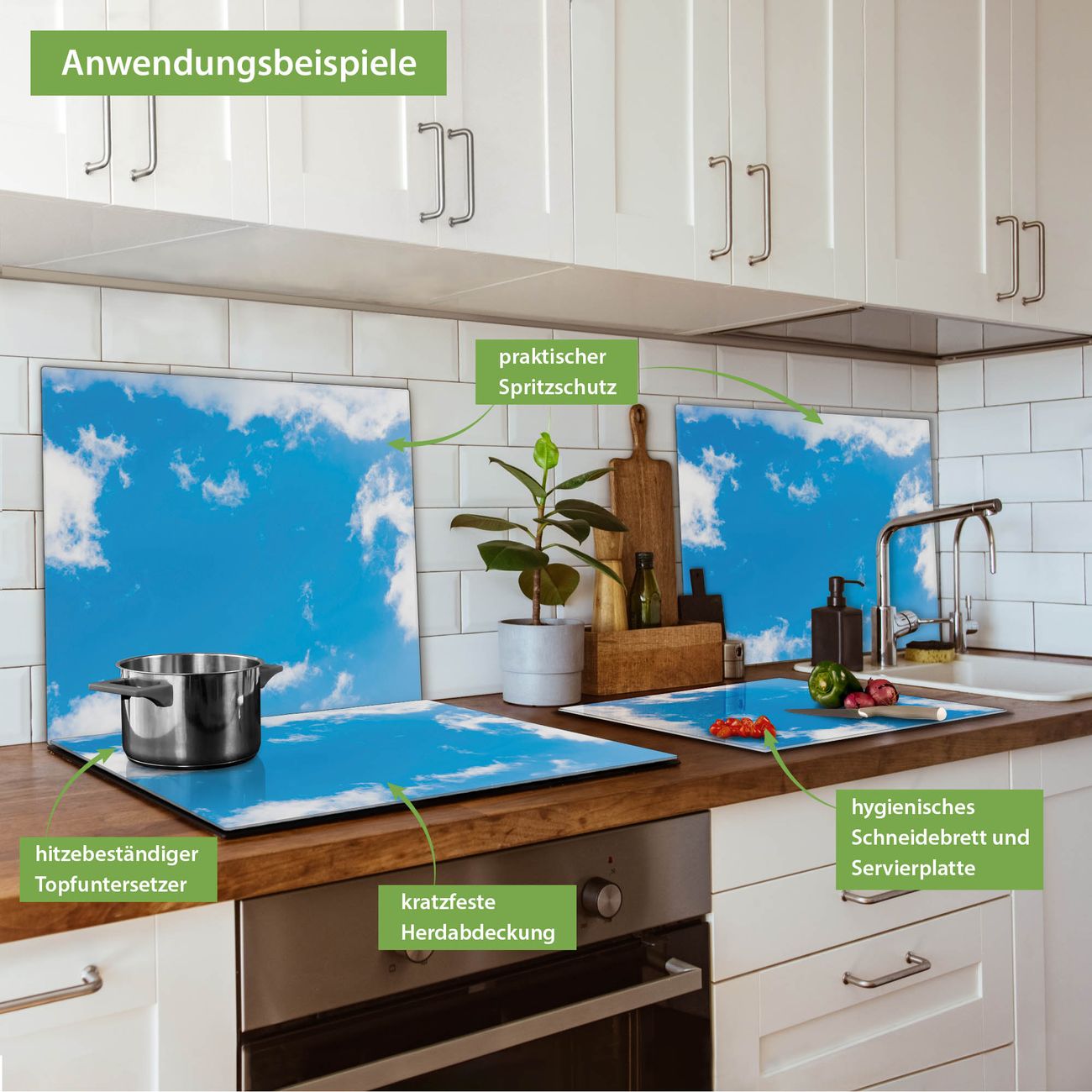 FUNKTION: Das banjado Schneidebrett mit Motiv Wolken 9 ist groß und rutschfest und damit ideal für Ihre Küche. Besonders praktisch. Das Schneidebrett ist vielseitig einsetzbar: ob als Spritzschutz hinter dem Herd für Ihre Küche oder als Glas Schneidebrett als hygienische und geruchsneutrale Unterlage. Sie können ebenfalls heiße Töpfe und Pfannen bis 100°C auf der Herdplattenabdeckung abstellen. Sie erhalten ein Multitalent für Ihre Küche. QUALITÄT: Die Schneideplatte Glas besteht aus hochwertigem, gehärtetem und hitzebeständigem Glas. Wählen Sie aus einem unserer zahlreichen Motive das passende Design für Ihre Küche aus. DETAILS: Das Schneidebrett Glas groß ist in verschiedenen Größen verfügbar. Sie erhalten separate Gumminoppen damit Ihr großes Schneidebrett rutschfest in der Küche steht. VIELSEITIG: Das Schneidebrett modern ist ein Allrounder - als Schneideunterlage Küche direkt auf dem Herd oder separat und als Spritzschutz an der Wand aufgestellt - ein praktisches Küchenutensil. BANJADO: Auf Wunsch fertigen wir das Glas Schneide Brett auch als Sondergröße an. Mehrteilige Platten sind auch möglich. Kontaktieren Sie uns gern für eine Spezialanfertigung Ihrer Glasplatte Küche.