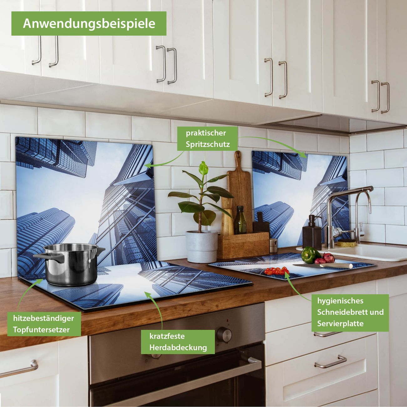 FUNKTION: Das banjado Schneidebrett mit Motiv Wolkenkratzer ist groß und rutschfest und damit ideal für Ihre Küche. Besonders praktisch. Das Schneidebrett ist vielseitig einsetzbar: ob als Spritzschutz hinter dem Herd für Ihre Küche oder als Glas Schneidebrett als hygienische und geruchsneutrale Unterlage. Sie können ebenfalls heiße Töpfe und Pfannen bis 100°C auf der Herdplattenabdeckung abstellen. Sie erhalten ein Multitalent für Ihre Küche. QUALITÄT: Die Schneideplatte Glas besteht aus hochwertigem, gehärtetem und hitzebeständigem Glas. Wählen Sie aus einem unserer zahlreichen Motive das passende Design für Ihre Küche aus. DETAILS: Das Schneidebrett Glas groß ist in verschiedenen Größen verfügbar. Sie erhalten separate Gumminoppen damit Ihr großes Schneidebrett rutschfest in der Küche steht. VIELSEITIG: Das Schneidebrett modern ist ein Allrounder - als Schneideunterlage Küche direkt auf dem Herd oder separat und als Spritzschutz an der Wand aufgestellt - ein praktisches Küchenutensil. BANJADO: Auf Wunsch fertigen wir das Glas Schneide Brett auch als Sondergröße an. Mehrteilige Platten sind auch möglich. Kontaktieren Sie uns gern für eine Spezialanfertigung Ihrer Glasplatte Küche.