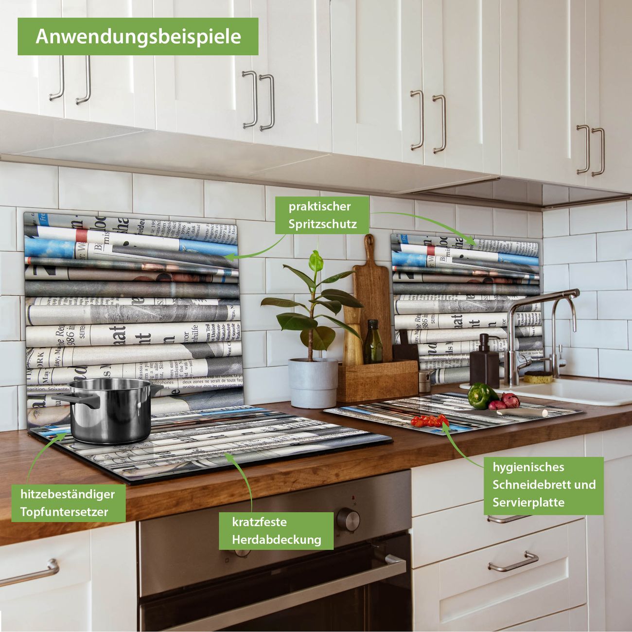 FUNKTION: Das banjado Schneidebrett mit Motiv Zeitungen ist groß und rutschfest und damit ideal für Ihre Küche. Besonders praktisch. Das Schneidebrett ist vielseitig einsetzbar: ob als Spritzschutz hinter dem Herd für Ihre Küche oder als Glas Schneidebrett als hygienische und geruchsneutrale Unterlage. Sie können ebenfalls heiße Töpfe und Pfannen bis 100°C auf der Herdplattenabdeckung abstellen. Sie erhalten ein Multitalent für Ihre Küche. QUALITÄT: Die Schneideplatte Glas besteht aus hochwertigem, gehärtetem und hitzebeständigem Glas. Wählen Sie aus einem unserer zahlreichen Motive das passende Design für Ihre Küche aus. DETAILS: Das Schneidebrett Glas groß ist in verschiedenen Größen verfügbar. Sie erhalten separate Gumminoppen damit Ihr großes Schneidebrett rutschfest in der Küche steht. VIELSEITIG: Das Schneidebrett modern ist ein Allrounder - als Schneideunterlage Küche direkt auf dem Herd oder separat und als Spritzschutz an der Wand aufgestellt - ein praktisches Küchenutensil. BANJADO: Auf Wunsch fertigen wir das Glas Schneide Brett auch als Sondergröße an. Mehrteilige Platten sind auch möglich. Kontaktieren Sie uns gern für eine Spezialanfertigung Ihrer Glasplatte Küche.