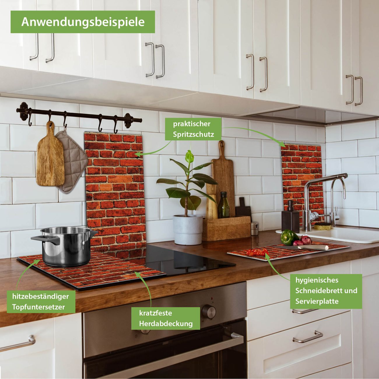 FUNKTION: Das banjado Schneidebrett mit Motiv Ziegelwand ist groß und rutschfest und damit ideal für Ihre Küche. Besonders praktisch. Das Schneidebrett ist vielseitig einsetzbar: ob als Spritzschutz hinter dem Herd für Ihre Küche oder als Glas Schneidebrett als hygienische und geruchsneutrale Unterlage. Sie können ebenfalls heiße Töpfe und Pfannen bis 100°C auf der Herdplattenabdeckung abstellen. Sie erhalten ein Multitalent für Ihre Küche. QUALITÄT: Die Schneideplatte Glas besteht aus hochwertigem, gehärtetem und hitzebeständigem Glas. Wählen Sie aus einem unserer zahlreichen Motive das passende Design für Ihre Küche aus. DETAILS: Das Schneidebrett Glas groß ist in verschiedenen Größen verfügbar. Sie erhalten separate Gumminoppen damit Ihr großes Schneidebrett rutschfest in der Küche steht. VIELSEITIG: Das Schneidebrett modern ist ein Allrounder - als Schneideunterlage Küche direkt auf dem Herd oder separat und als Spritzschutz an der Wand aufgestellt - ein praktisches Küchenutensil. BANJADO: Auf Wunsch fertigen wir das Glas Schneide Brett auch als Sondergröße an. Mehrteilige Platten sind auch möglich. Kontaktieren Sie uns gern für eine Spezialanfertigung Ihrer Glasplatte Küche.