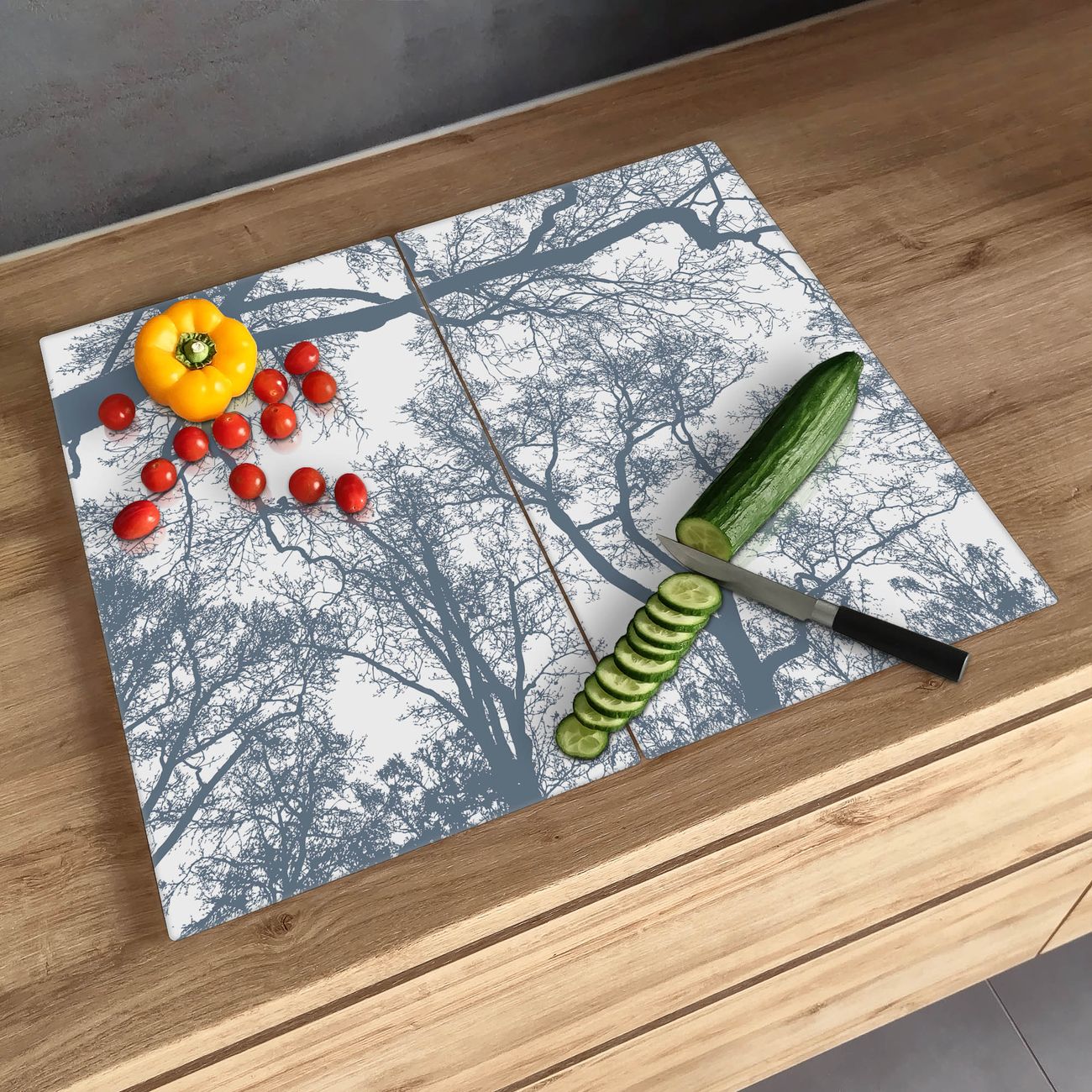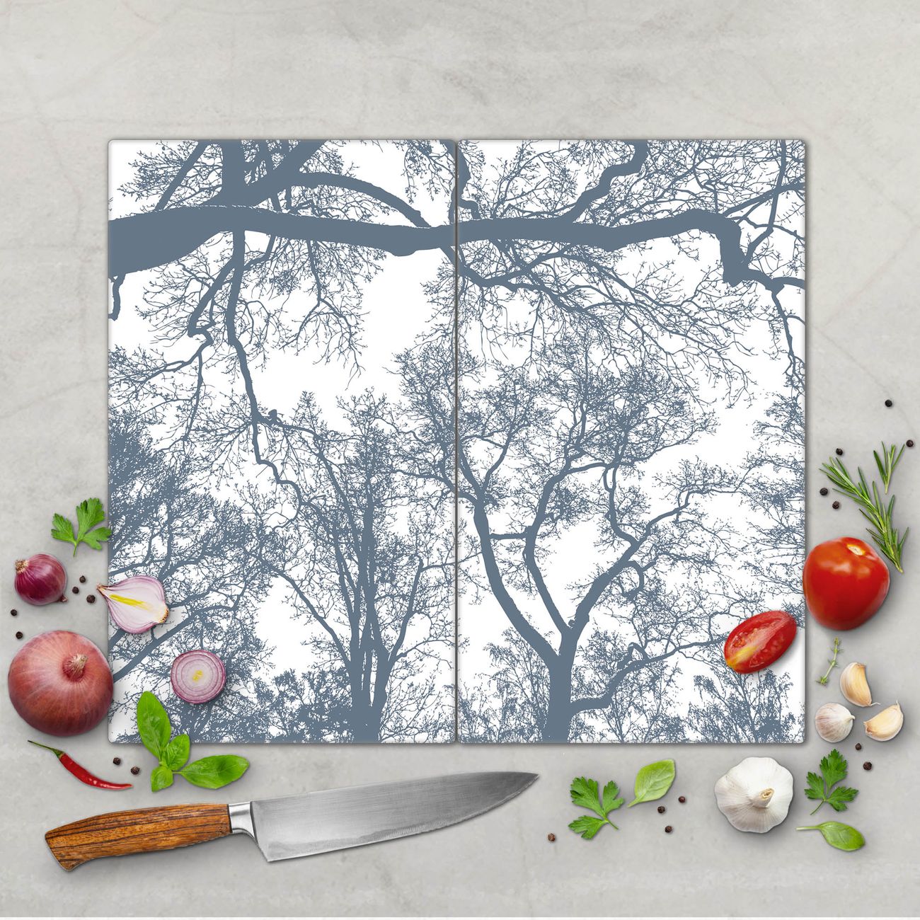 FUNKTION: Das banjado Schneidebrett mit Motiv Zwischen Bäumen 7 ist groß und rutschfest und damit ideal für Ihre Küche. Besonders praktisch. Das Schneidebrett ist vielseitig einsetzbar: ob als Spritzschutz hinter dem Herd für Ihre Küche oder als Glas Schneidebrett als hygienische und geruchsneutrale Unterlage. Sie können ebenfalls heiße Töpfe und Pfannen bis 100°C auf der Herdplattenabdeckung abstellen. Sie erhalten ein Multitalent für Ihre Küche. QUALITÄT: Die Schneideplatte Glas besteht aus hochwertigem, gehärtetem und hitzebeständigem Glas. Wählen Sie aus einem unserer zahlreichen Motive das passende Design für Ihre Küche aus. DETAILS: Das Schneidebrett Glas groß ist in verschiedenen Größen verfügbar. Sie erhalten separate Gumminoppen damit Ihr großes Schneidebrett rutschfest in der Küche steht. VIELSEITIG: Das Schneidebrett modern ist ein Allrounder - als Schneideunterlage Küche direkt auf dem Herd oder separat und als Spritzschutz an der Wand aufgestellt - ein praktisches Küchenutensil. BANJADO: Auf Wunsch fertigen wir das Glas Schneide Brett auch als Sondergröße an. Mehrteilige Platten sind auch möglich. Kontaktieren Sie uns gern für eine Spezialanfertigung Ihrer Glasplatte Küche.