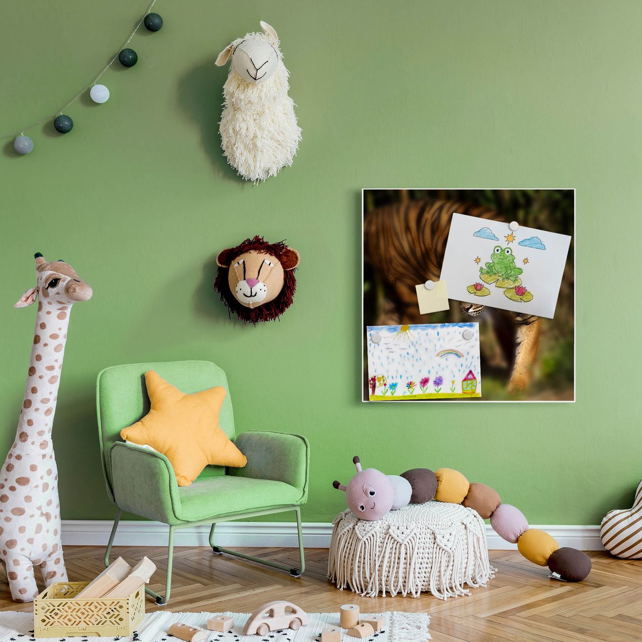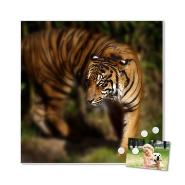 Die banjado Design Magnettafel mit Motiv Motiv Tiger bringt Ordnung in Ihr Zettelchaos. Fotos, Termine, Notizen oder Rezepte lassen Sich hier stilvoll mit Magneten ordnen, Sie behalten alles im Blick. An der Pinnwand halten alle handelsüblichen Magnete. Mit dieser Pinnwand aus Metall haben Sie auch ohne Notizen und Magnete ein schönes Dekoelement. Das Quadratische Format bietet Ihnen ausreichend Platz um alle wichtigen Informationen im Blick zu behalten.