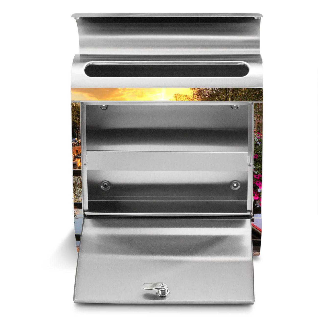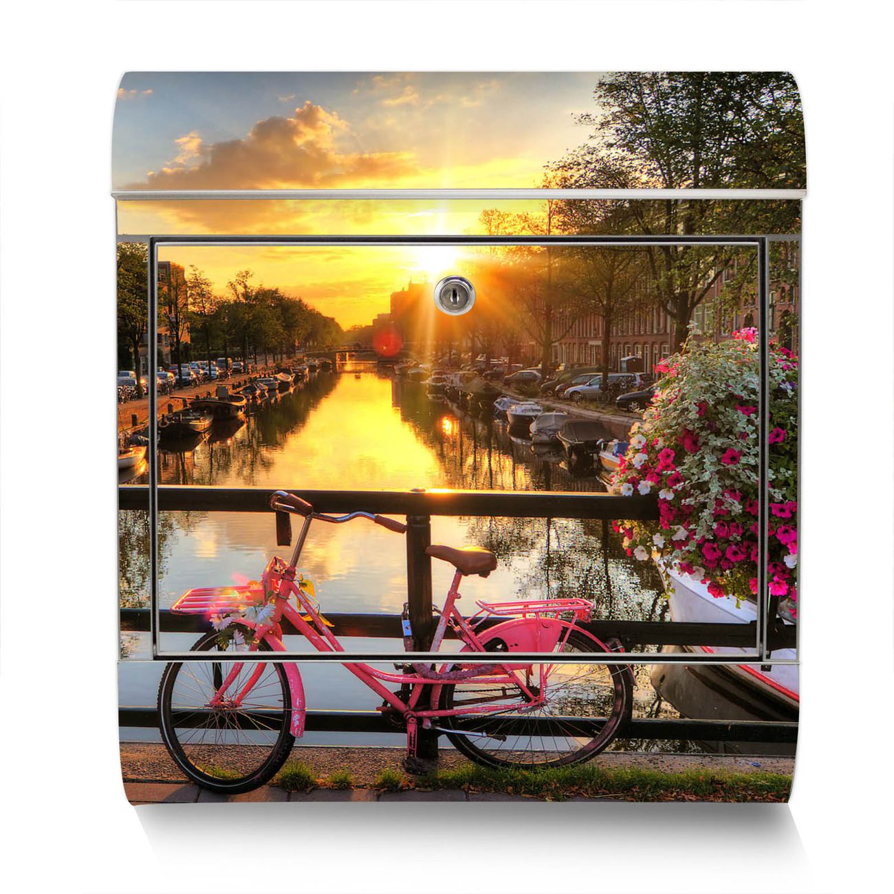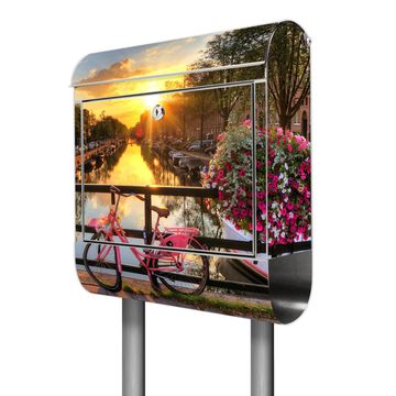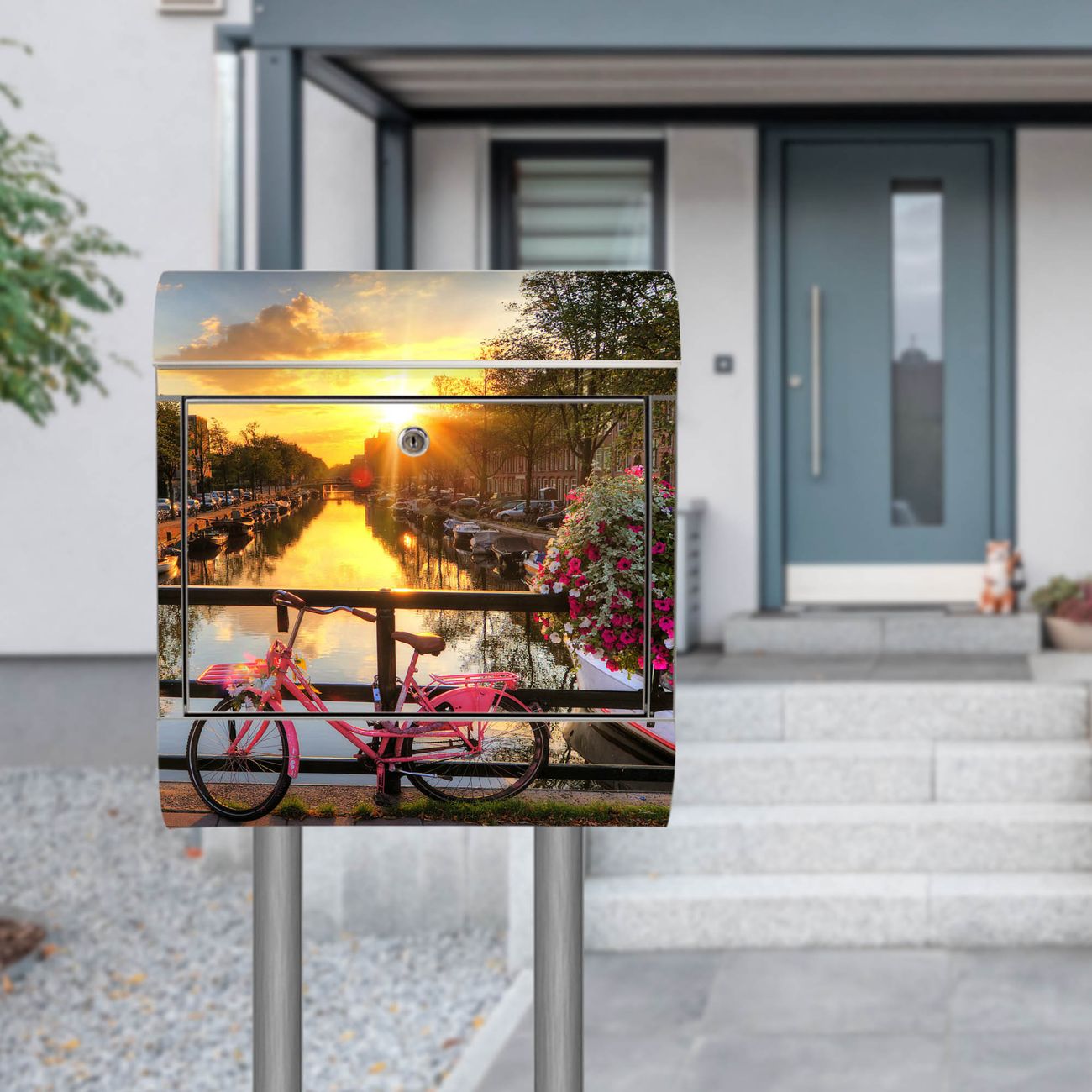 Der banjado Edelstahl Standbriefkasten mit Motiv Amsterdam Mit Rad bietet Ihnen mit seinem Fassungsvermögen genügend Platz auch für große A4 Sendungen. Das integrierte Zeitungsfach eignet sich hervorragend, um unkompliziert die Tageszeitung zu fassen.