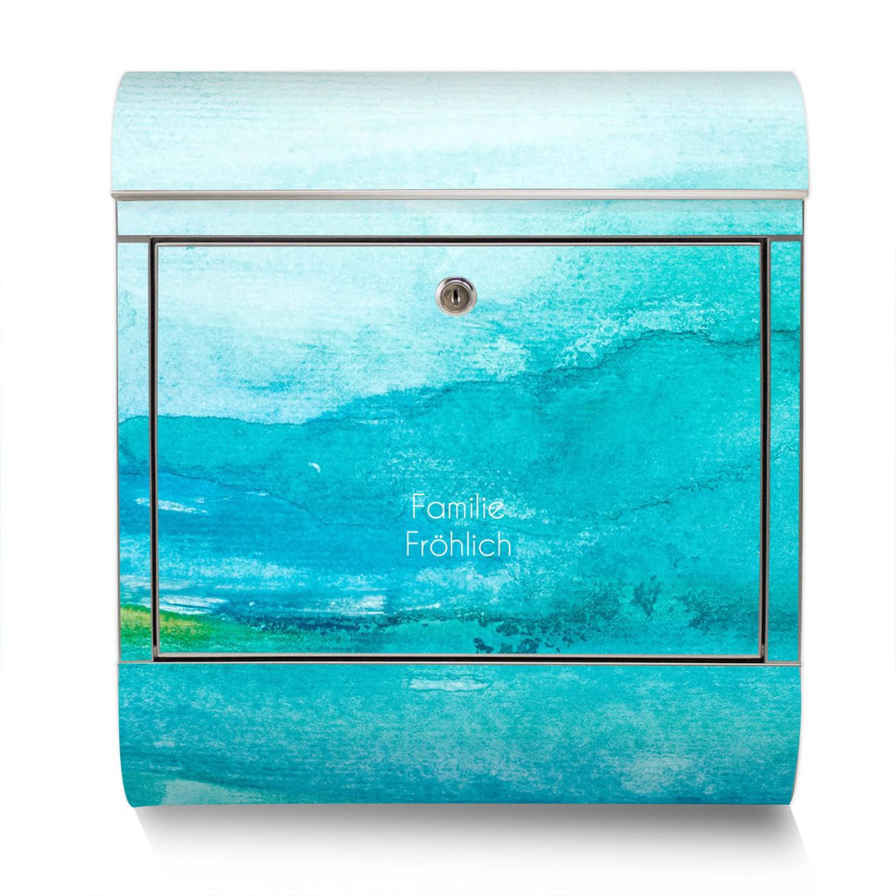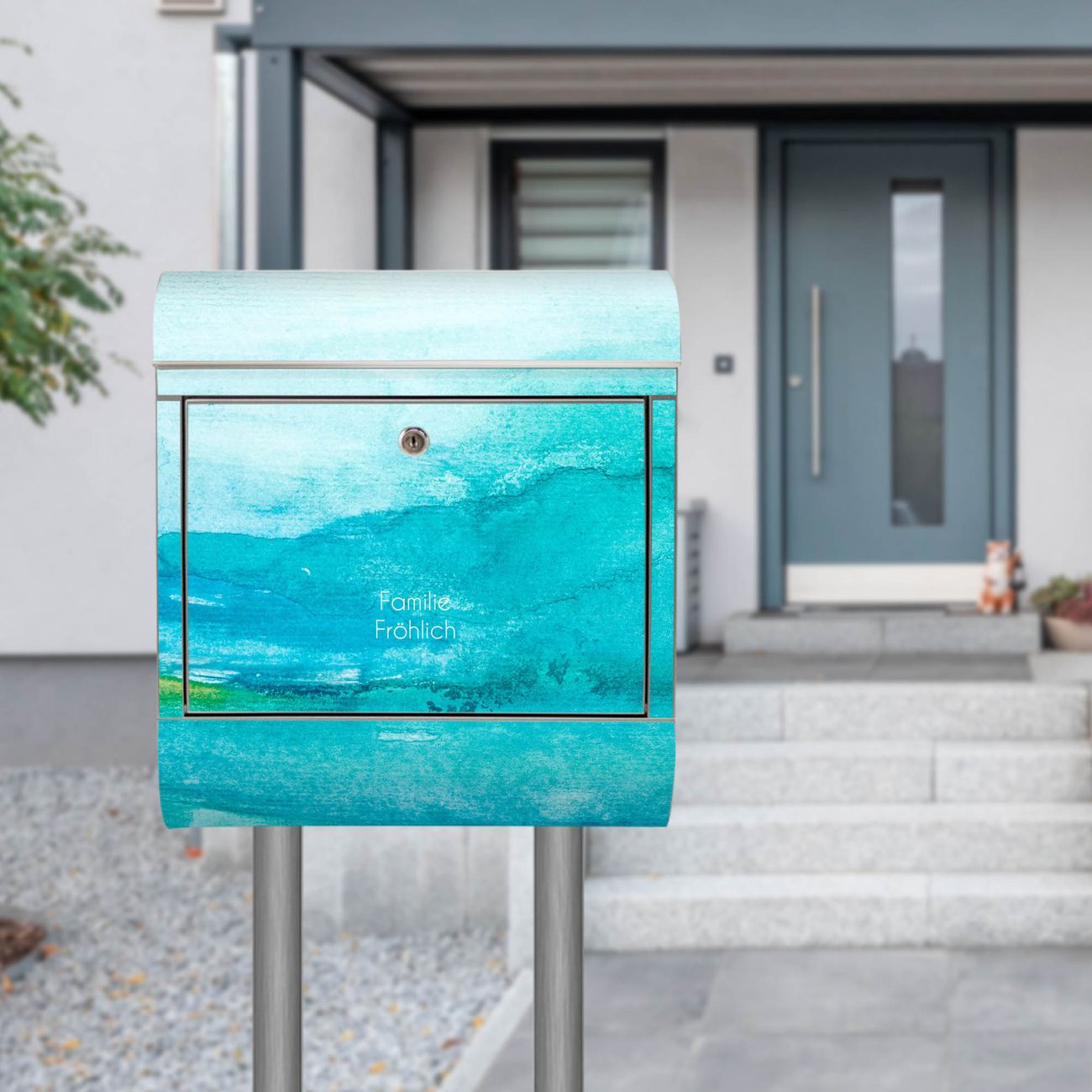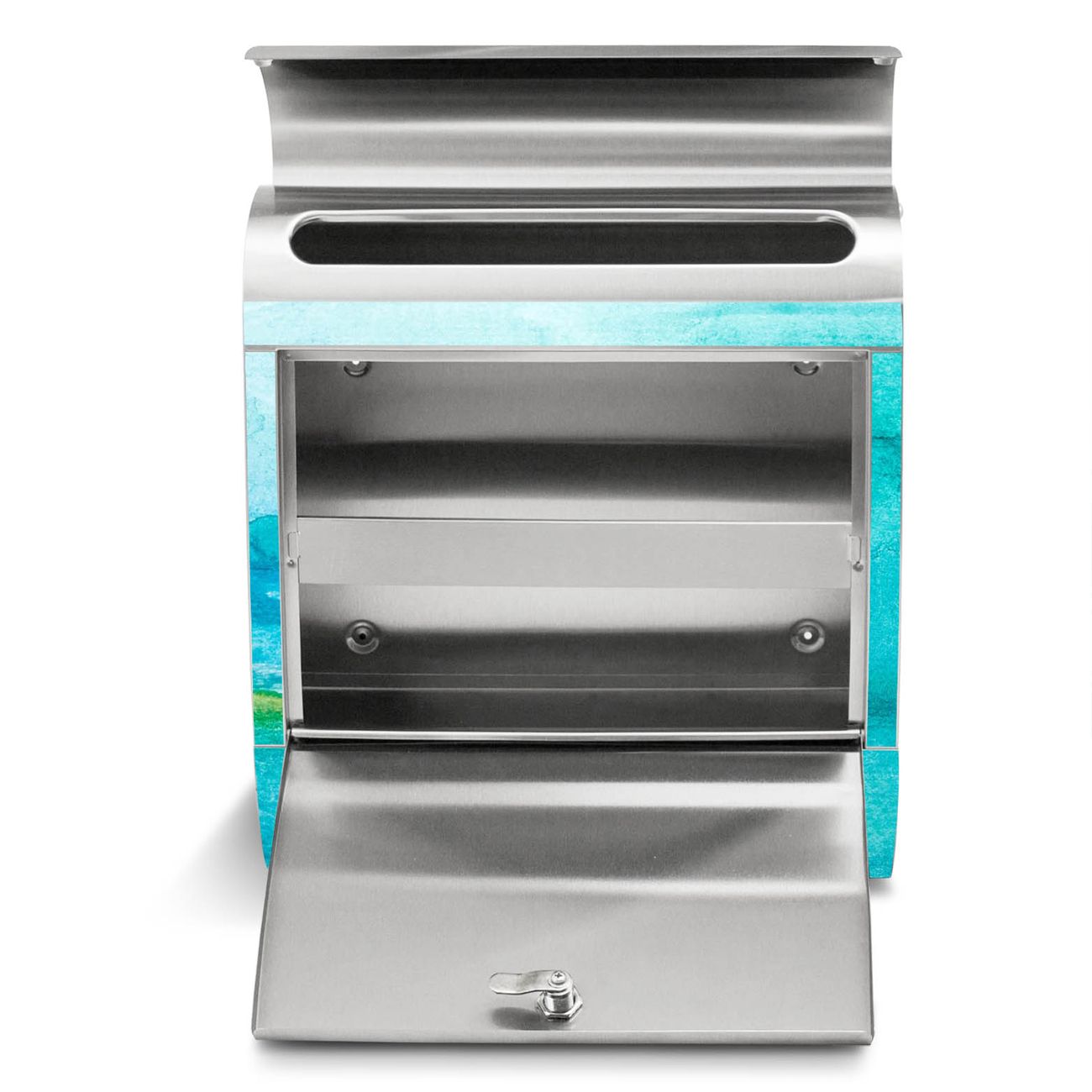 Der banjado Edelstahl Standbriefkasten mit Motiv Aquarell Blau und eigenem Wunschtext bietet Ihnen mit seinem Fassungsvermögen genügend Platz auch für große A4 Sendungen. Das integrierte Zeitungsfach eignet sich hervorragend, um unkompliziert die Tageszeitung zu fassen.