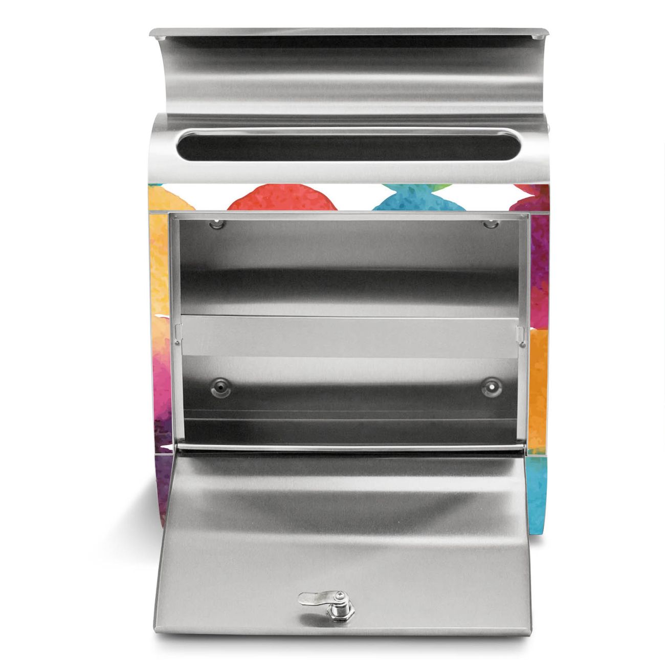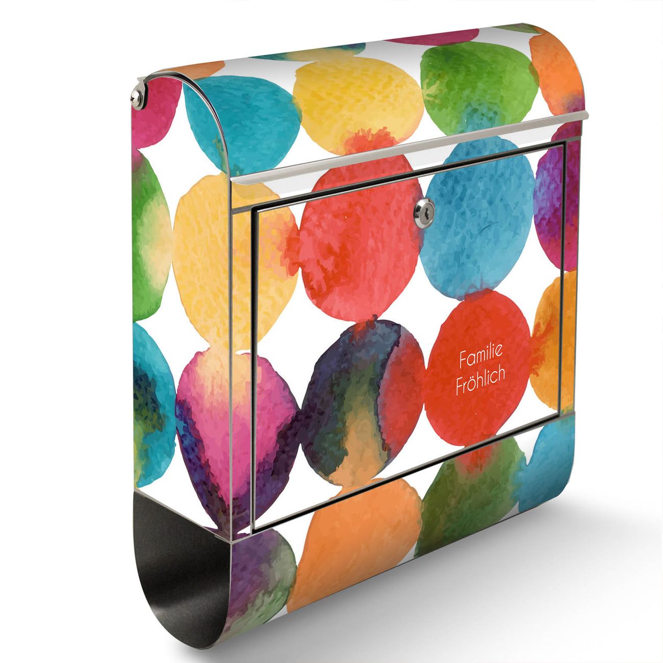 Der Motivstandbriefkasten hat ein sehr ansprechendes und ausgefallenes Design, damit entlocken Sie Ihren Nachbarn und dem Postboten ein Lächeln. Heben Sie Sich ab von der tristen grauen Masse, ohne auf Funktionalität zu verzichten. Der Briefkasten besteht aus hochwertigem 18/0 Edelstahl und die Wetter- und UV-resistenten Folie mit Aquarell Kreise Motiv ist zusätzlich mit einem Schutzlaminat überzogen. Der Standbriefkasten wird mit Montagematerial und zwei Schlüsseln geliefert.