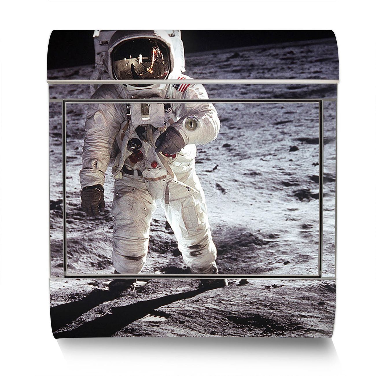 Der Motivstandbriefkasten hat ein sehr ansprechendes und ausgefallenes Design, damit entlocken Sie Ihren Nachbarn und dem Postboten ein Lächeln. Heben Sie Sich ab von der tristen grauen Masse, ohne auf Funktionalität zu verzichten. Der Briefkasten besteht aus hochwertigem 18/0 Edelstahl und die Wetter- und UV-resistenten Folie mit Astronaut Motiv ist zusätzlich mit einem Schutzlaminat überzogen. Der Standbriefkasten wird mit Montagematerial und zwei Schlüsseln geliefert.