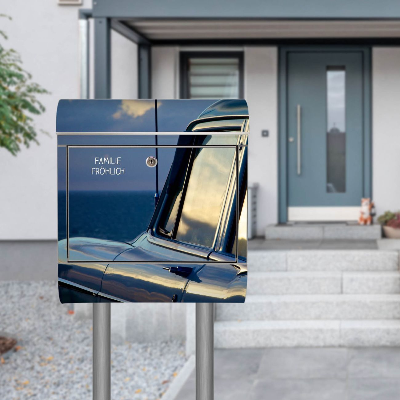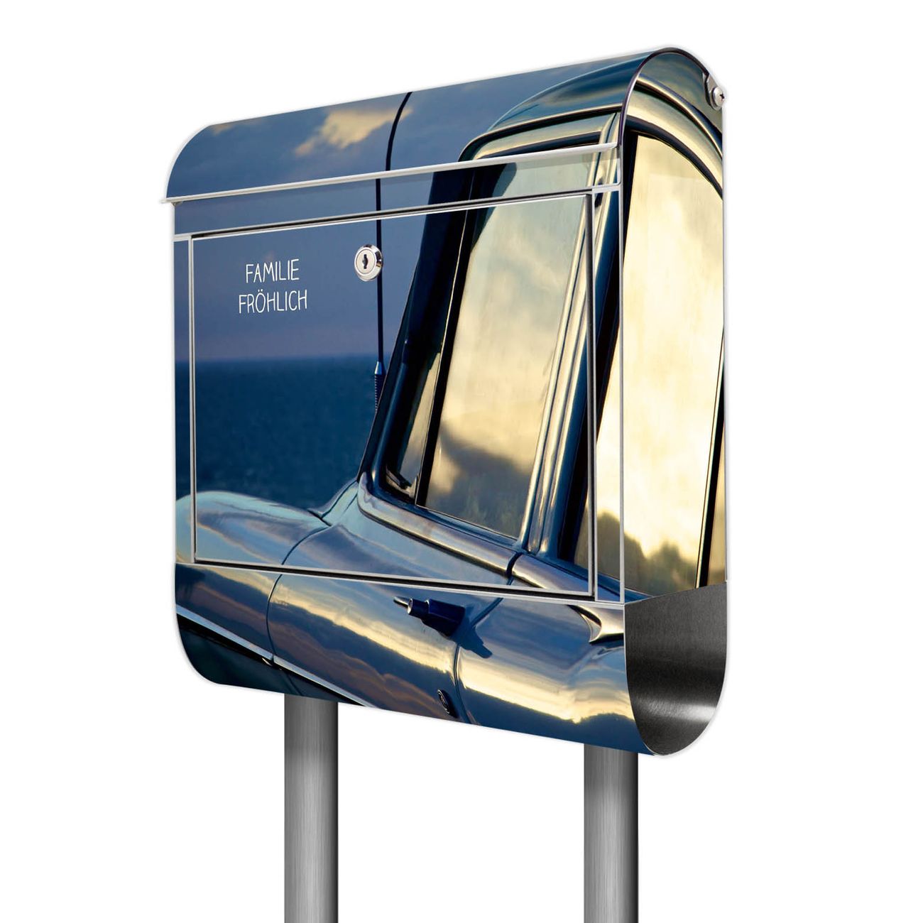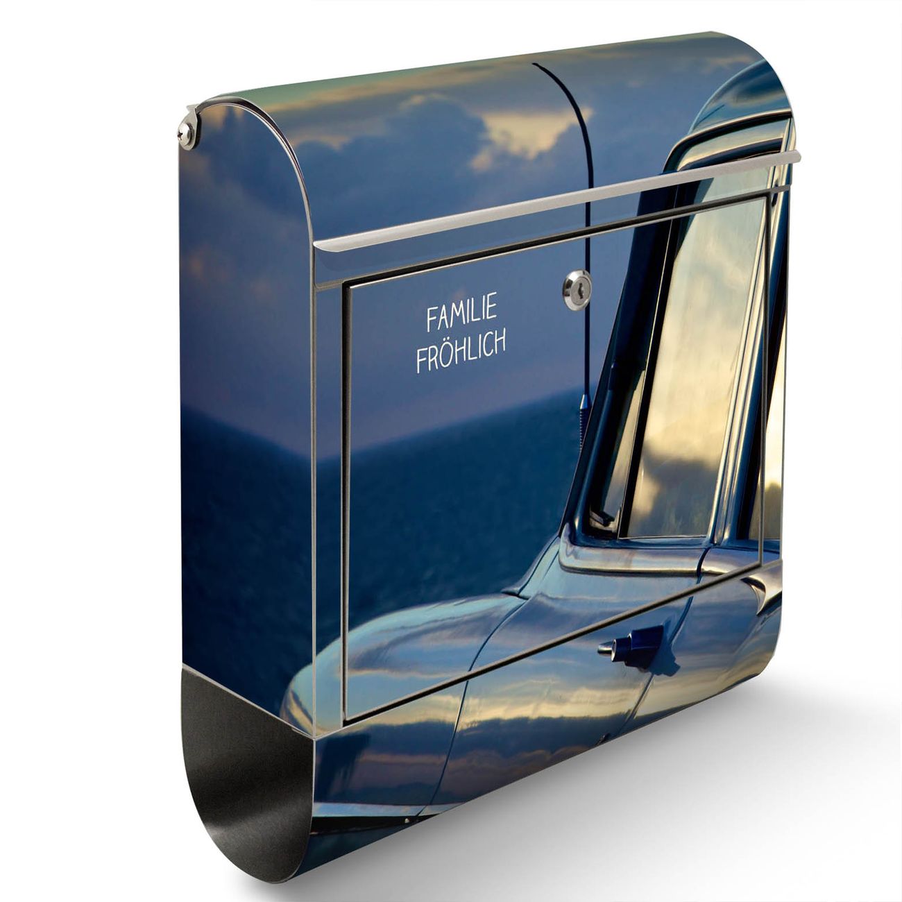 Der banjado Edelstahl Standbriefkasten mit Motiv Auto am Strand und eigenem Wunschtext bietet Ihnen mit seinem Fassungsvermögen genügend Platz auch für große A4 Sendungen. Das integrierte Zeitungsfach eignet sich hervorragend, um unkompliziert die Tageszeitung zu fassen.