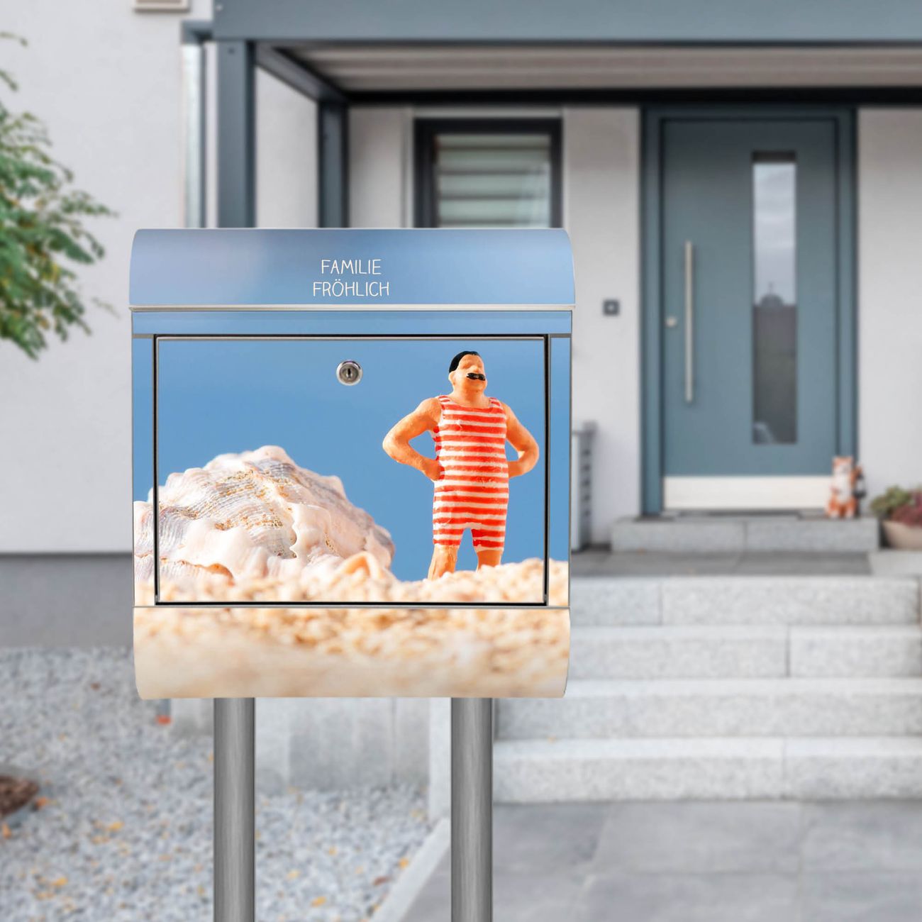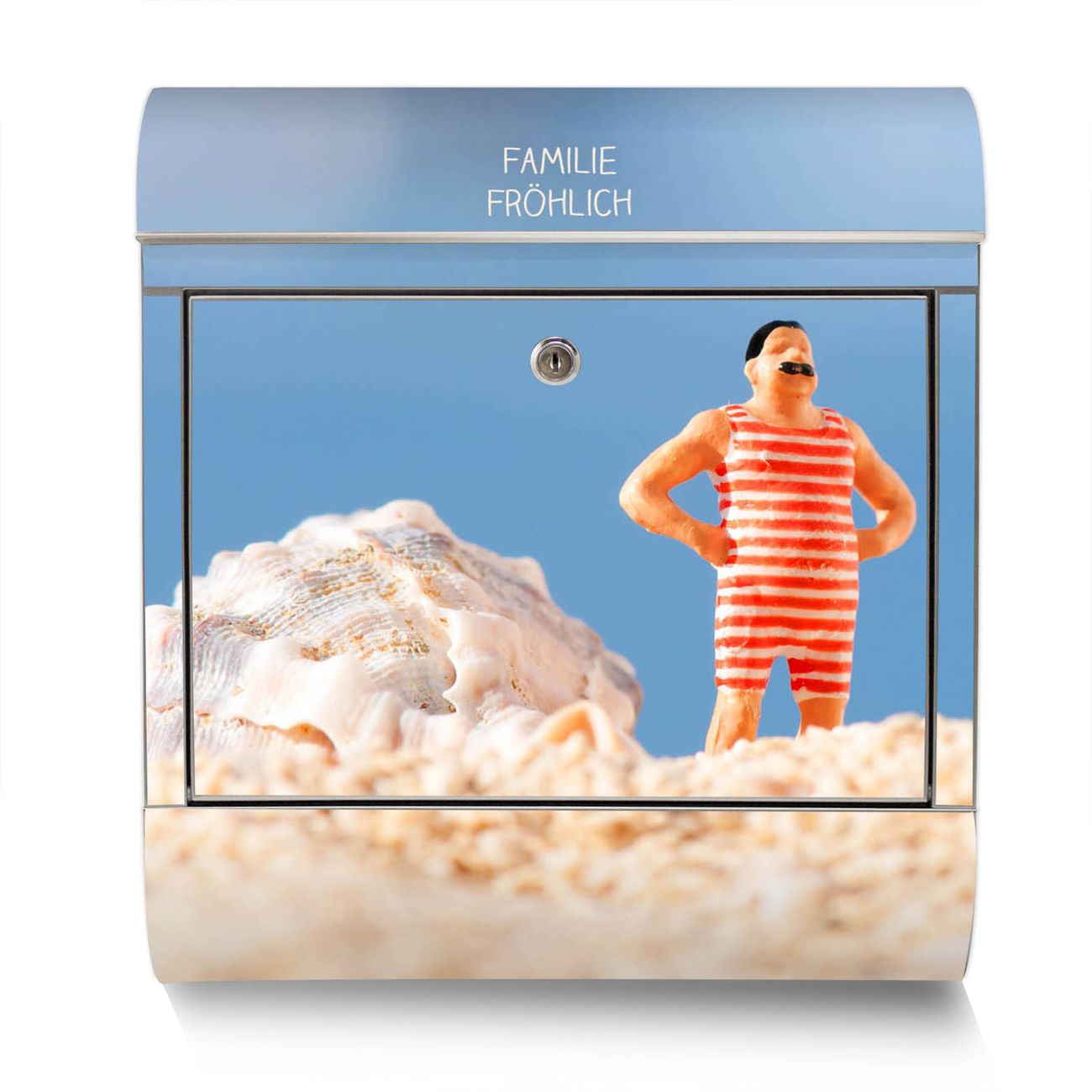 Der Motivstandbriefkasten hat ein sehr ansprechendes und ausgefallenes Design, damit entlocken Sie Ihren Nachbarn und dem Postboten ein Lächeln. Heben Sie Sich ab von der tristen grauen Masse, ohne auf Funktionalität zu verzichten. Der Briefkasten besteht aus hochwertigem 18/0 Edelstahl und die Wetter- und UV-resistenten Folie mit Bademeister Motiv ist zusätzlich mit einem Schutzlaminat überzogen. Der Standbriefkasten wird mit Montagematerial und zwei Schlüsseln geliefert.