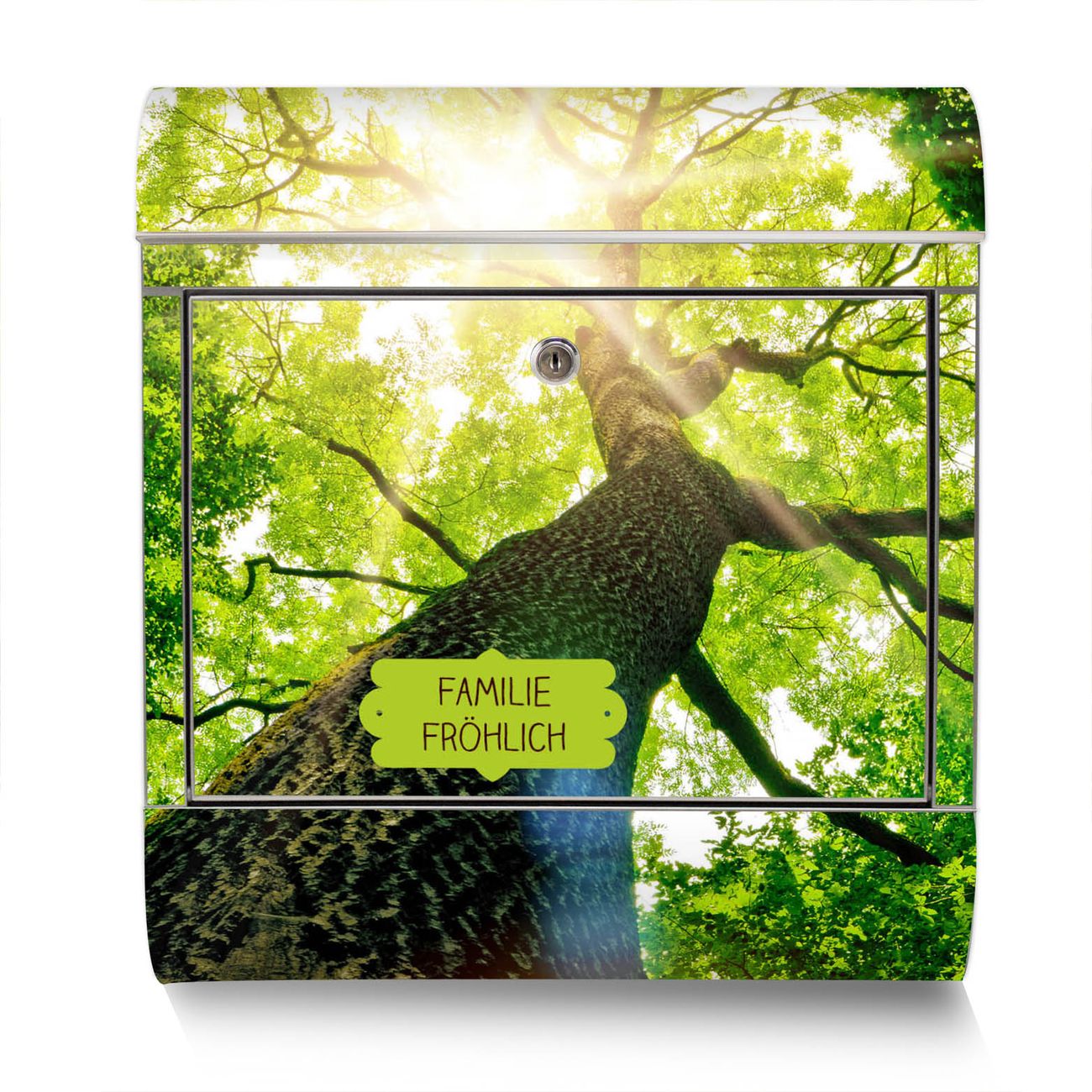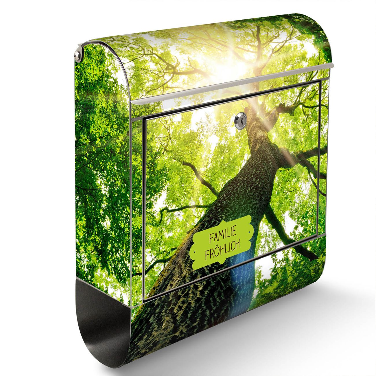 Der Motivstandbriefkasten hat ein sehr ansprechendes und ausgefallenes Design, damit entlocken Sie Ihren Nachbarn und dem Postboten ein Lächeln. Heben Sie Sich ab von der tristen grauen Masse, ohne auf Funktionalität zu verzichten. Der Briefkasten besteht aus hochwertigem 18/0 Edelstahl und die Wetter- und UV-resistenten Folie mit Baumkrone Motiv ist zusätzlich mit einem Schutzlaminat überzogen. Der Standbriefkasten wird mit Montagematerial und zwei Schlüsseln geliefert.