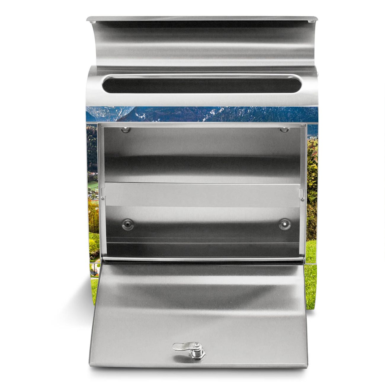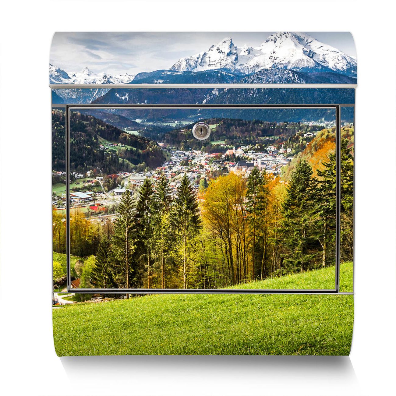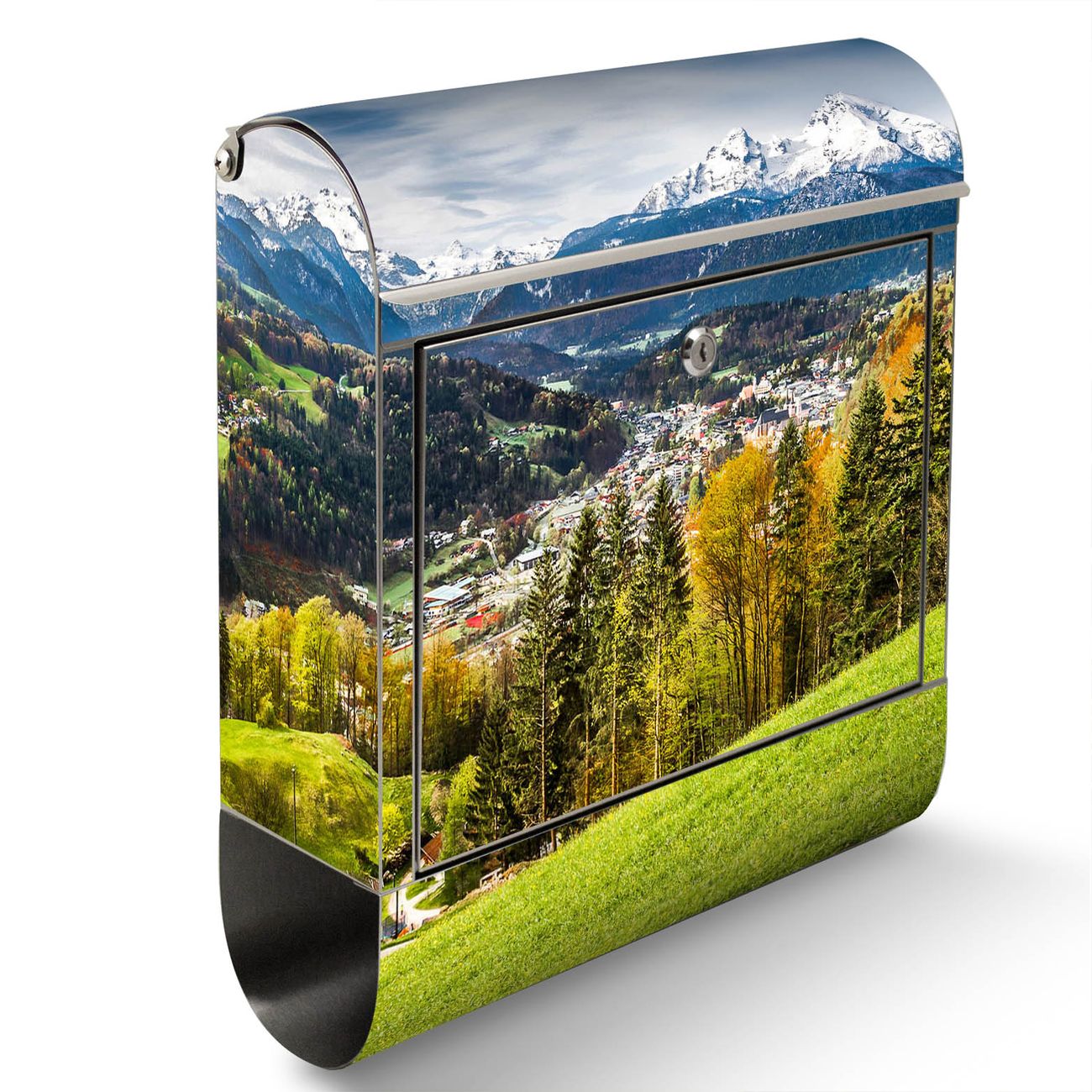 Der Motivstandbriefkasten hat ein sehr ansprechendes und ausgefallenes Design, damit entlocken Sie Ihren Nachbarn und dem Postboten ein Lächeln. Heben Sie Sich ab von der tristen grauen Masse, ohne auf Funktionalität zu verzichten. Der Briefkasten besteht aus hochwertigem 18/0 Edelstahl und die Wetter- und UV-resistenten Folie mit Berchtesgadener Land Motiv ist zusätzlich mit einem Schutzlaminat überzogen. Der Standbriefkasten wird mit Montagematerial und zwei Schlüsseln geliefert.