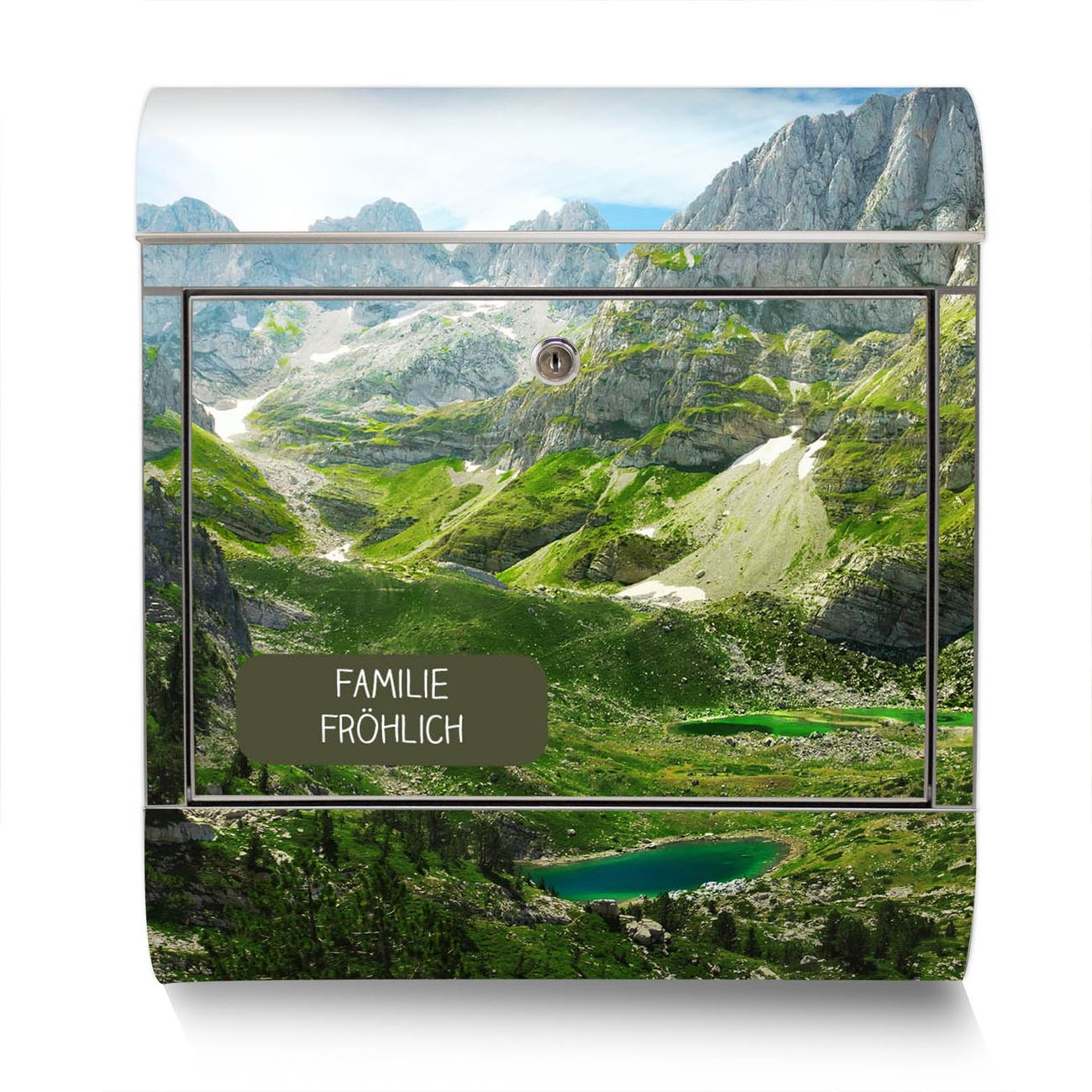 Der Motivstandbriefkasten hat ein sehr ansprechendes und ausgefallenes Design, damit entlocken Sie Ihren Nachbarn und dem Postboten ein Lächeln. Heben Sie Sich ab von der tristen grauen Masse, ohne auf Funktionalität zu verzichten. Der Briefkasten besteht aus hochwertigem 18/0 Edelstahl und die Wetter- und UV-resistenten Folie mit Bergsee Alpen Motiv ist zusätzlich mit einem Schutzlaminat überzogen. Der Standbriefkasten wird mit Montagematerial und zwei Schlüsseln geliefert.