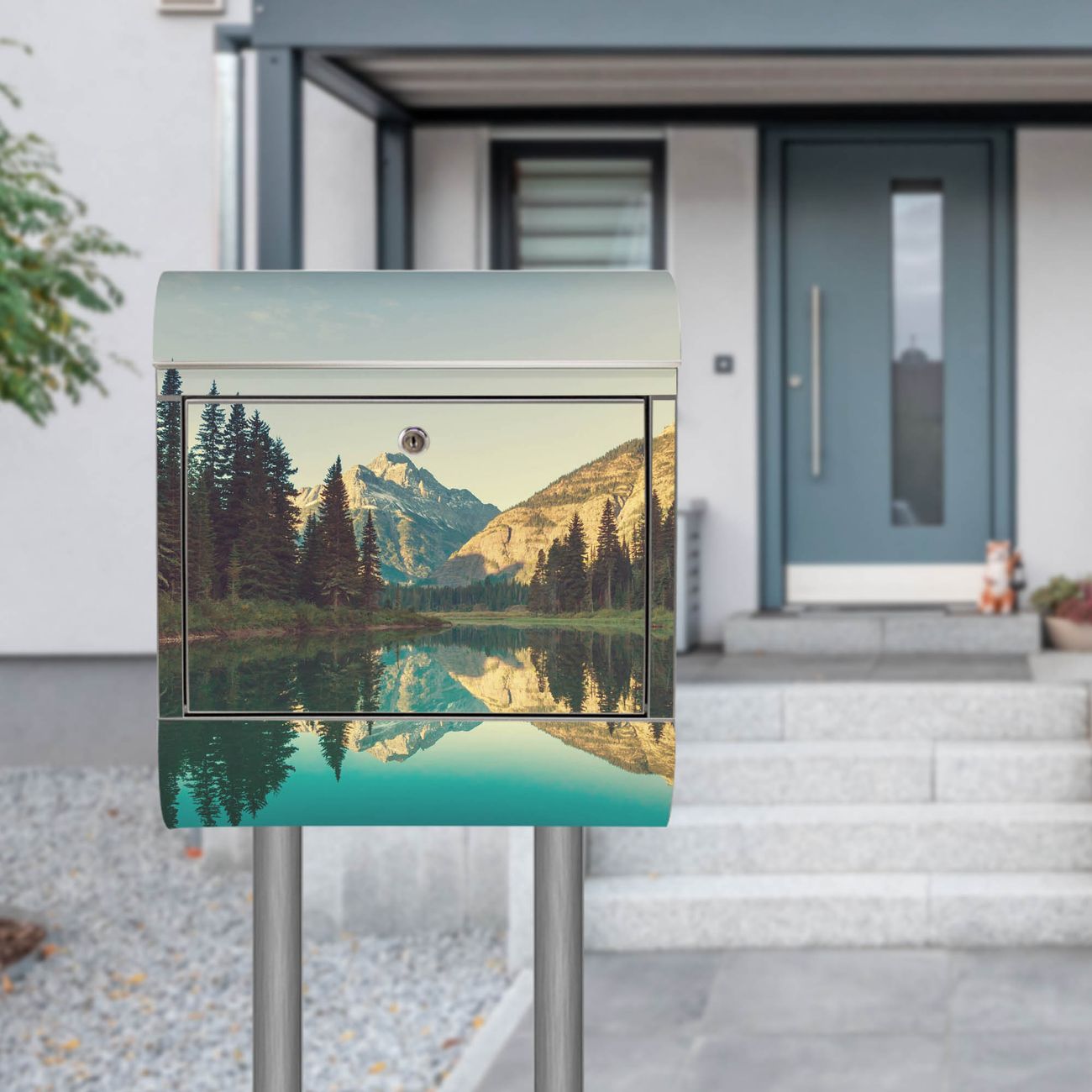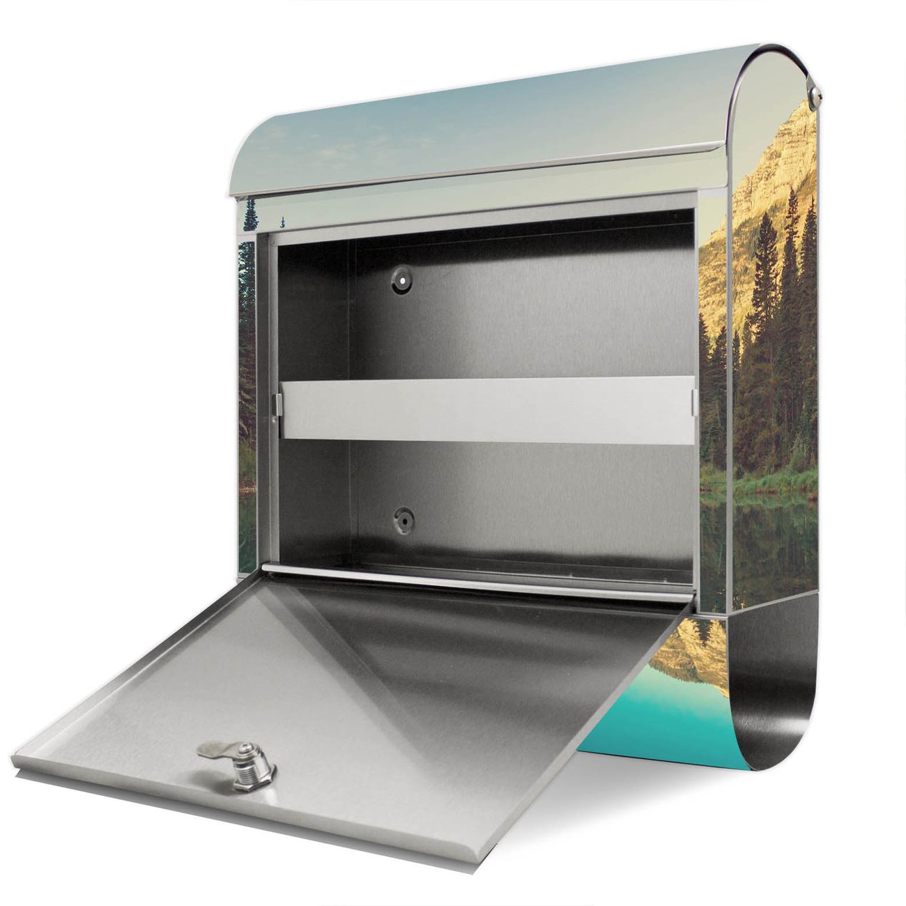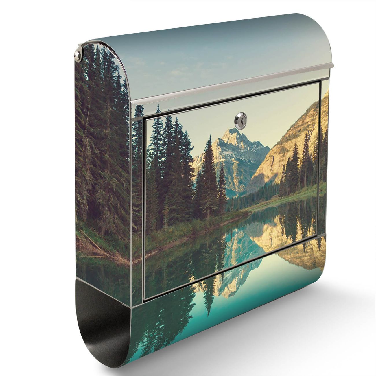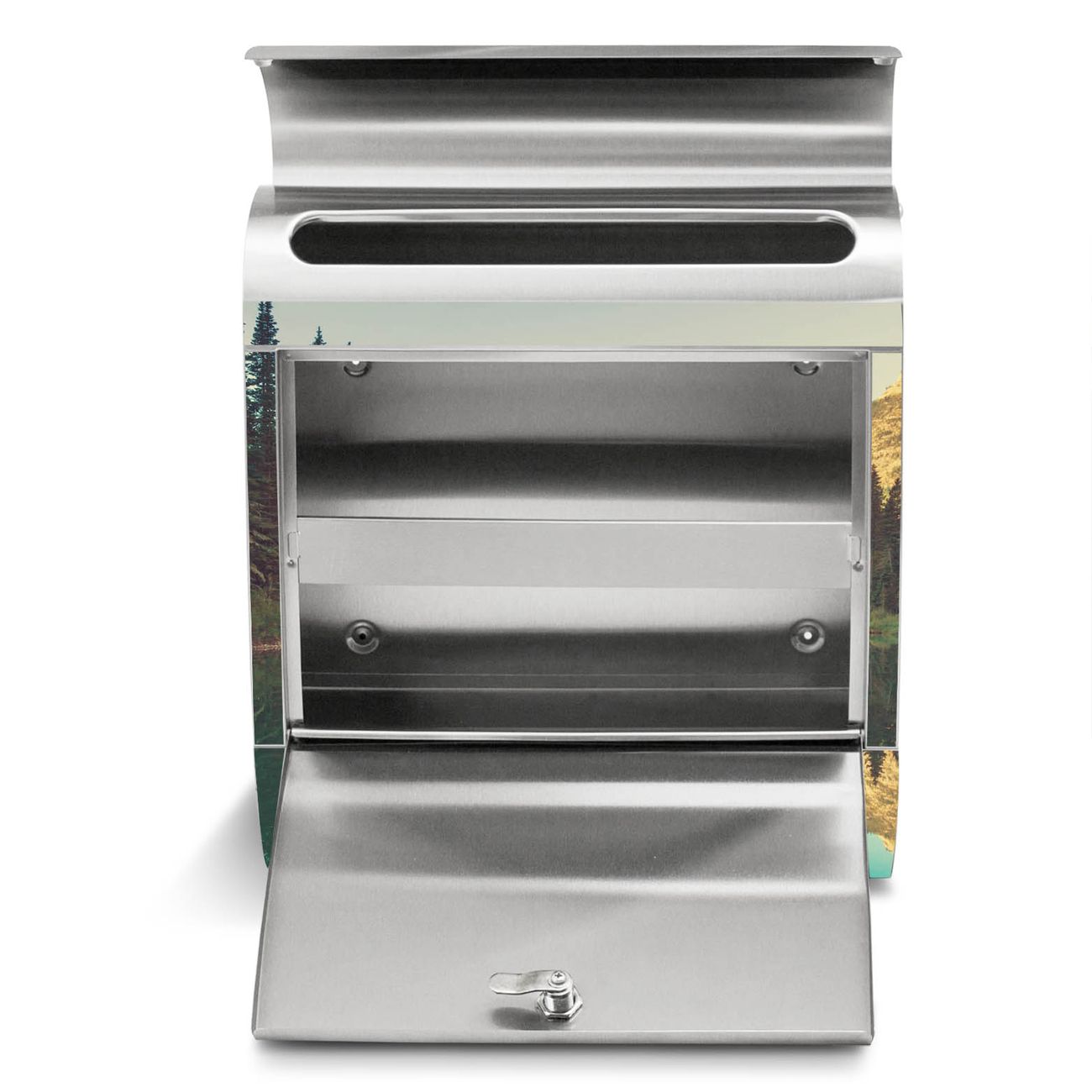 Der banjado Edelstahl Standbriefkasten mit Motiv Bergsee bietet Ihnen mit seinem Fassungsvermögen genügend Platz auch für große A4 Sendungen. Das integrierte Zeitungsfach eignet sich hervorragend, um unkompliziert die Tageszeitung zu fassen.