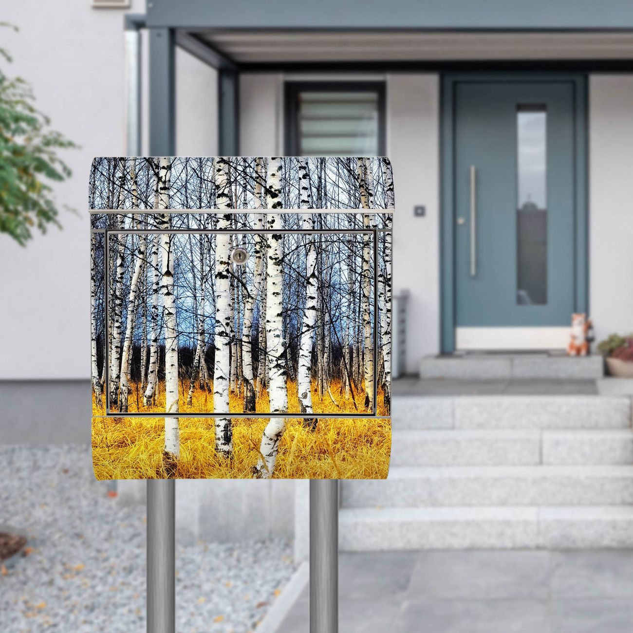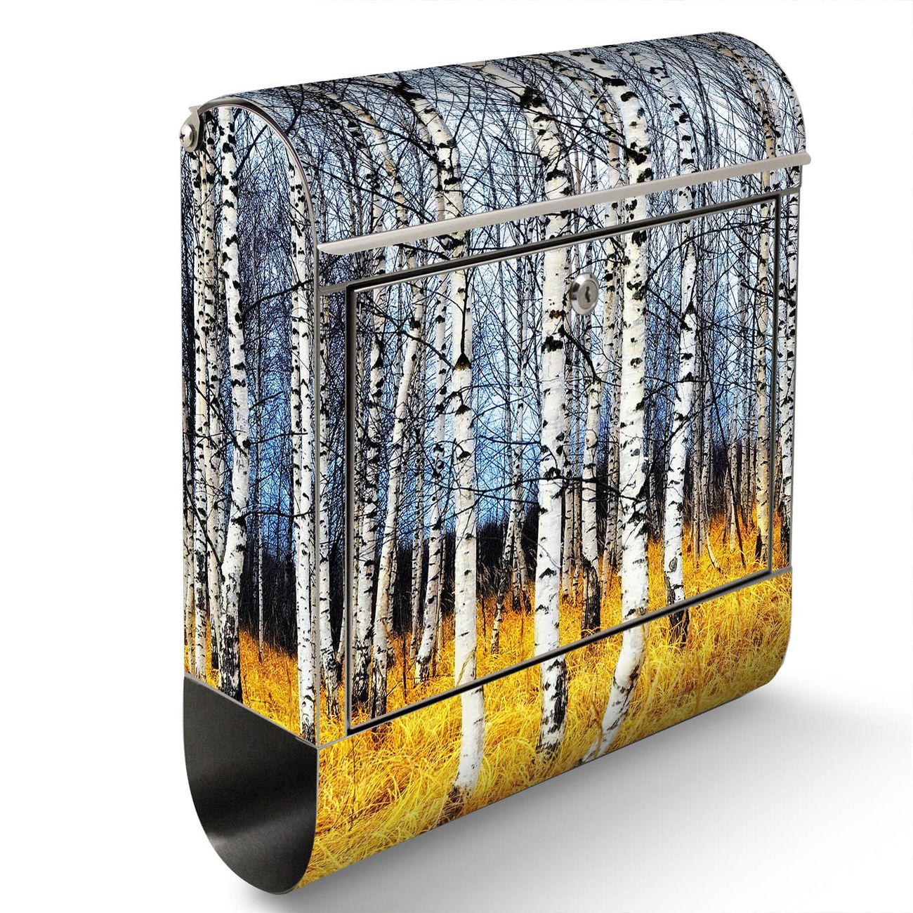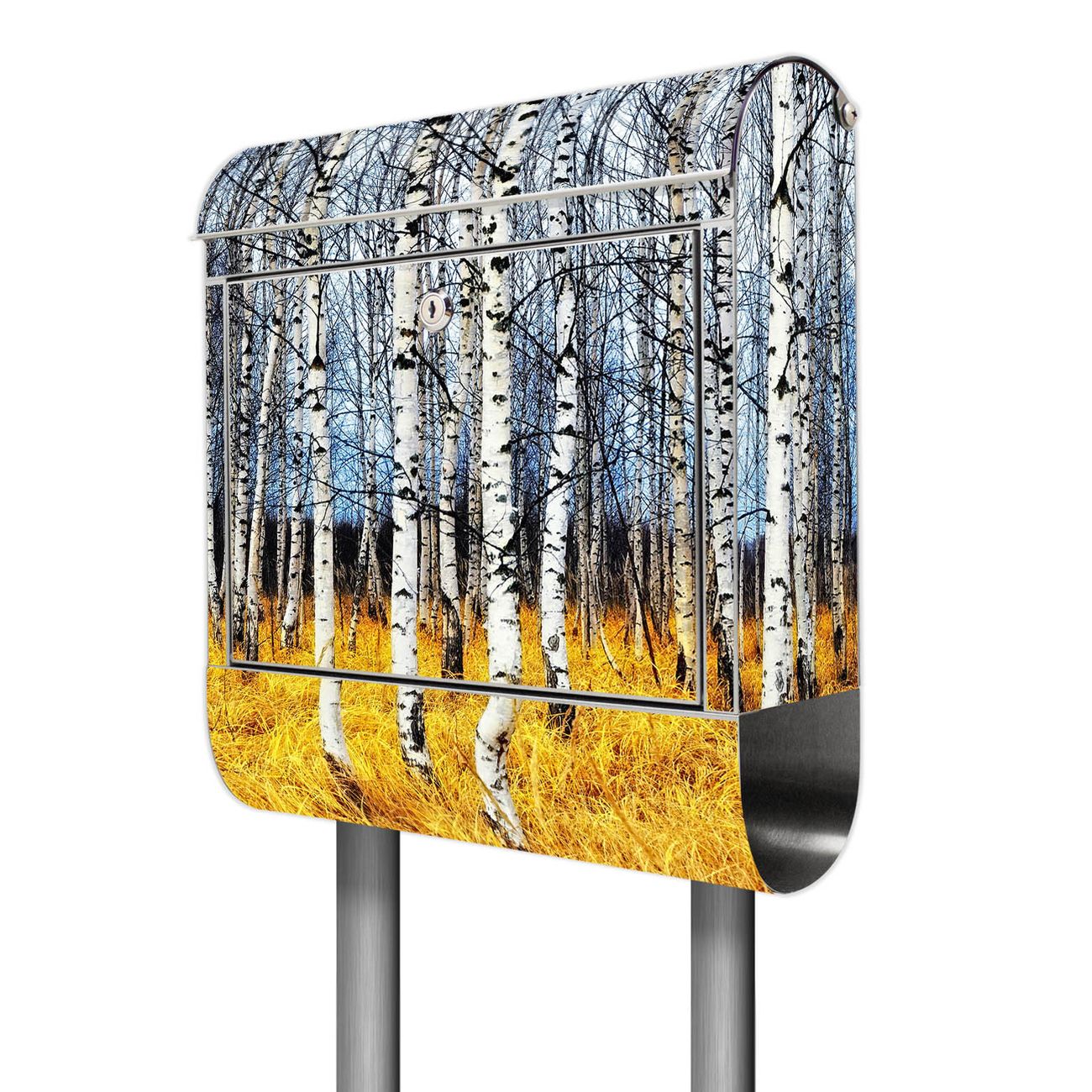 Der Motivstandbriefkasten hat ein sehr ansprechendes und ausgefallenes Design, damit entlocken Sie Ihren Nachbarn und dem Postboten ein Lächeln. Heben Sie Sich ab von der tristen grauen Masse, ohne auf Funktionalität zu verzichten. Der Briefkasten besteht aus hochwertigem 18/0 Edelstahl und die Wetter- und UV-resistenten Folie mit Birkenhain Motiv ist zusätzlich mit einem Schutzlaminat überzogen. Der Standbriefkasten wird mit Montagematerial und zwei Schlüsseln geliefert.
