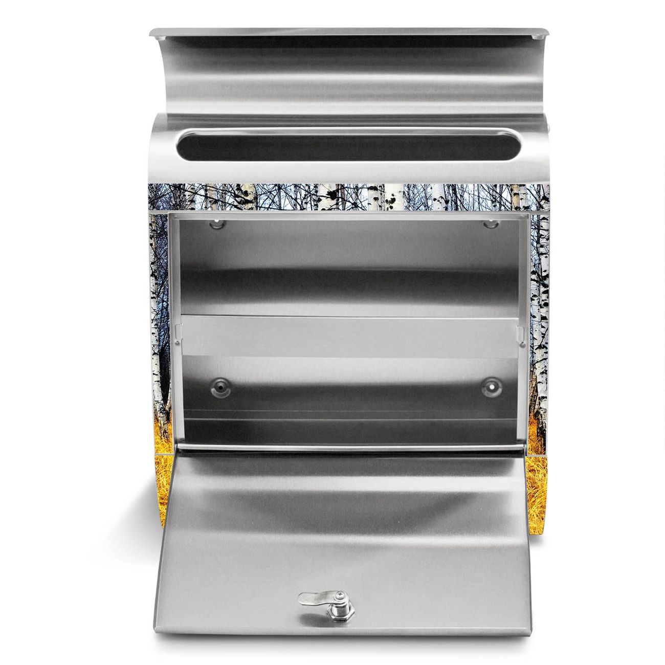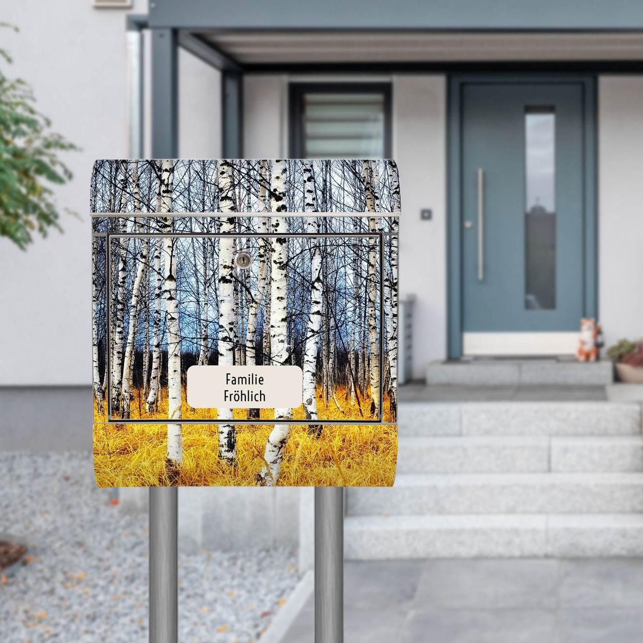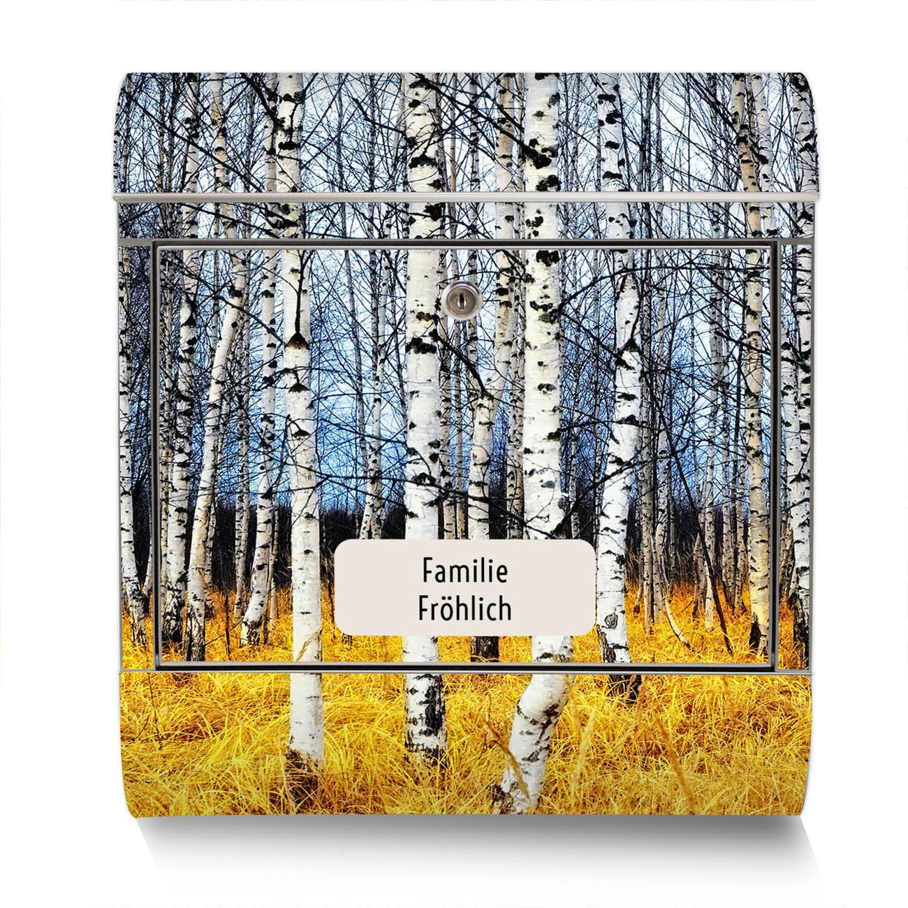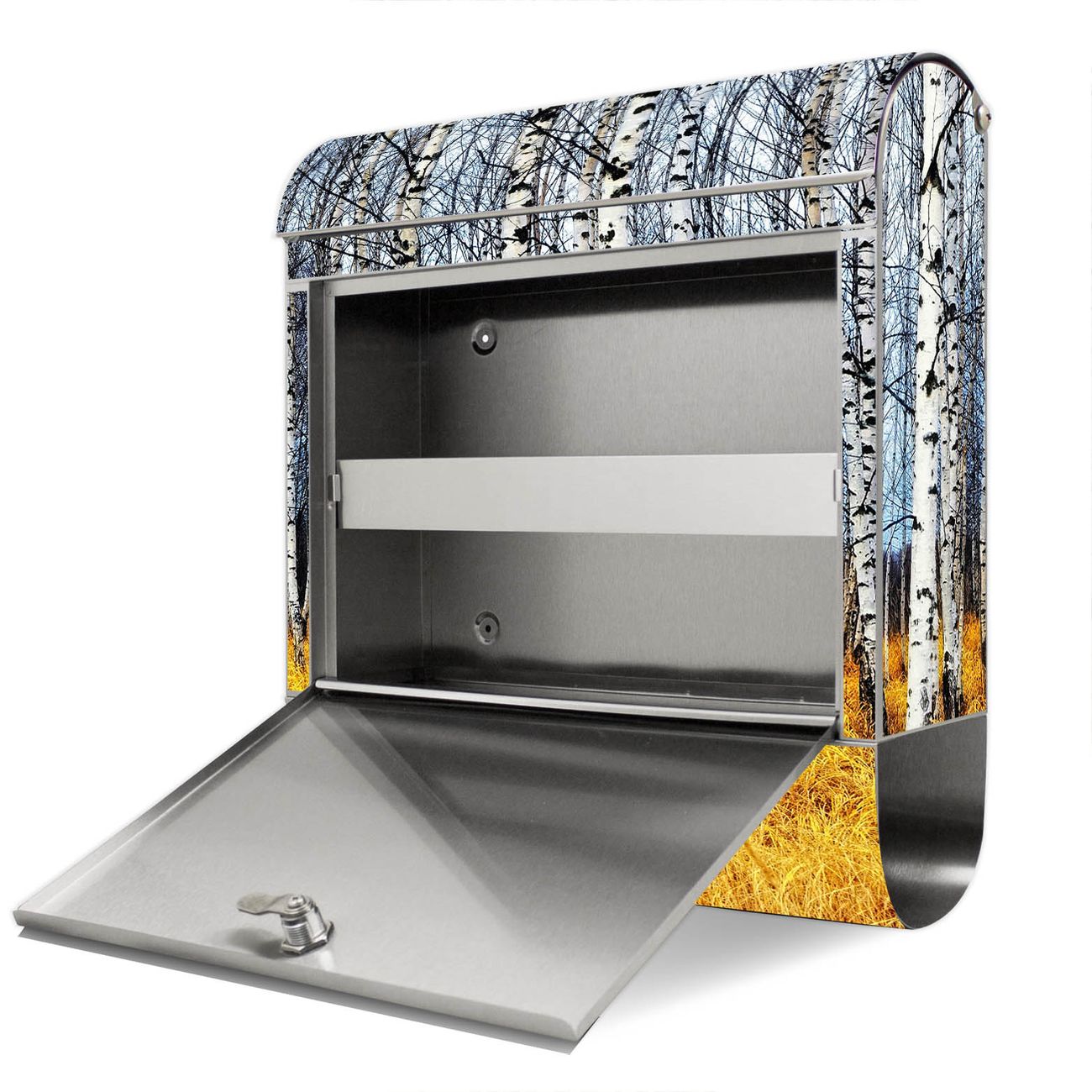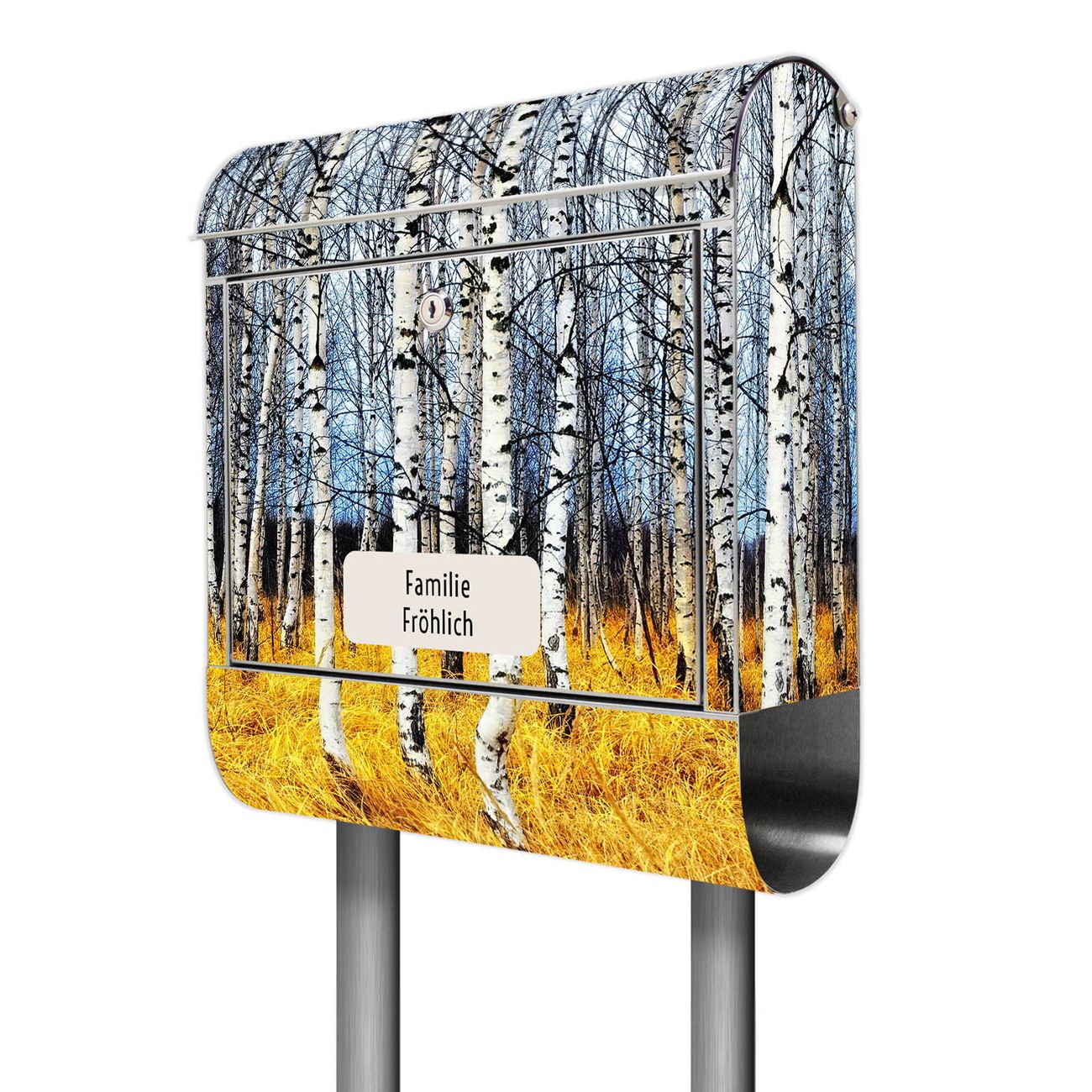Der Motivstandbriefkasten hat ein sehr ansprechendes und ausgefallenes Design, damit entlocken Sie Ihren Nachbarn und dem Postboten ein Lächeln. Heben Sie Sich ab von der tristen grauen Masse, ohne auf Funktionalität zu verzichten. Der Briefkasten besteht aus hochwertigem 18/0 Edelstahl und die Wetter- und UV-resistenten Folie mit Birkenhain Motiv ist zusätzlich mit einem Schutzlaminat überzogen. Der Standbriefkasten wird mit Montagematerial und zwei Schlüsseln geliefert.