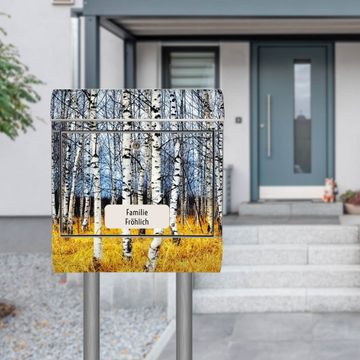 Der banjado Edelstahl Standbriefkasten mit Motiv Birkenhain und eigenem Wunschtext bietet Ihnen mit seinem Fassungsvermögen genügend Platz auch für große A4 Sendungen. Das integrierte Zeitungsfach eignet sich hervorragend, um unkompliziert die Tageszeitung zu fassen.