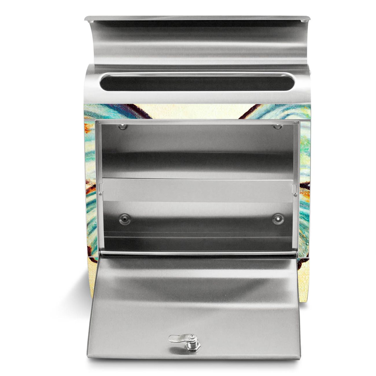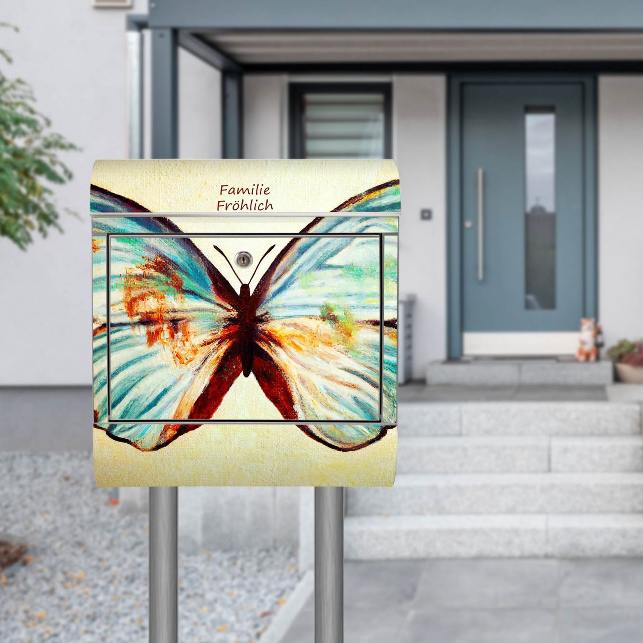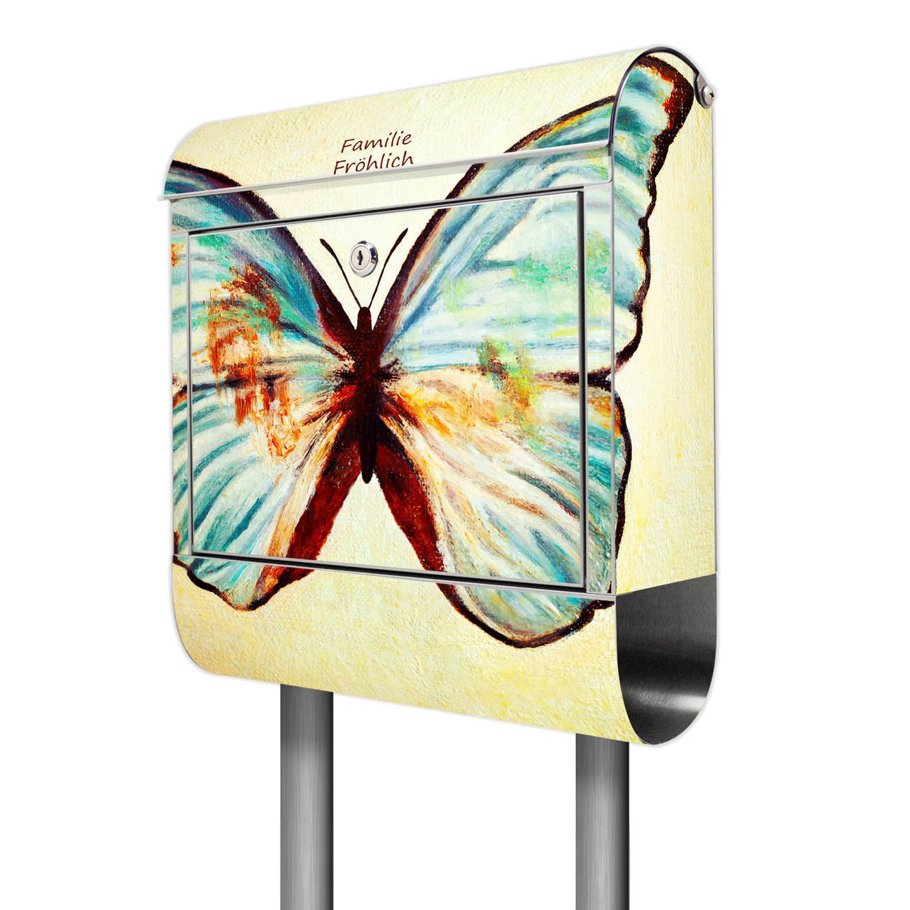 Der banjado Edelstahl Standbriefkasten mit Motiv Blauer Falter und eigenem Wunschtext bietet Ihnen mit seinem Fassungsvermögen genügend Platz auch für große A4 Sendungen. Das integrierte Zeitungsfach eignet sich hervorragend, um unkompliziert die Tageszeitung zu fassen.