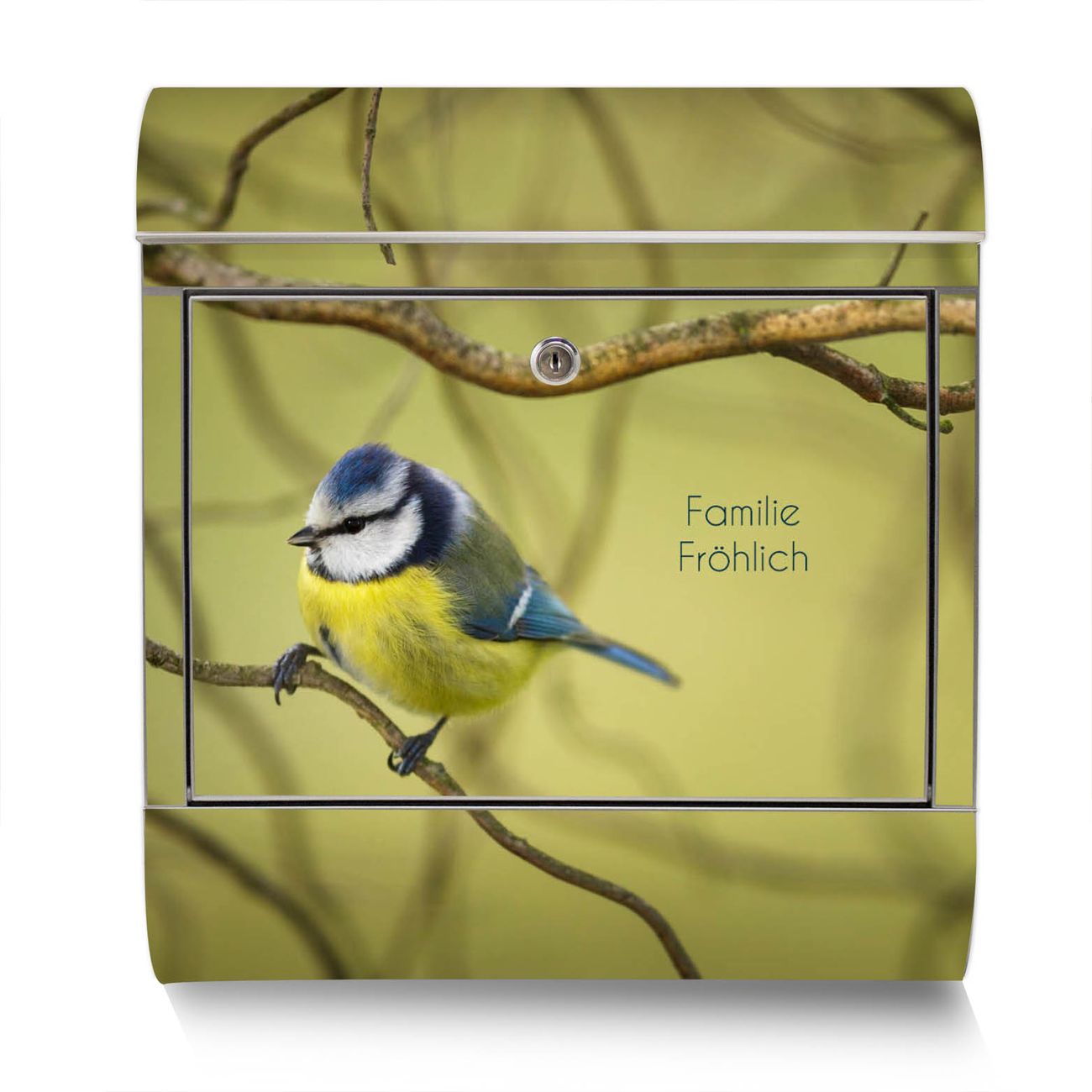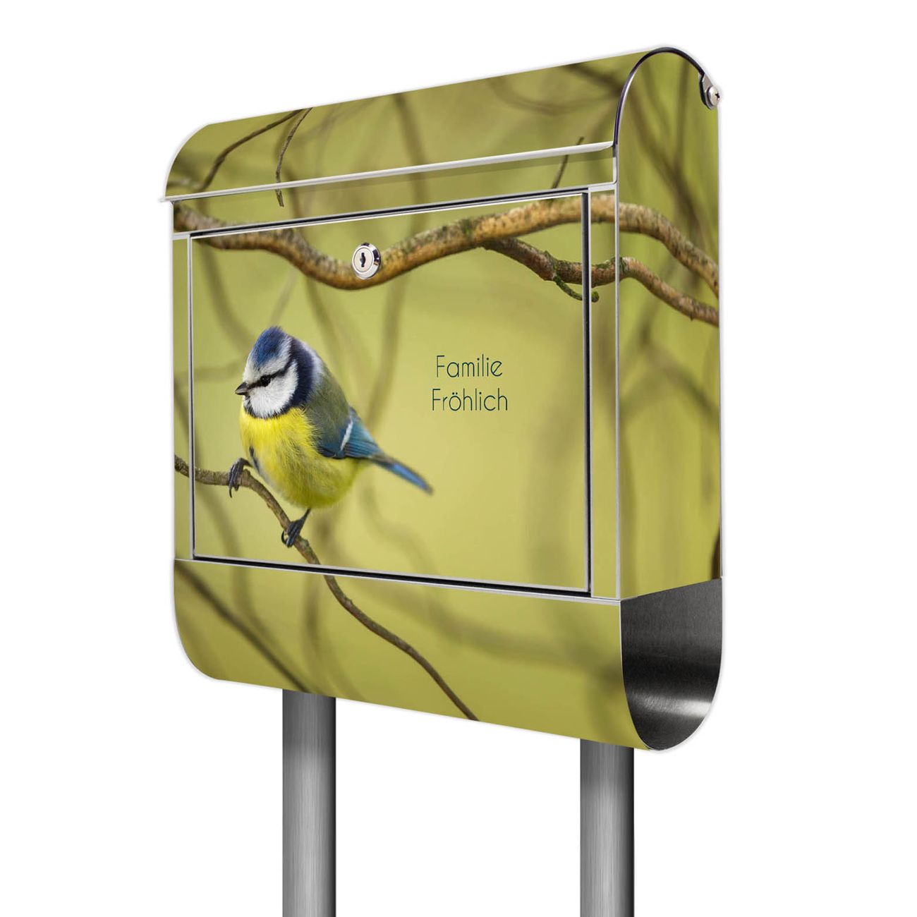 Standbriefkasten Edelstahl Blaumeise im Baum