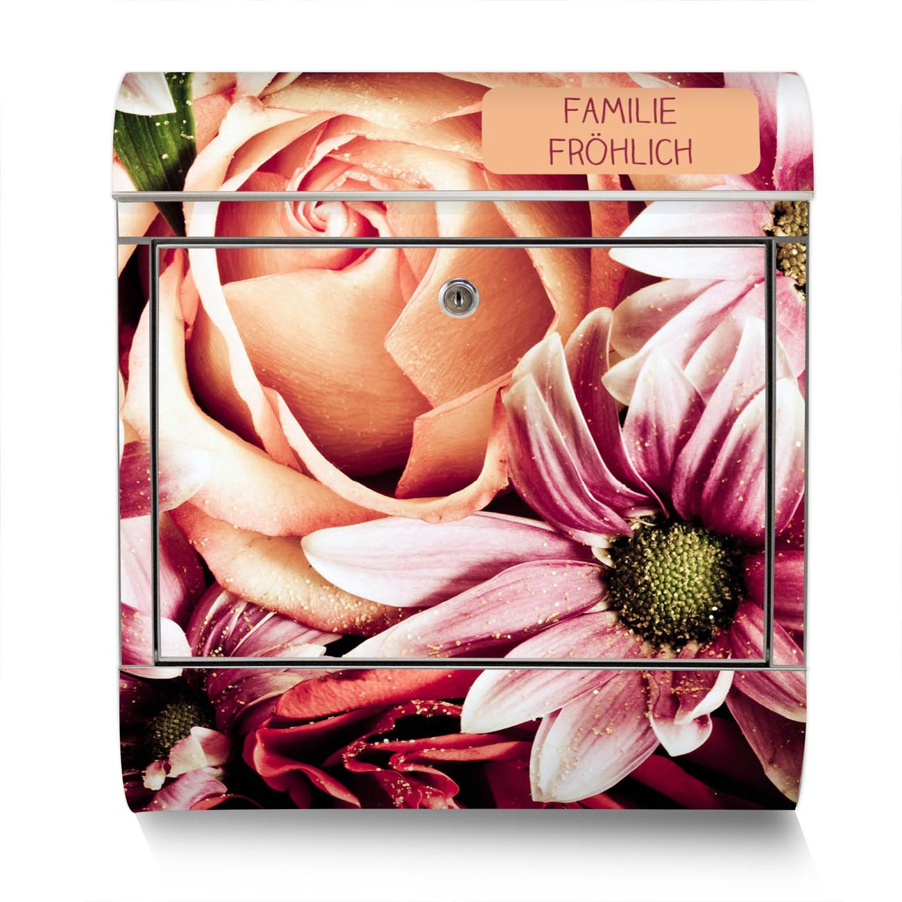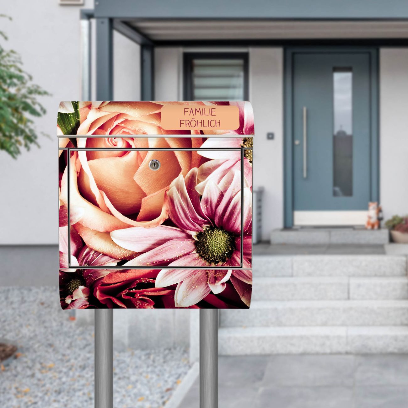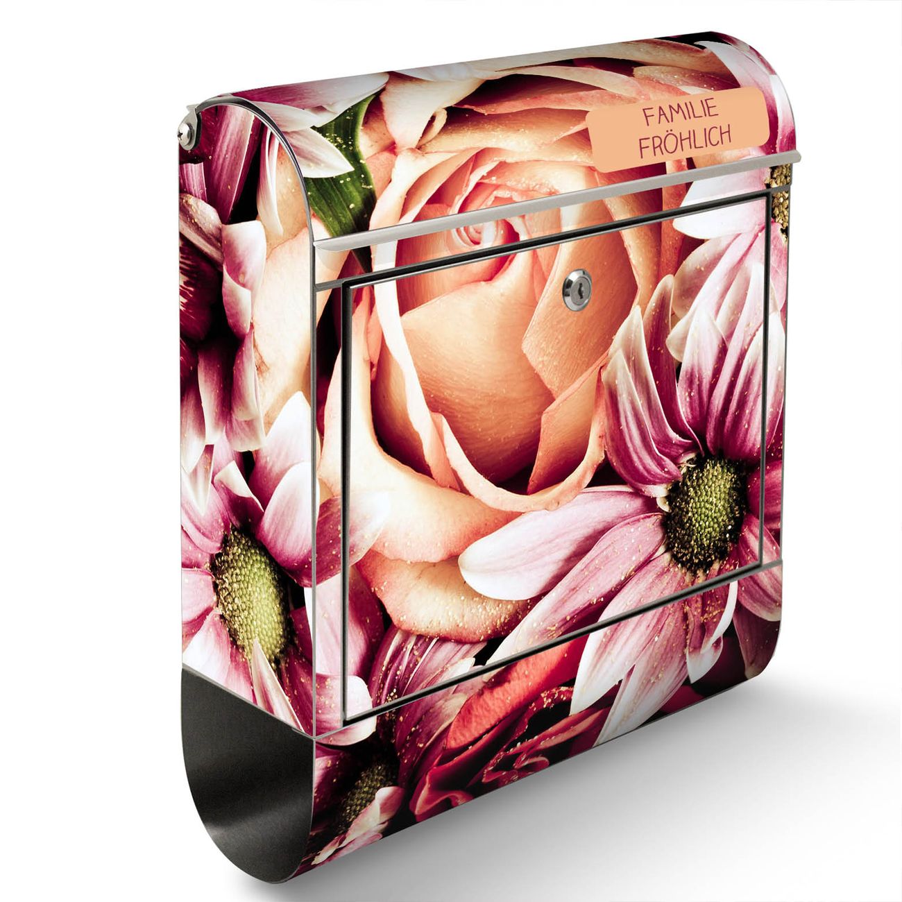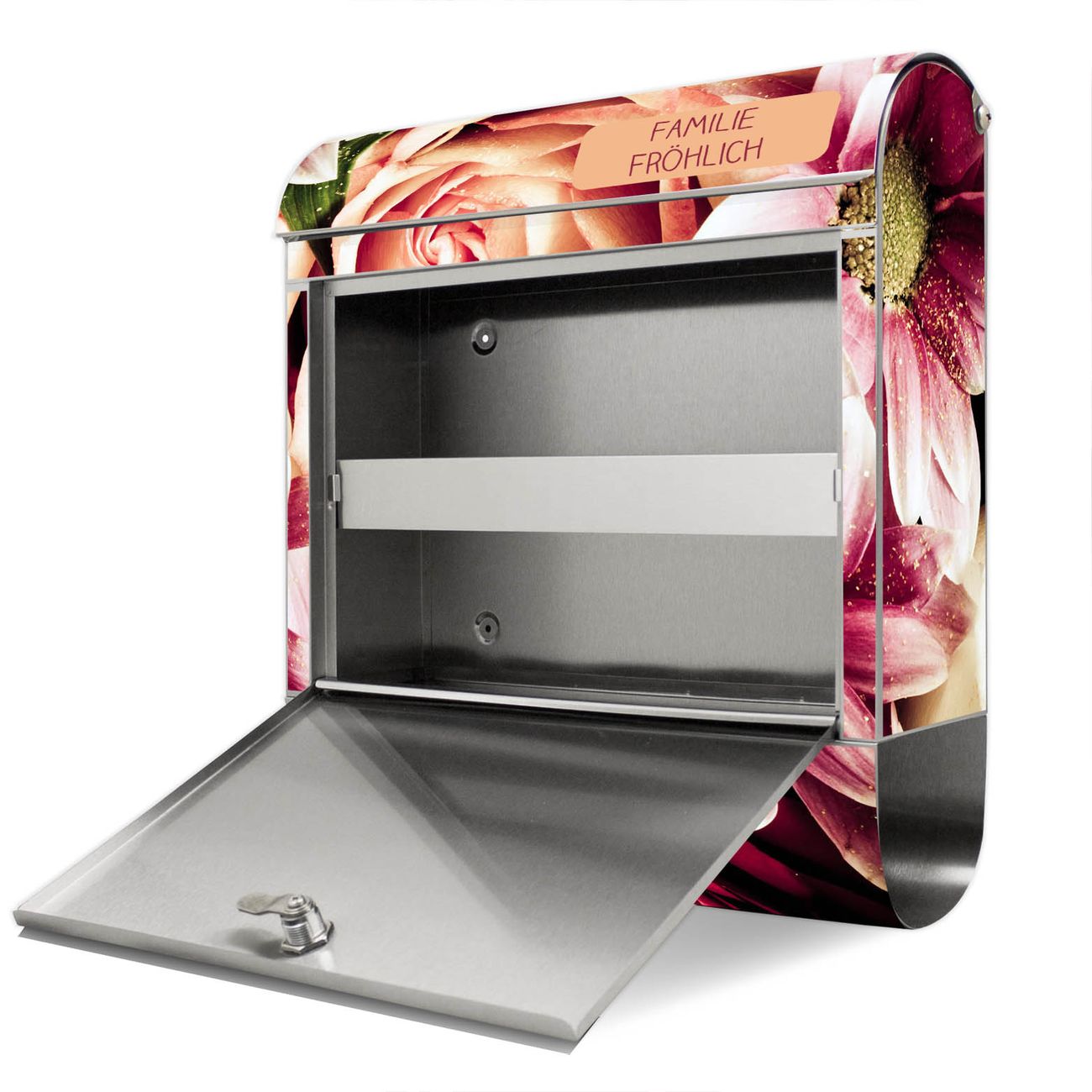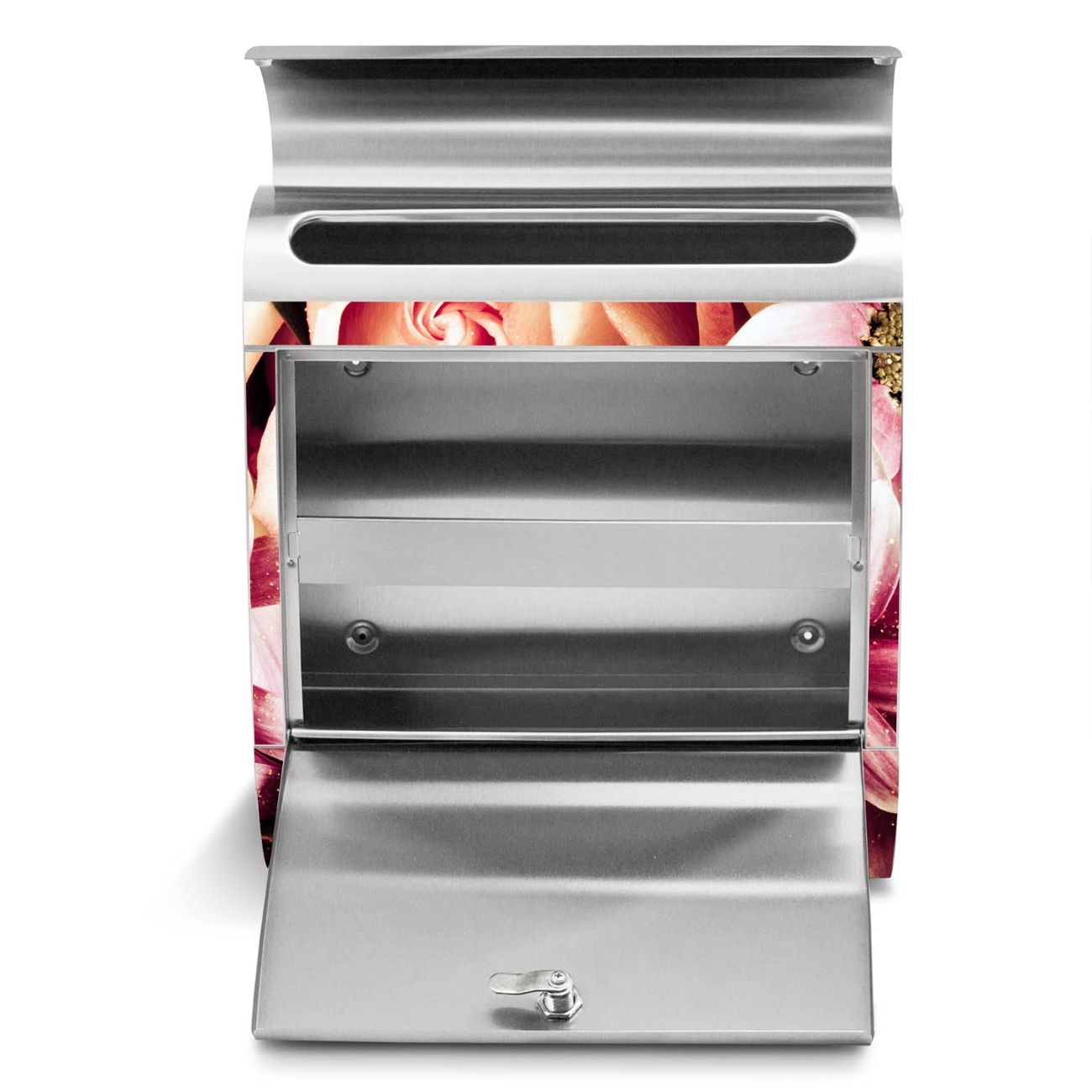 Der banjado Edelstahl Standbriefkasten mit Motiv Brautstrauss und eigenem Wunschtext bietet Ihnen mit seinem Fassungsvermögen genügend Platz auch für große A4 Sendungen. Das integrierte Zeitungsfach eignet sich hervorragend, um unkompliziert die Tageszeitung zu fassen.