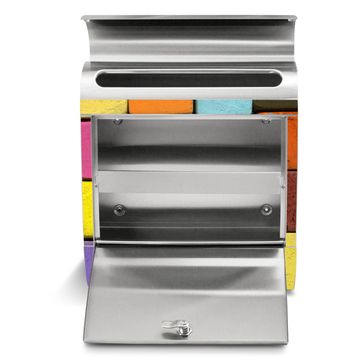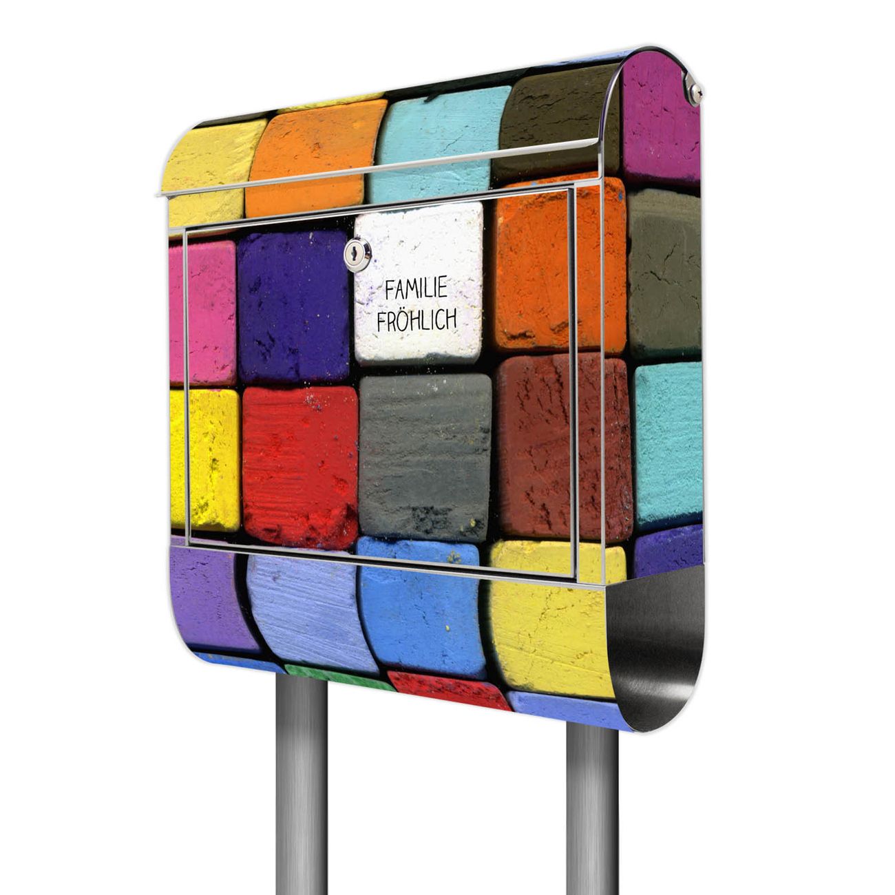 Der banjado Edelstahl Standbriefkasten mit Motiv Bunte Kreide und eigenem Wunschtext bietet Ihnen mit seinem Fassungsvermögen genügend Platz auch für große A4 Sendungen. Das integrierte Zeitungsfach eignet sich hervorragend, um unkompliziert die Tageszeitung zu fassen.