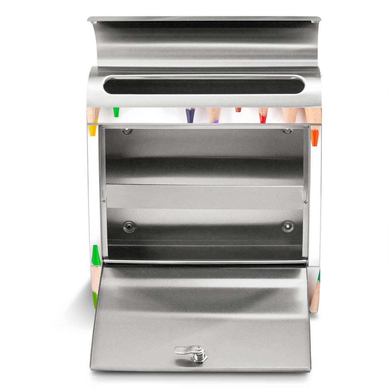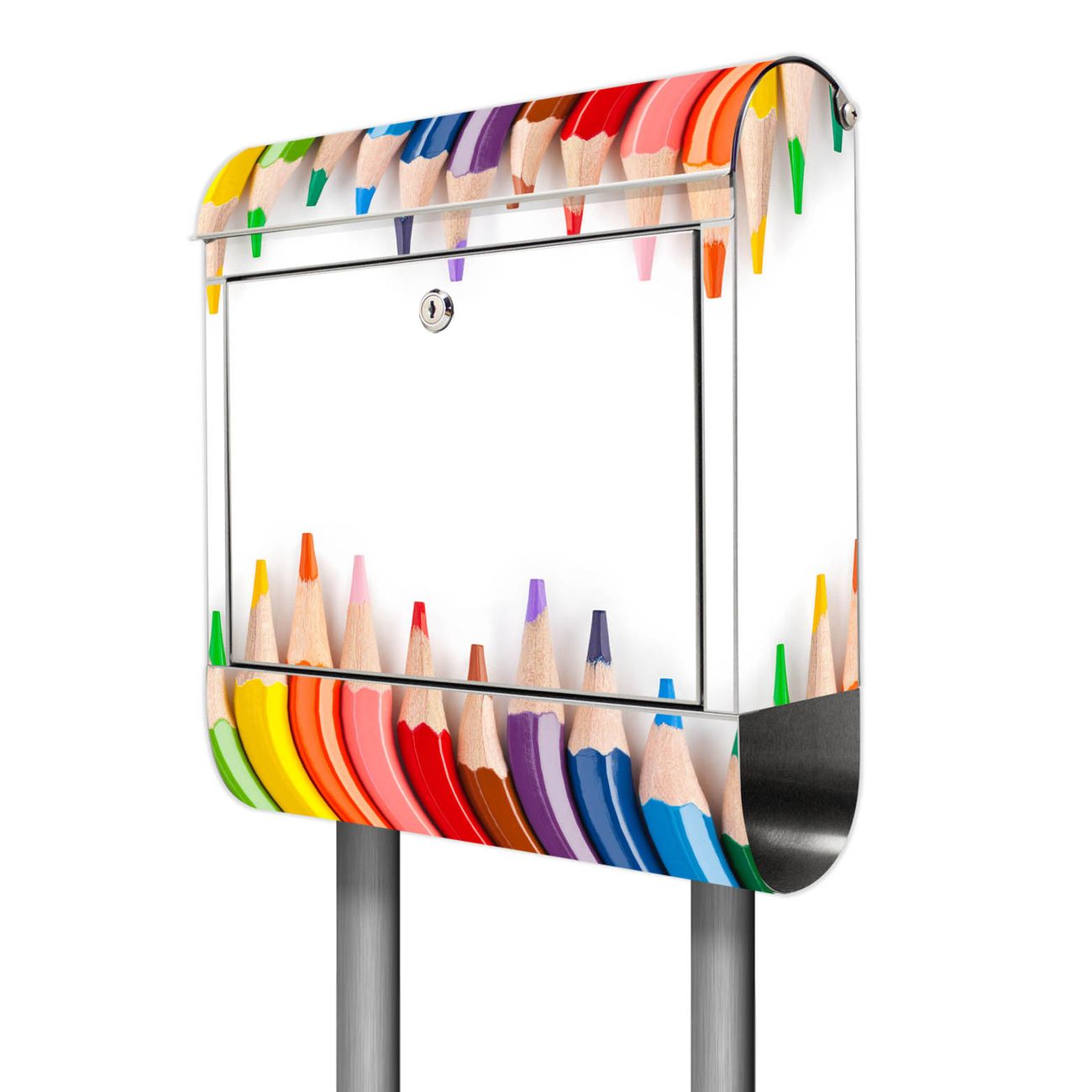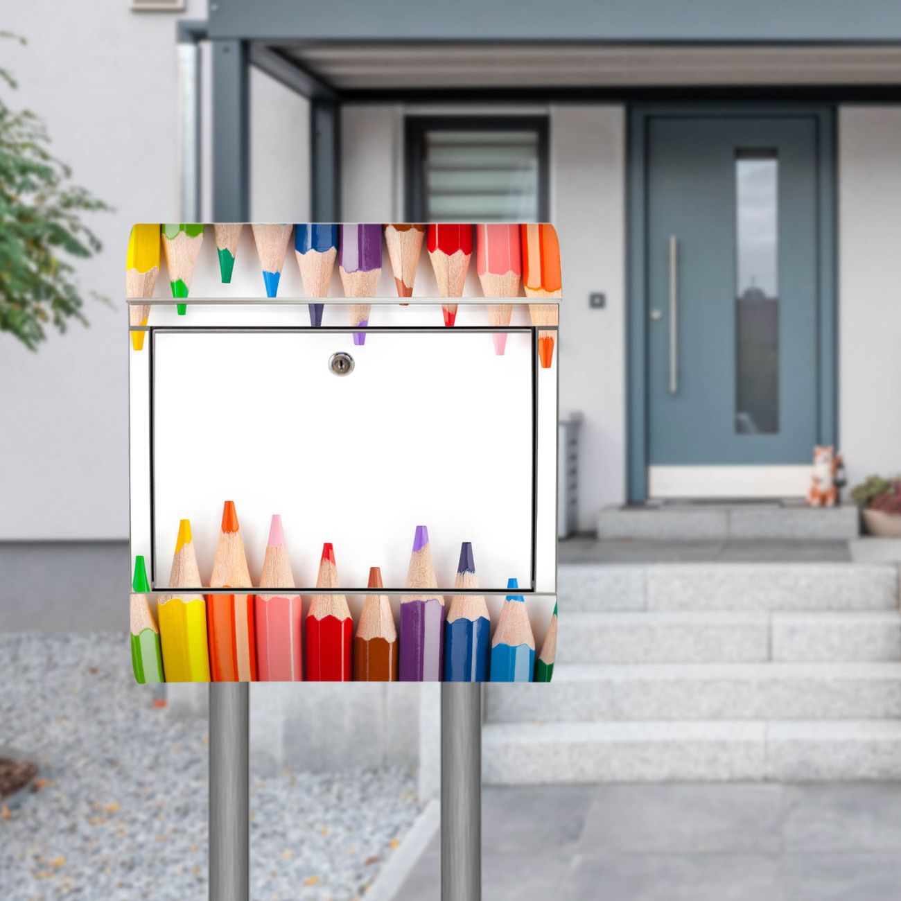 Der Motivstandbriefkasten hat ein sehr ansprechendes und ausgefallenes Design, damit entlocken Sie Ihren Nachbarn und dem Postboten ein Lächeln. Heben Sie Sich ab von der tristen grauen Masse, ohne auf Funktionalität zu verzichten. Der Briefkasten besteht aus hochwertigem 18/0 Edelstahl und die Wetter- und UV-resistenten Folie mit Buntstifte Motiv ist zusätzlich mit einem Schutzlaminat überzogen. Der Standbriefkasten wird mit Montagematerial und zwei Schlüsseln geliefert.