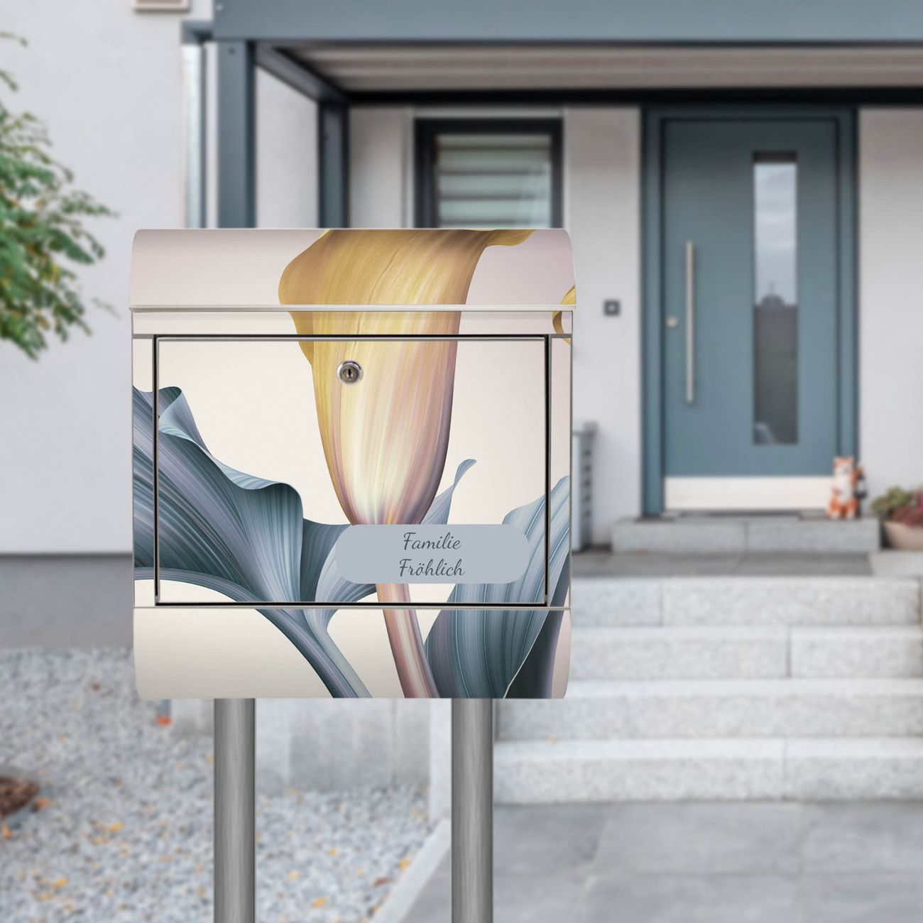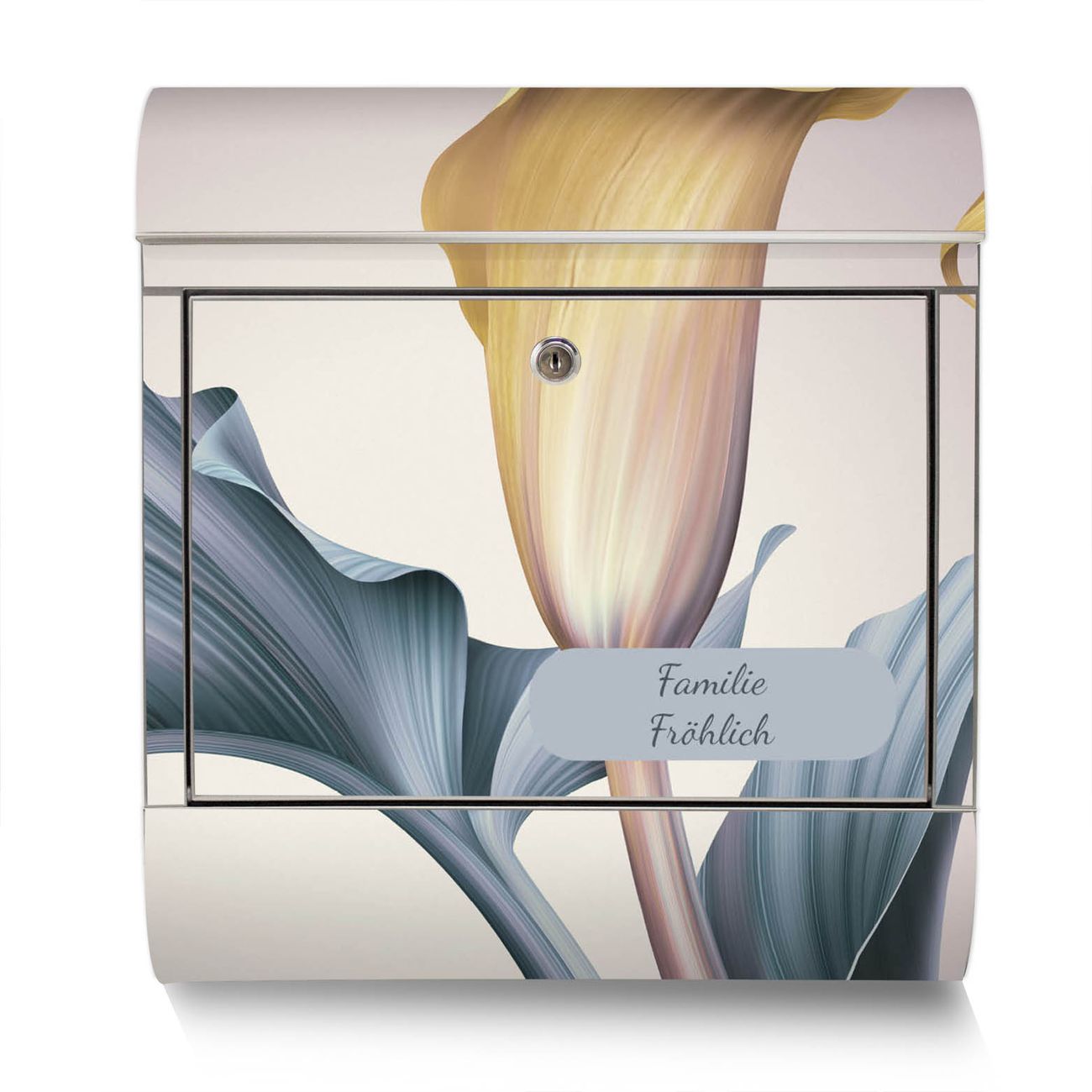 Der Motivstandbriefkasten hat ein sehr ansprechendes und ausgefallenes Design, damit entlocken Sie Ihren Nachbarn und dem Postboten ein Lächeln. Heben Sie Sich ab von der tristen grauen Masse, ohne auf Funktionalität zu verzichten. Der Briefkasten besteht aus hochwertigem 18/0 Edelstahl und die Wetter- und UV-resistenten Folie mit Calla Motiv ist zusätzlich mit einem Schutzlaminat überzogen. Der Standbriefkasten wird mit Montagematerial und zwei Schlüsseln geliefert.