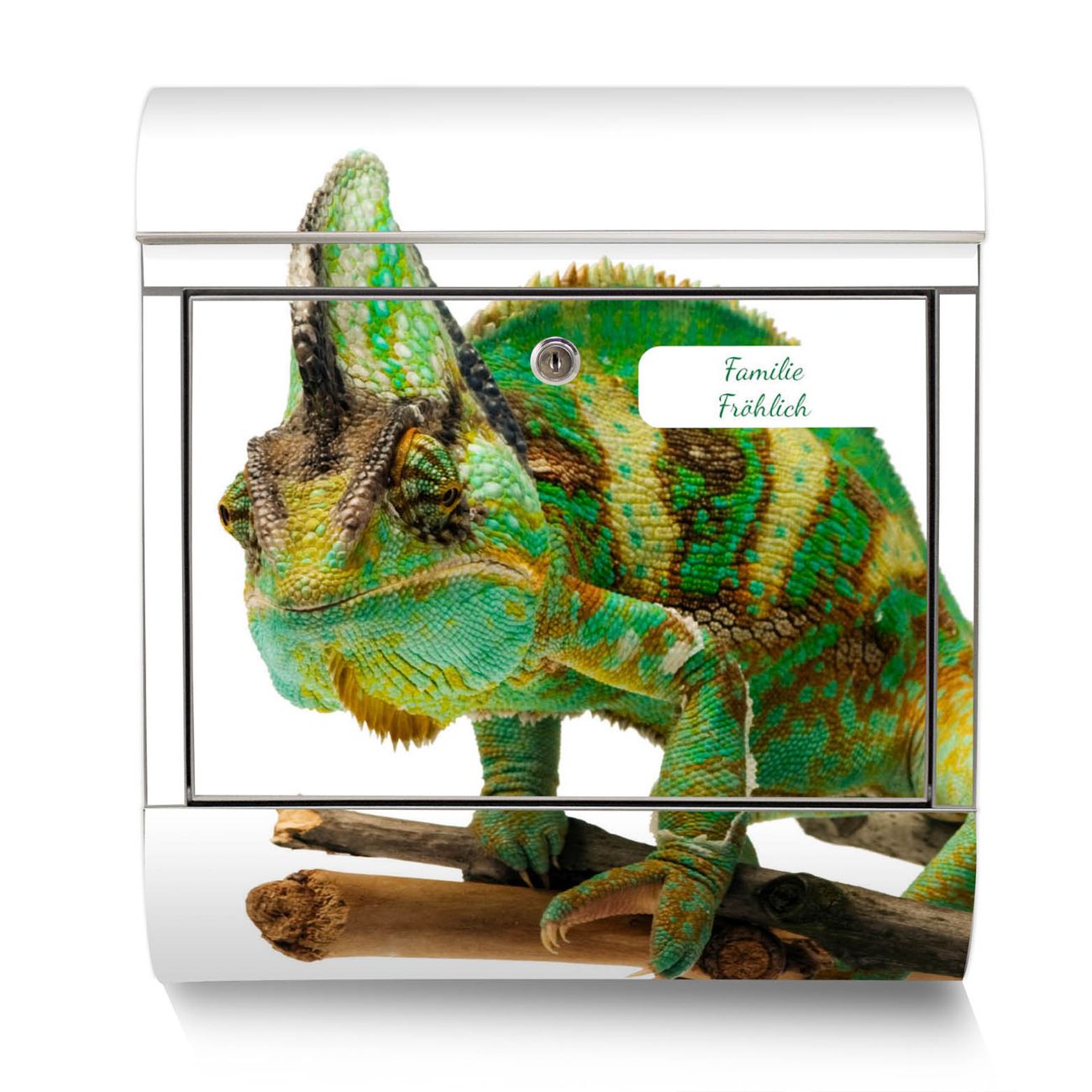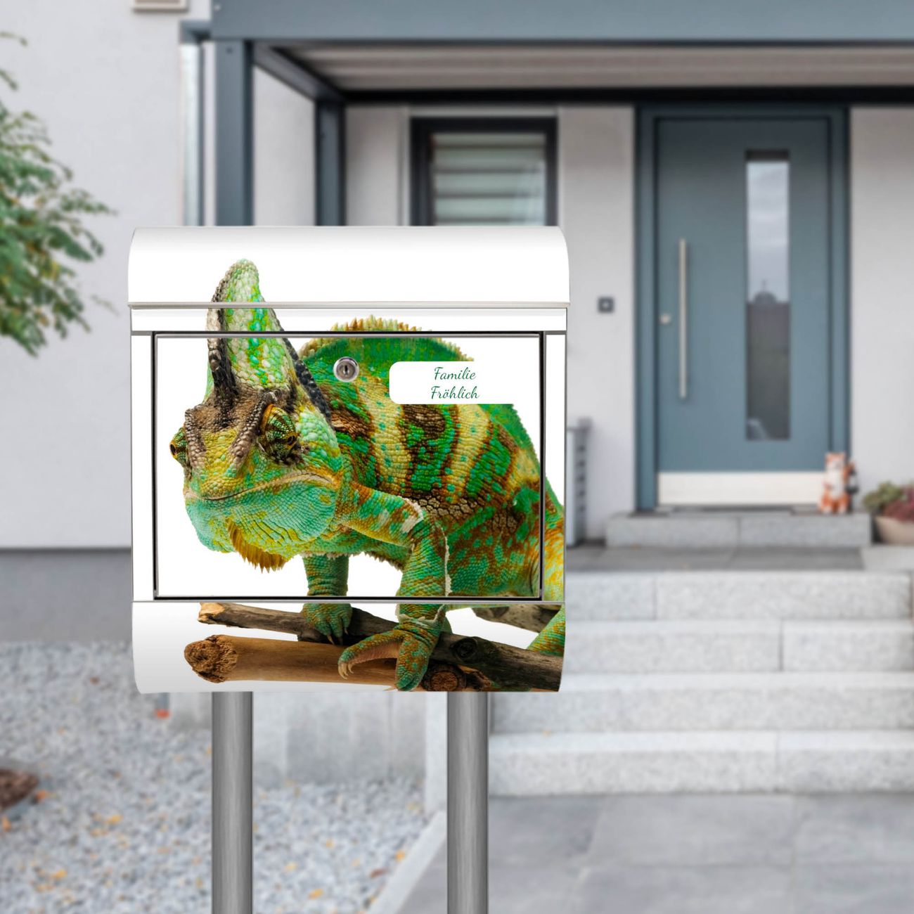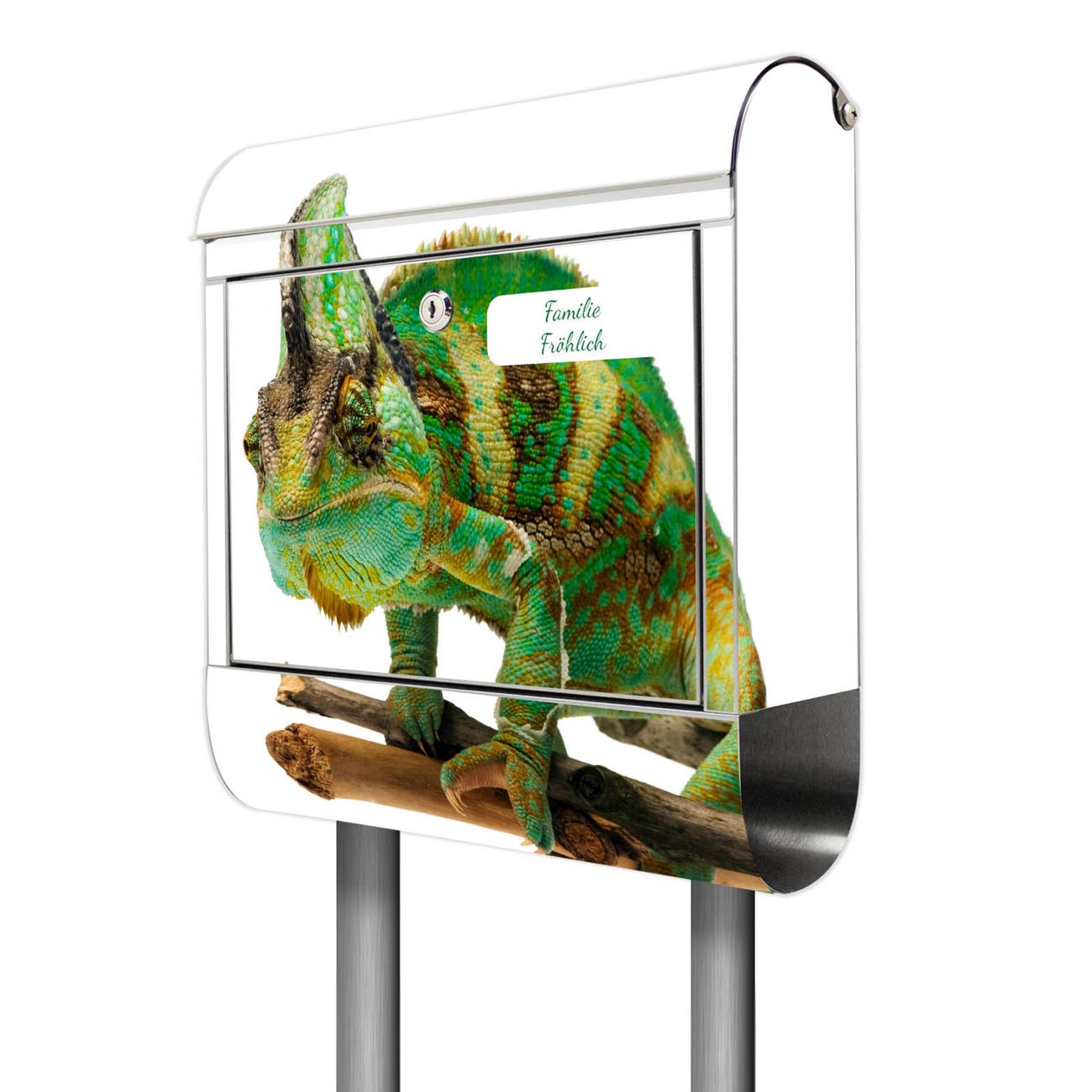 Der Motivstandbriefkasten hat ein sehr ansprechendes und ausgefallenes Design, damit entlocken Sie Ihren Nachbarn und dem Postboten ein Lächeln. Heben Sie Sich ab von der tristen grauen Masse, ohne auf Funktionalität zu verzichten. Der Briefkasten besteht aus hochwertigem 18/0 Edelstahl und die Wetter- und UV-resistenten Folie mit Chamäleon Motiv ist zusätzlich mit einem Schutzlaminat überzogen. Der Standbriefkasten wird mit Montagematerial und zwei Schlüsseln geliefert.