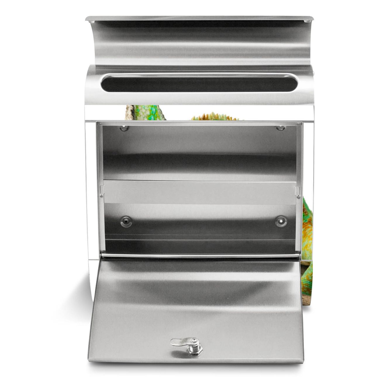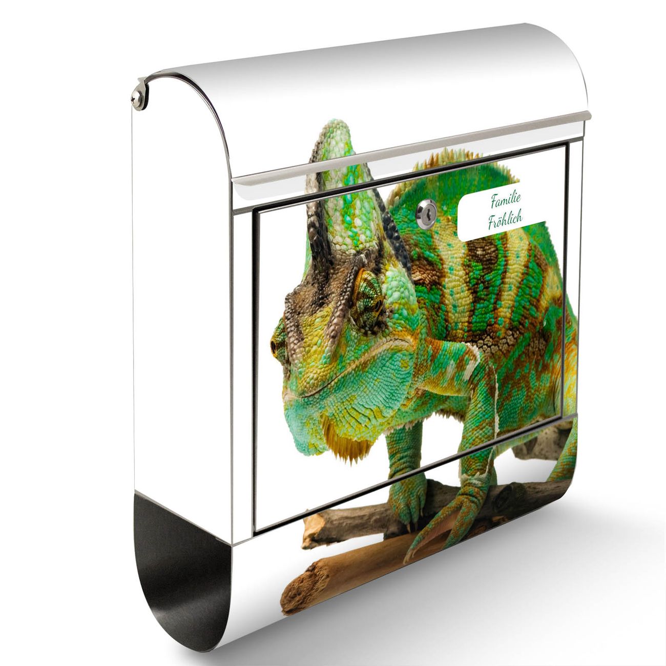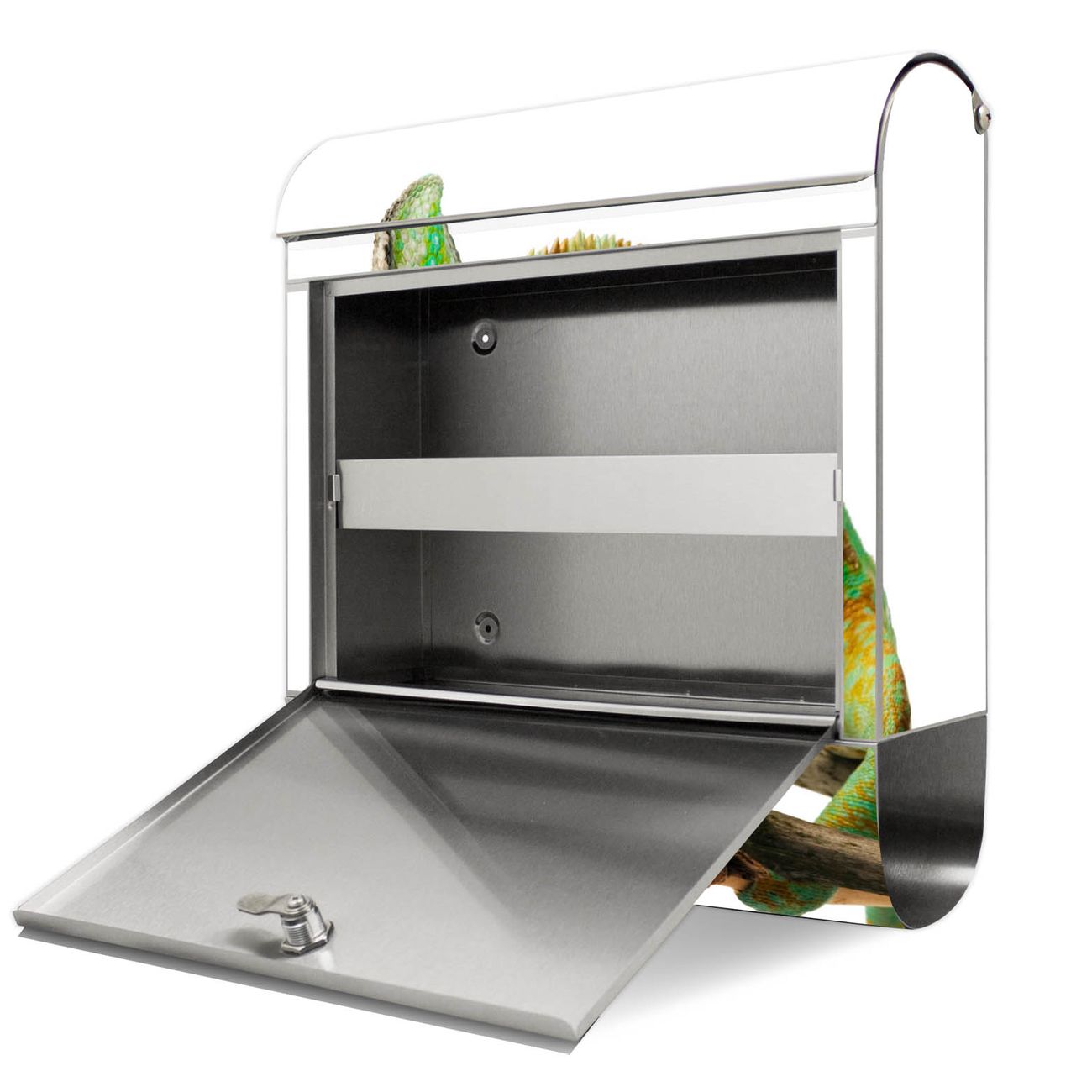 Der banjado Edelstahl Standbriefkasten mit Motiv Chamäleon und eigenem Wunschtext bietet Ihnen mit seinem Fassungsvermögen genügend Platz auch für große A4 Sendungen. Das integrierte Zeitungsfach eignet sich hervorragend, um unkompliziert die Tageszeitung zu fassen.