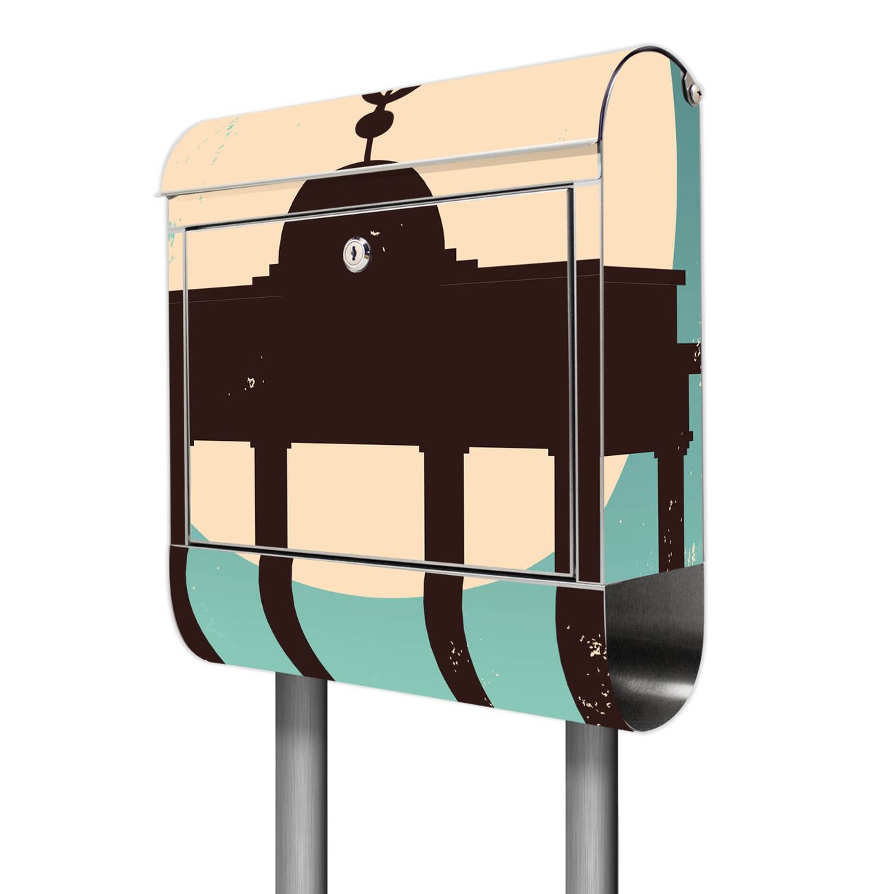 Der Motivstandbriefkasten hat ein sehr ansprechendes und ausgefallenes Design, damit entlocken Sie Ihren Nachbarn und dem Postboten ein Lächeln. Heben Sie Sich ab von der tristen grauen Masse, ohne auf Funktionalität zu verzichten. Der Briefkasten besteht aus hochwertigem 18/0 Edelstahl und die Wetter- und UV-resistenten Folie mit City Poster Berlin Motiv ist zusätzlich mit einem Schutzlaminat überzogen. Der Standbriefkasten wird mit Montagematerial und zwei Schlüsseln geliefert.