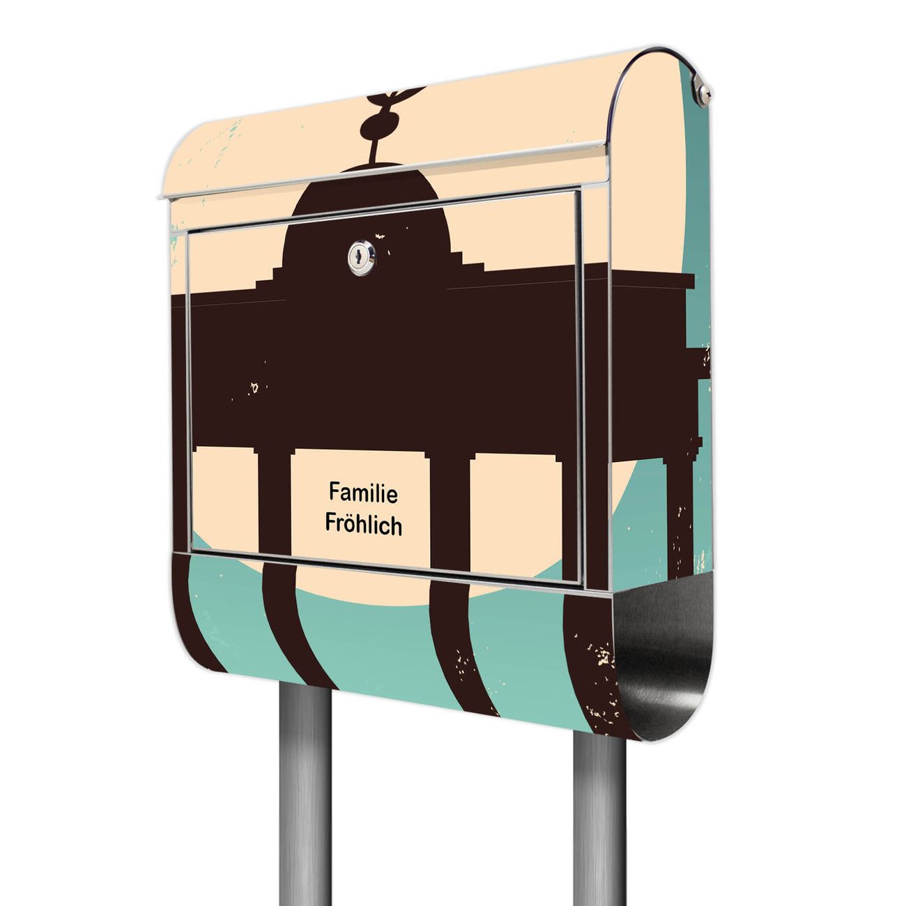 Der Motivstandbriefkasten hat ein sehr ansprechendes und ausgefallenes Design, damit entlocken Sie Ihren Nachbarn und dem Postboten ein Lächeln. Heben Sie Sich ab von der tristen grauen Masse, ohne auf Funktionalität zu verzichten. Der Briefkasten besteht aus hochwertigem 18/0 Edelstahl und die Wetter- und UV-resistenten Folie mit City Poster Berlin Motiv ist zusätzlich mit einem Schutzlaminat überzogen. Der Standbriefkasten wird mit Montagematerial und zwei Schlüsseln geliefert.
