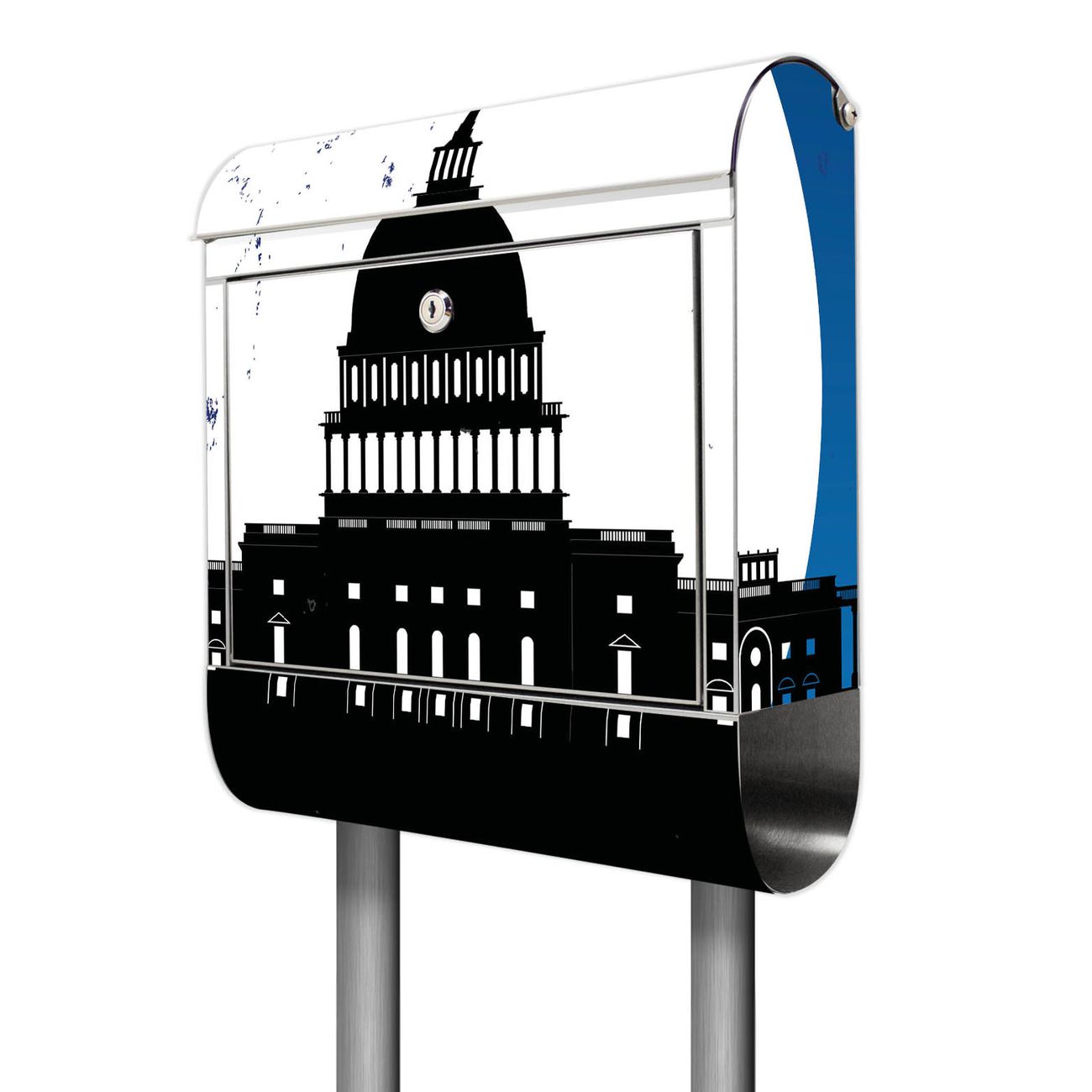 Der Motivstandbriefkasten hat ein sehr ansprechendes und ausgefallenes Design, damit entlocken Sie Ihren Nachbarn und dem Postboten ein Lächeln. Heben Sie Sich ab von der tristen grauen Masse, ohne auf Funktionalität zu verzichten. Der Briefkasten besteht aus hochwertigem 18/0 Edelstahl und die Wetter- und UV-resistenten Folie mit City Poster Washington Motiv ist zusätzlich mit einem Schutzlaminat überzogen. Der Standbriefkasten wird mit Montagematerial und zwei Schlüsseln geliefert.