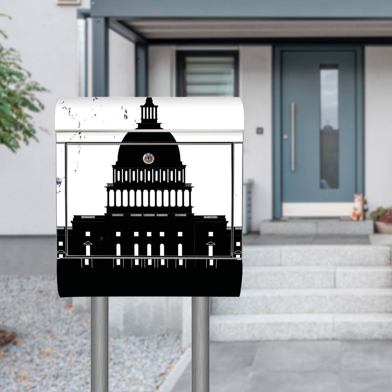 Der banjado Edelstahl Standbriefkasten mit Motiv City Poster Washington bietet Ihnen mit seinem Fassungsvermögen genügend Platz auch für große A4 Sendungen. Das integrierte Zeitungsfach eignet sich hervorragend, um unkompliziert die Tageszeitung zu fassen.